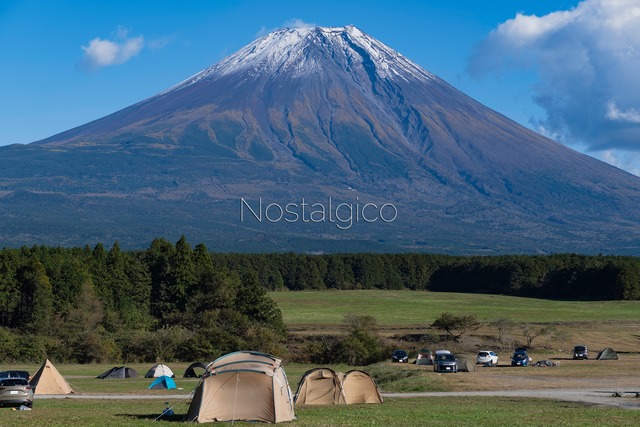 雪化粧を纏う雄大な富士山を正面に望む秋のキャンプ場