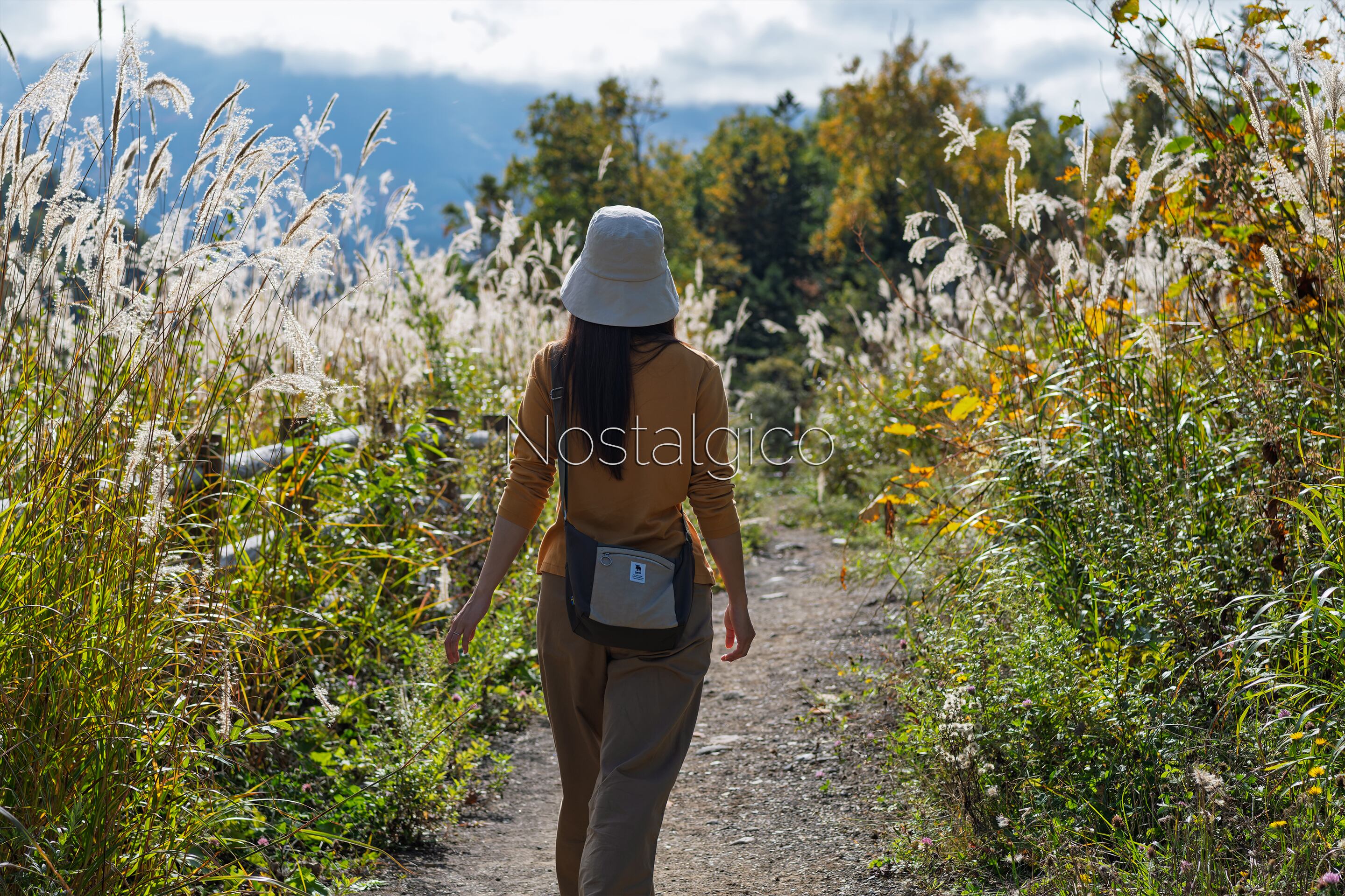 秋のススキの小道を歩く女性の後ろ姿を捉えた美しい写真素材です。この作品は、穏やかな秋の風景と女性の優雅な佇まいを丁寧に表現し、見る人にその静謐な瞬間と心の安らぎを感じさせます。ススキが風に揺れる様子は、さまざまなプロジェクトでの活用に最適です。