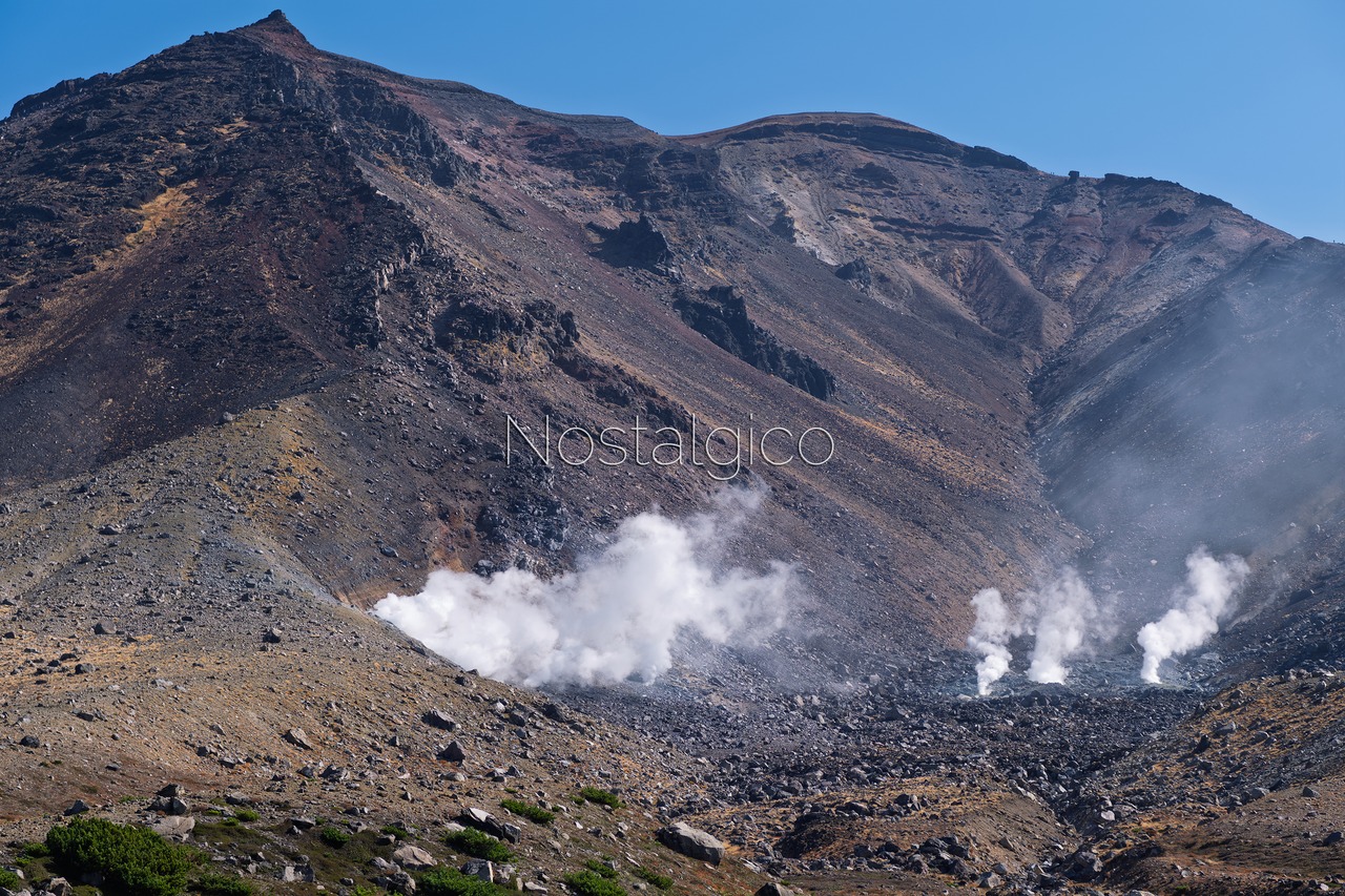 噴気孔から煙が上る旭岳のアップを捉えた壮大な写真素材です。この作品は、大自然の力強さと神秘を感じさせる瞬間を余すところなく表現しており、見る人に迫る自然の息吹を感じさせる魅力的な一枚です。旭岳の壮大な光景は、さまざまなプロジェクトでの活用に最適です。