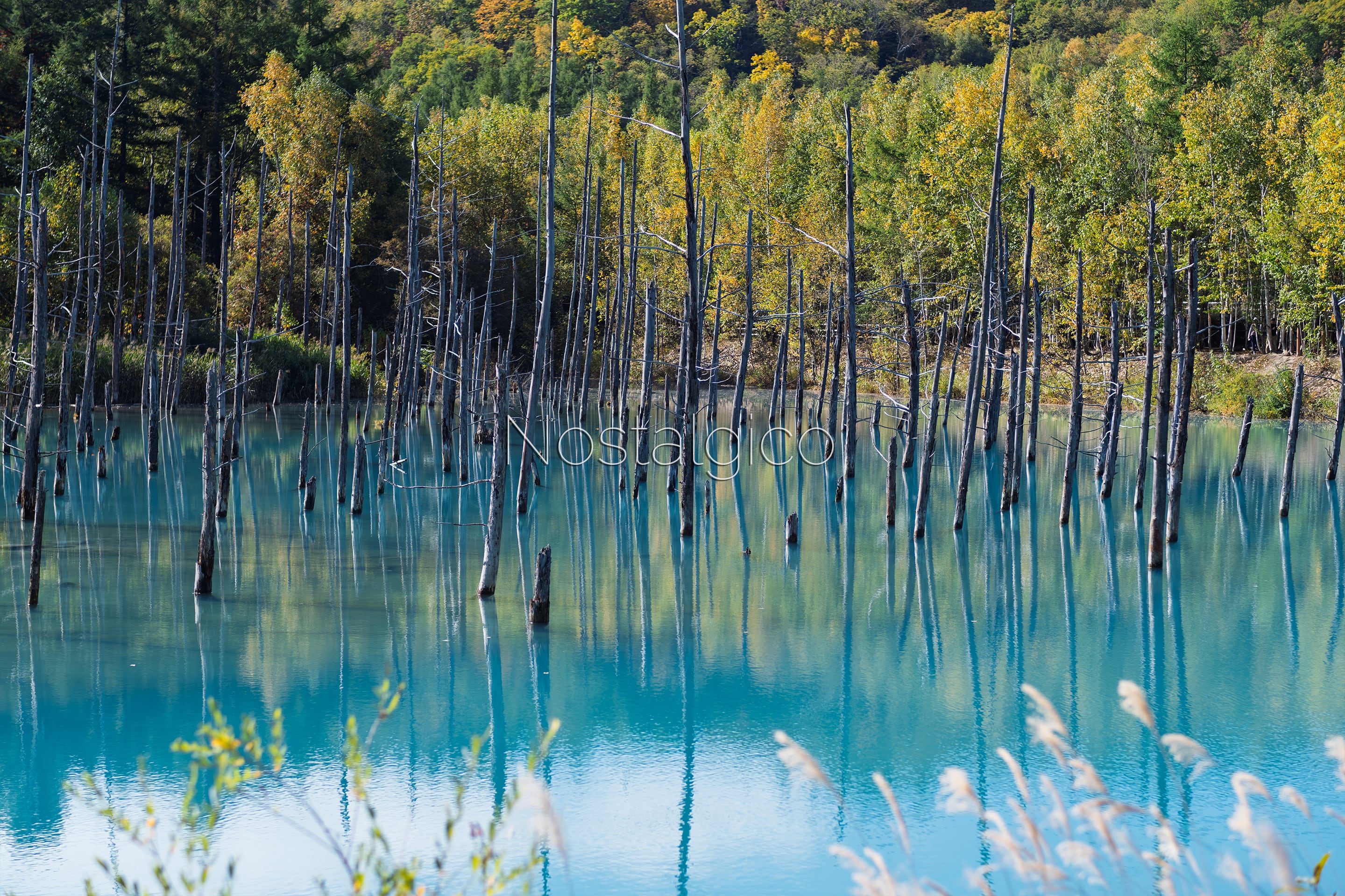 立ち枯れのカラマツと不思議なほど青い色をたたえる青い池(美瑛町白金)