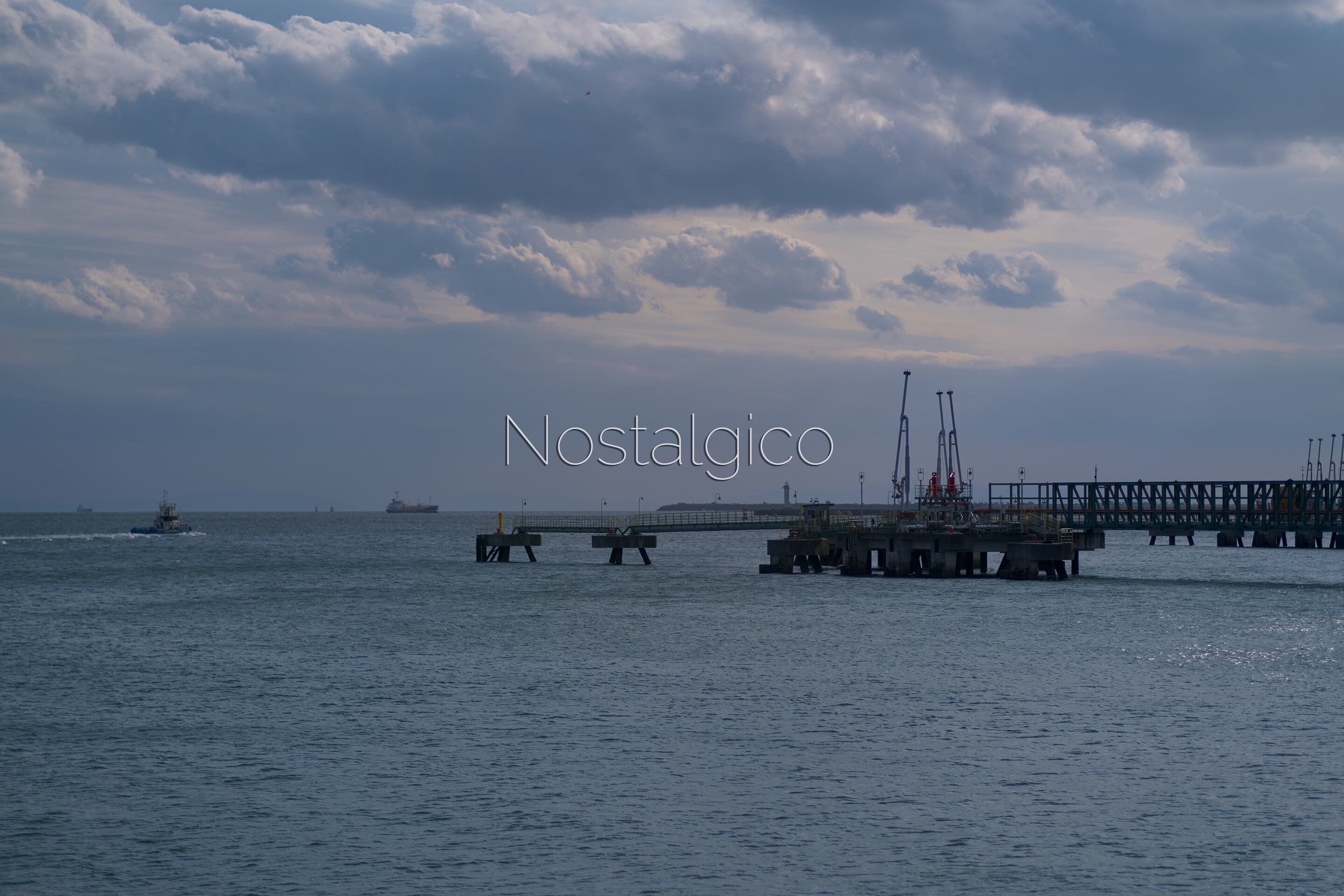 澄み渡る青空の下、三重県四日市の工業地帯と海のダイナミックな風景を捉えた魅力的な写真素材です。分厚い雲が空を覆う曇天の下、静かな海上に伸びる桟橋(埠頭)を捉えた風景です。左手には小型の船が航行し、水平線には大型船のシルエットが見えます。重厚な工業的な構造物が海と空の間に存在感を放ち、無機質でどこか寂しげな雰囲気を醸し出しています。重く落ち着いたトーンは、環境問題やインフラ、工業製品などのテーマを表現したいコンテンツに最適です。