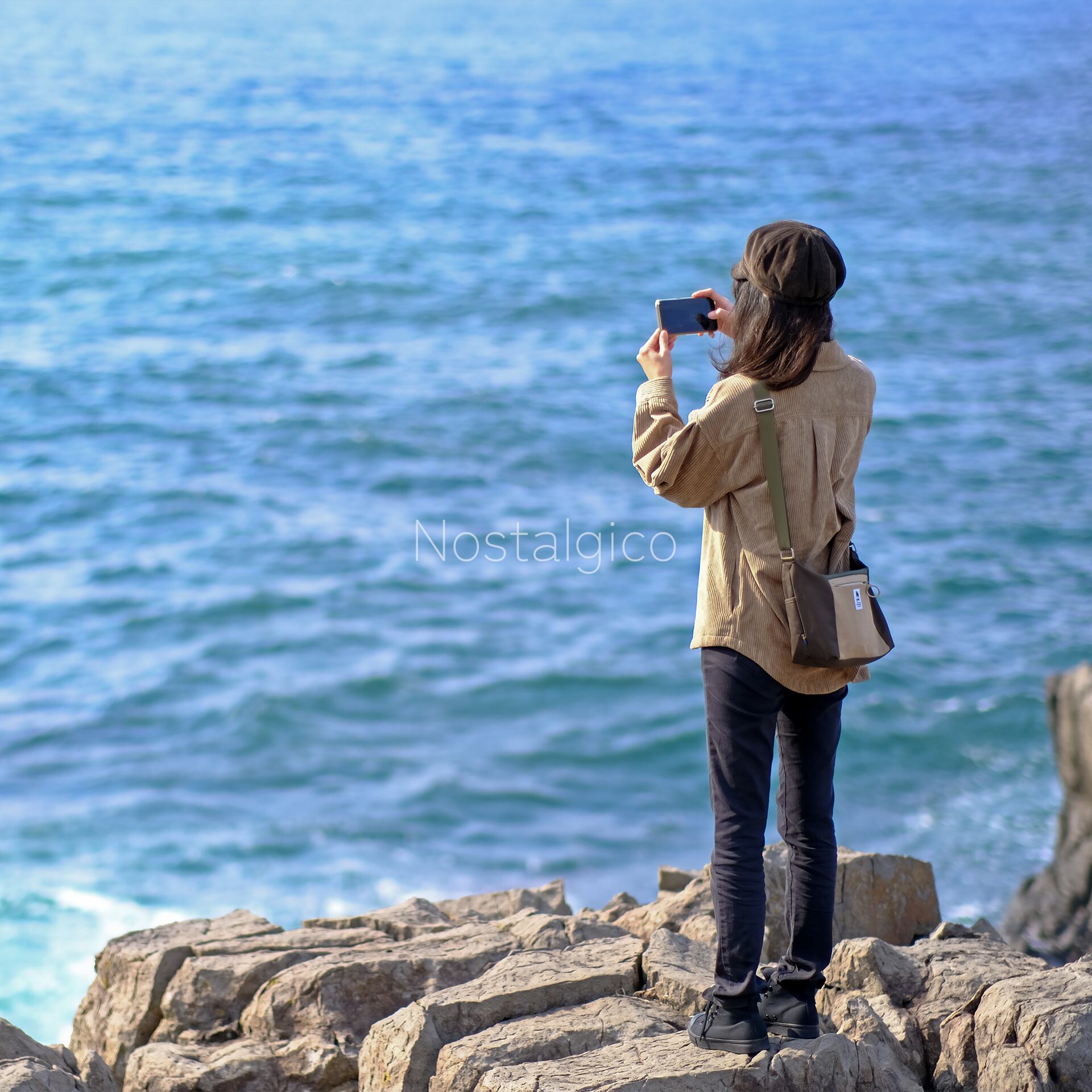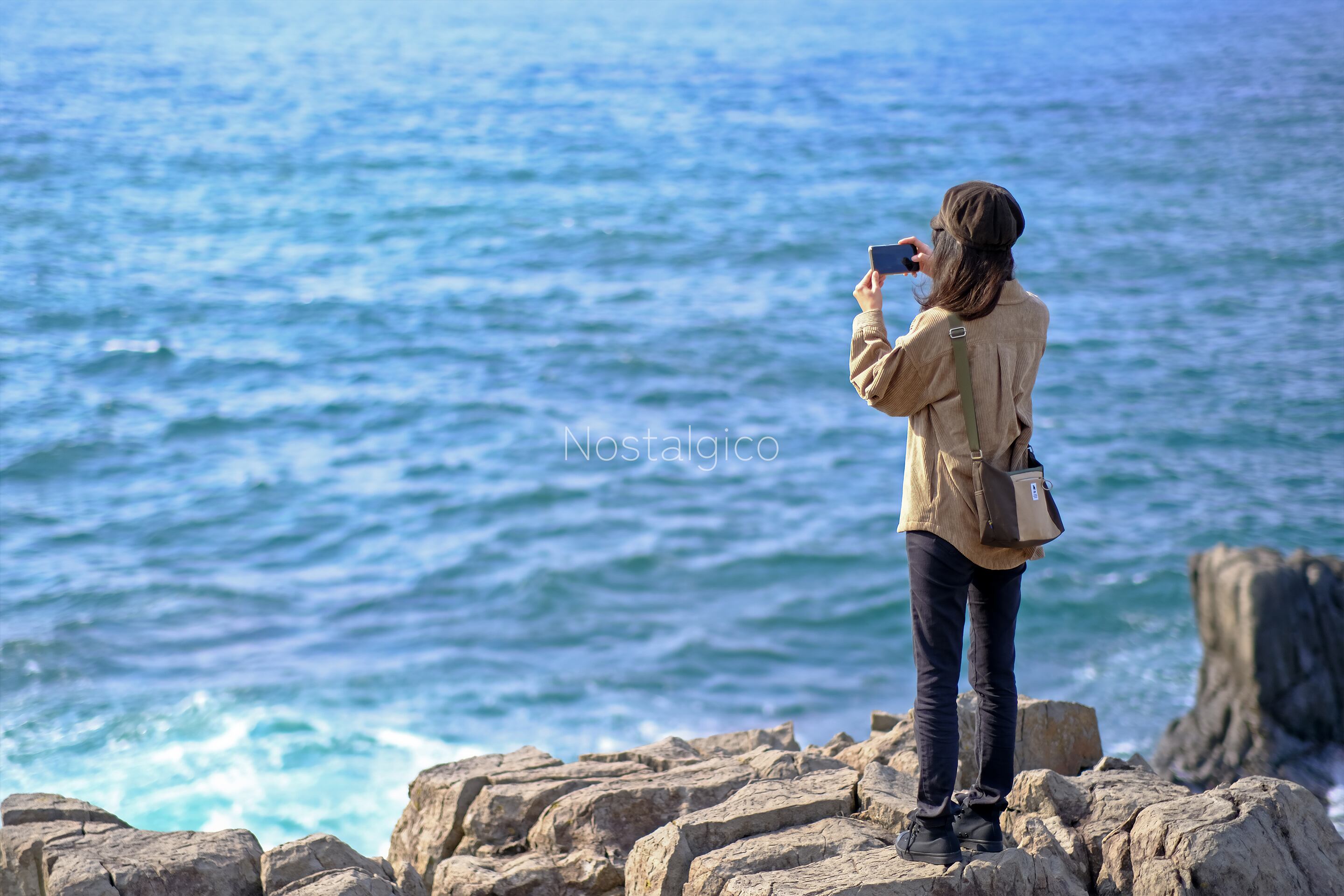 秋の海を崖の上から写真を撮っている女性の写真です。福井県 越前海岸で撮影しています。