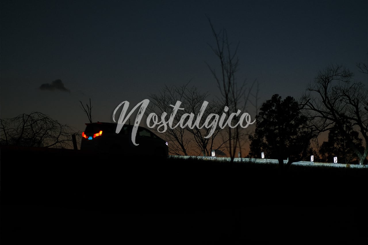 秋・冬の日没後の道路を一台の車がライトを点けて走っている場面を捉えた写真です。どこか切なく、美しい雰囲気を感じられます。車の明かりが、ガードレールを照らし出しています。