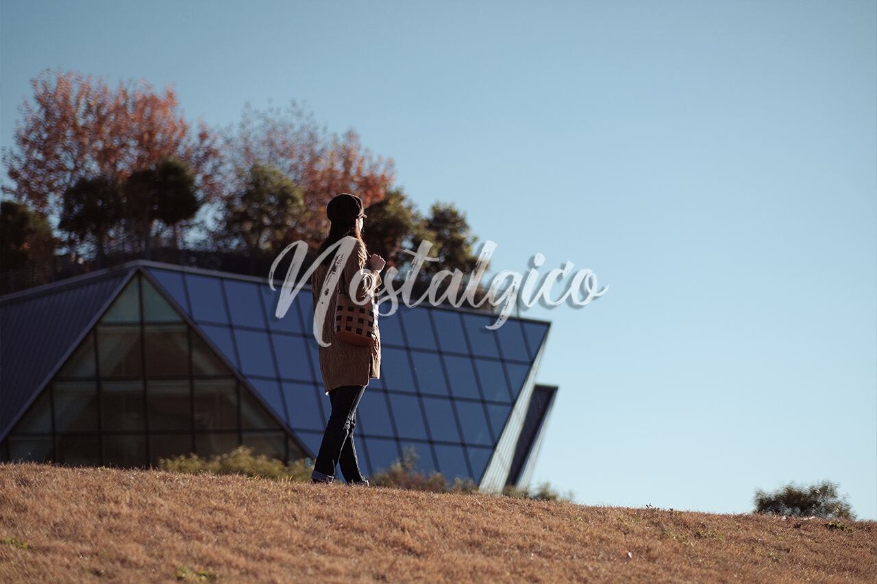 秋晴れの青空をバックに土手を歩く女性の写真です。季節感のある青空と秋の温かみのある日差しの中で、女性が歩く姿を切り取った写真素材です。