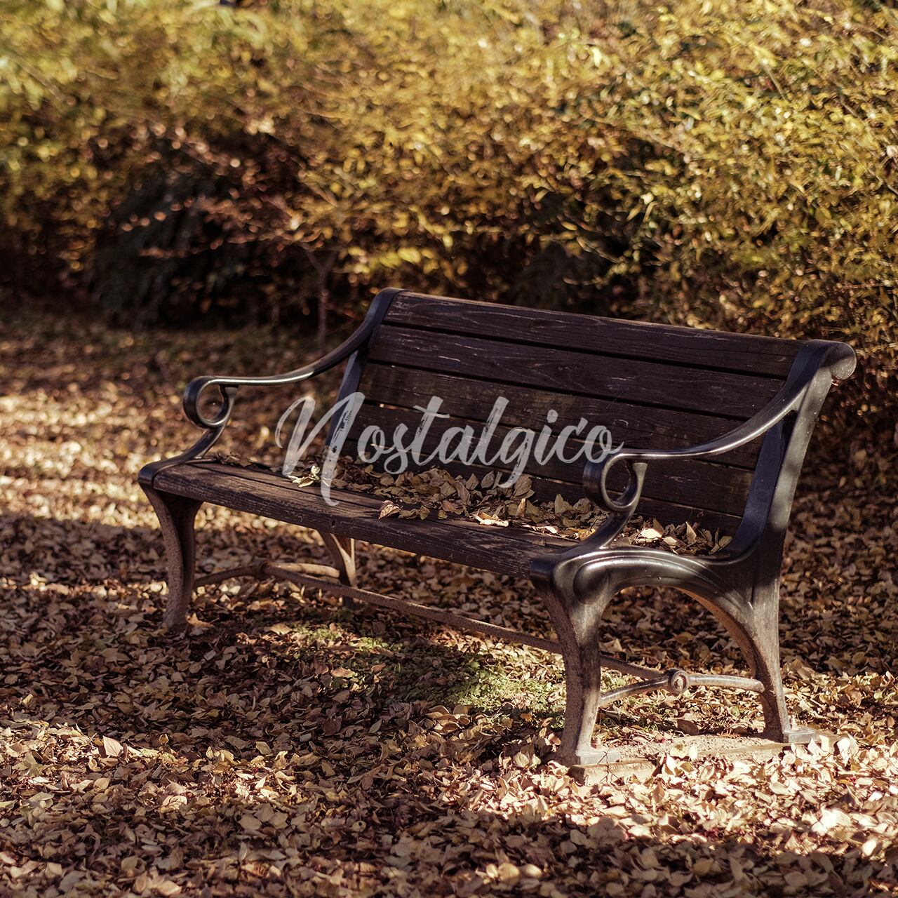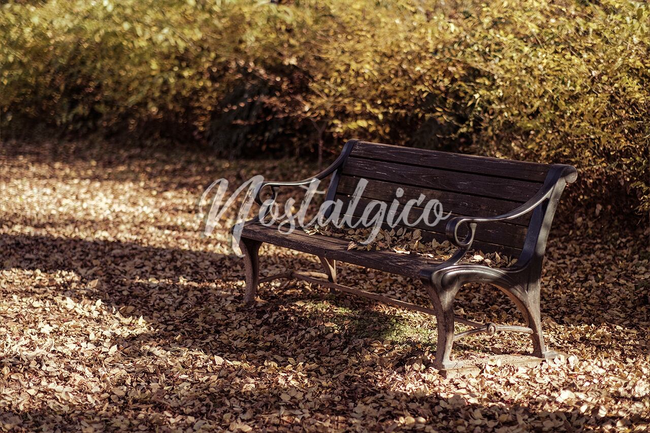 枯れ葉が積もる公園のベンチの写真です。秋の温かい日差しがベンチと落ち葉に注がれて美しい景色を作り出しています。