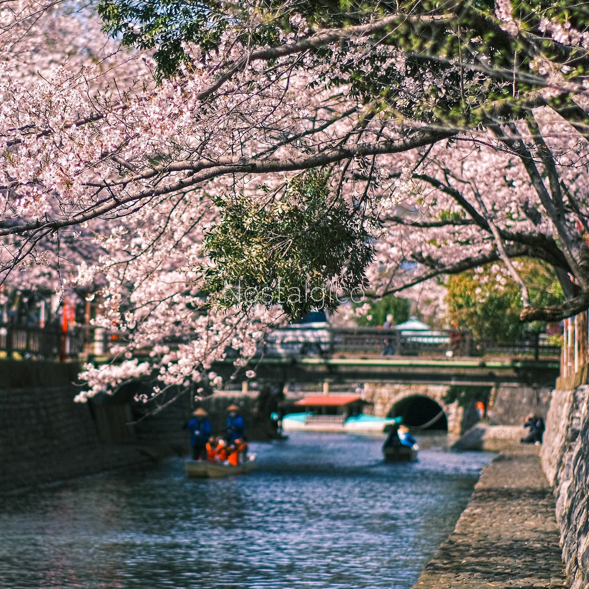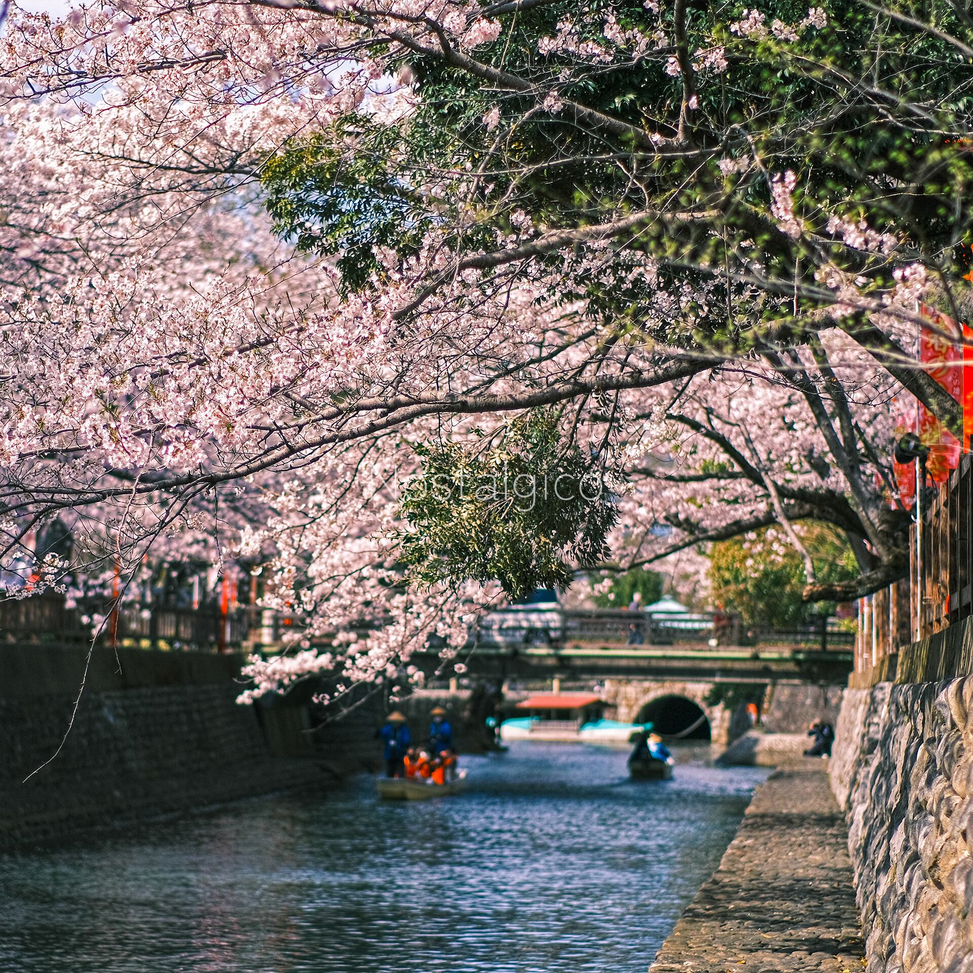 春の桜が舞い散る水門川の写真です。奥の細道むすびの地として知られている場所です。