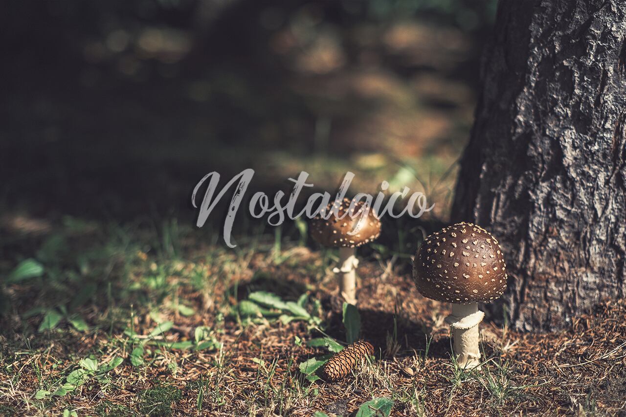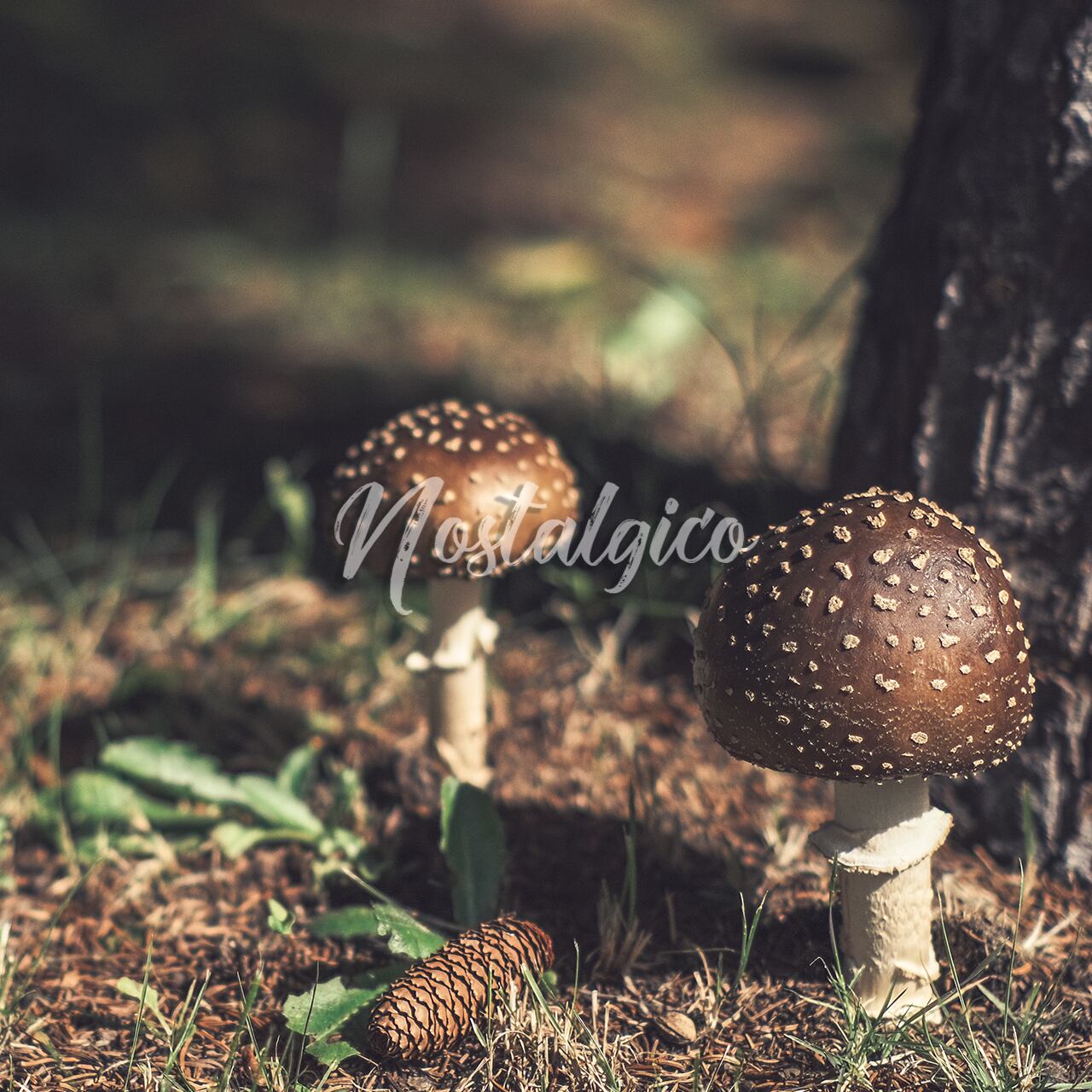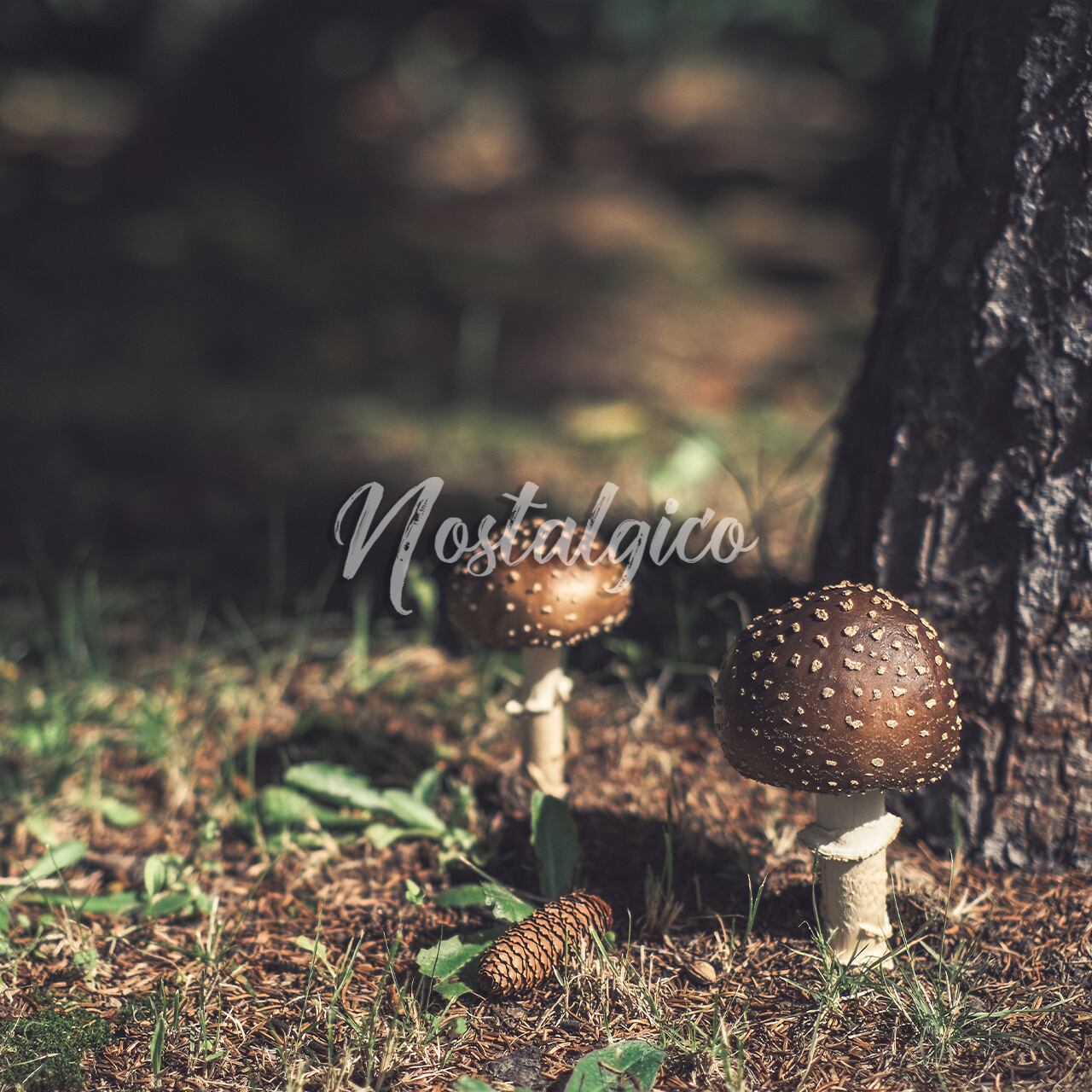 木陰にひっそりと生えているかわいいキノコの写真です。季節は秋です。