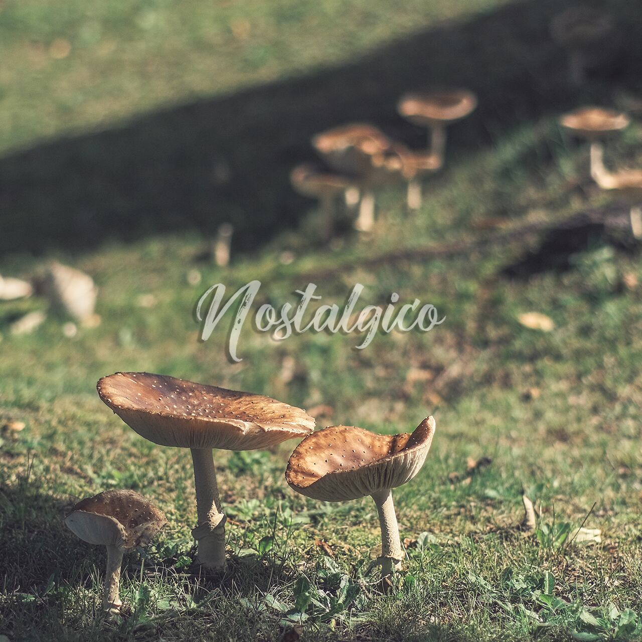 木陰にひっそりと生えているキノコの写真です。季節は秋です。