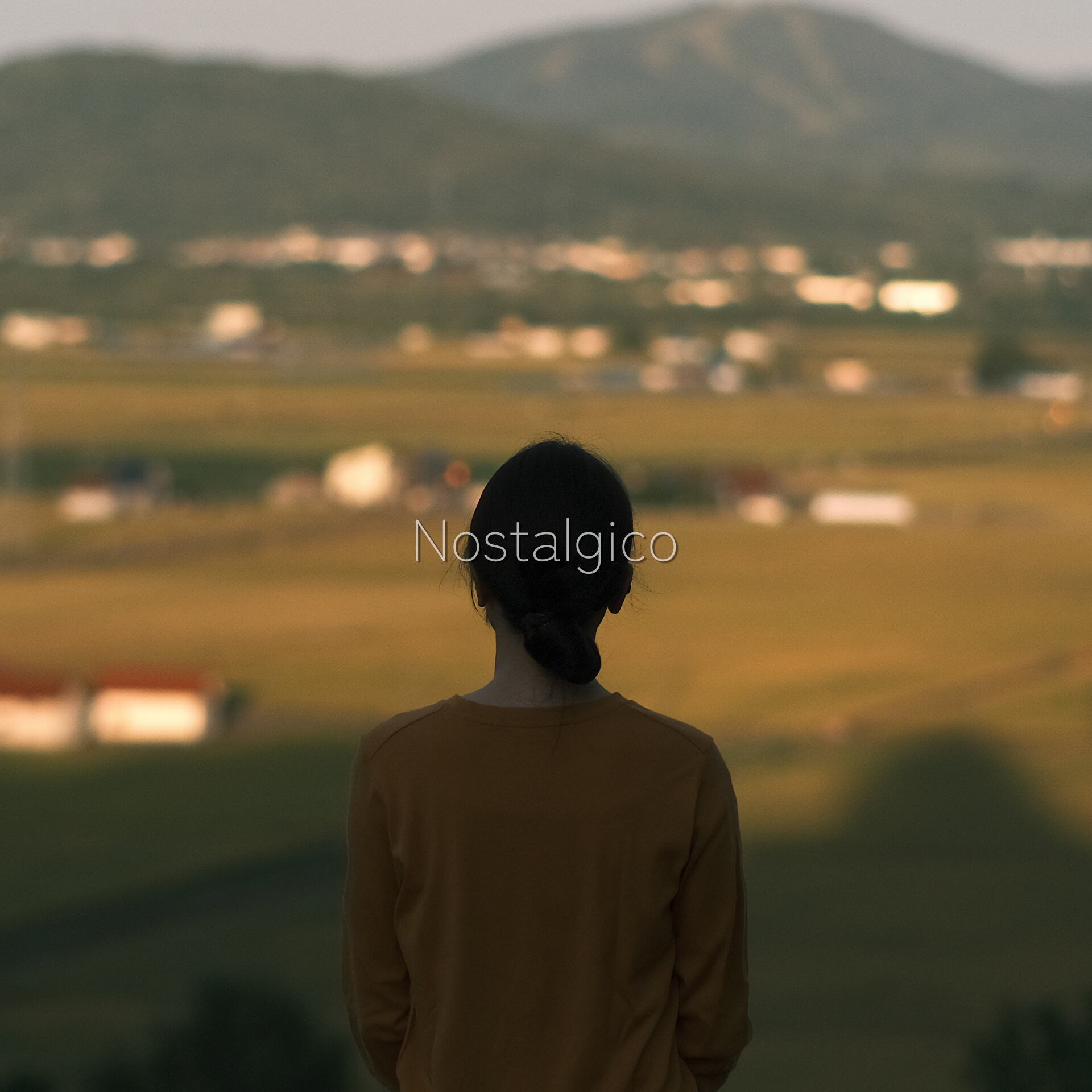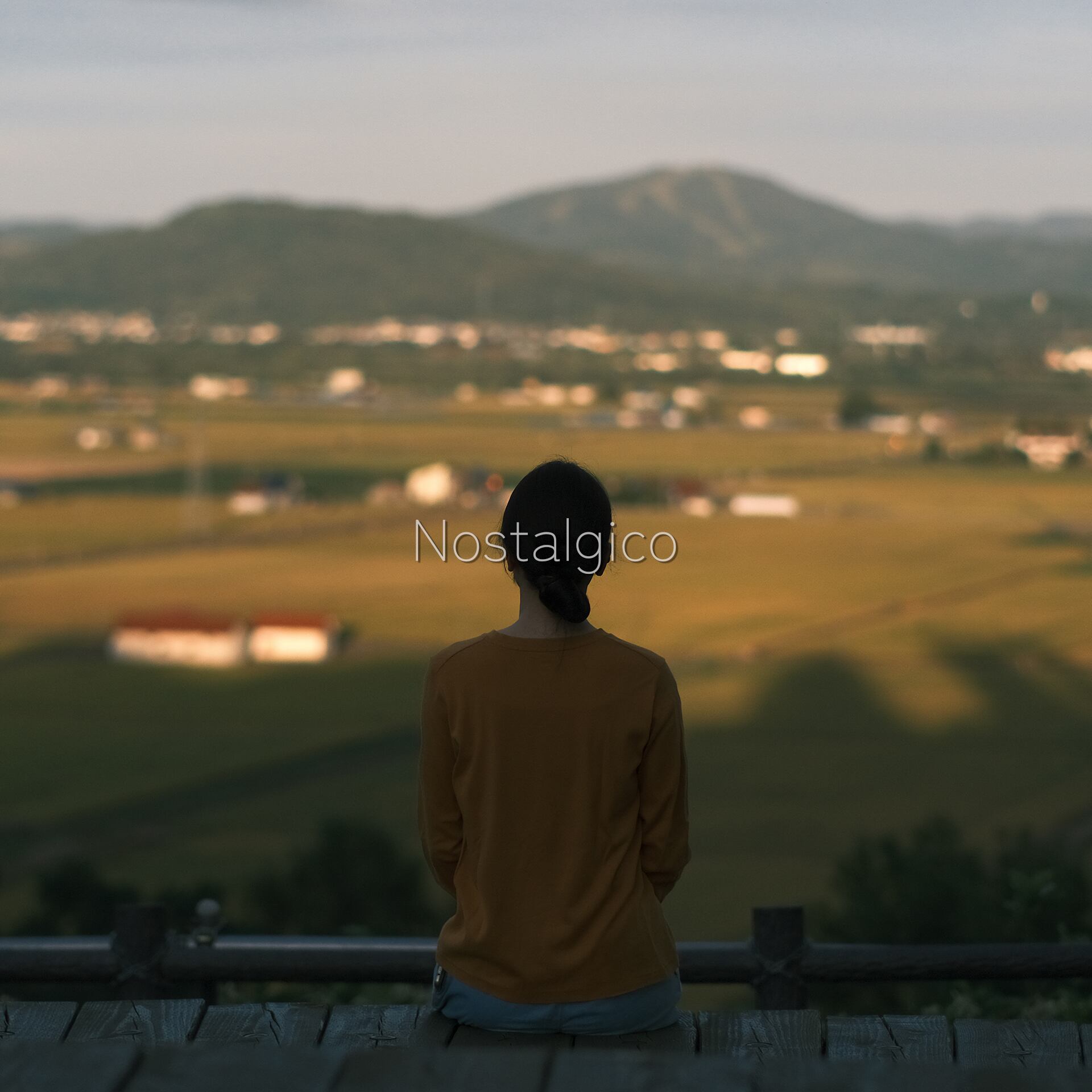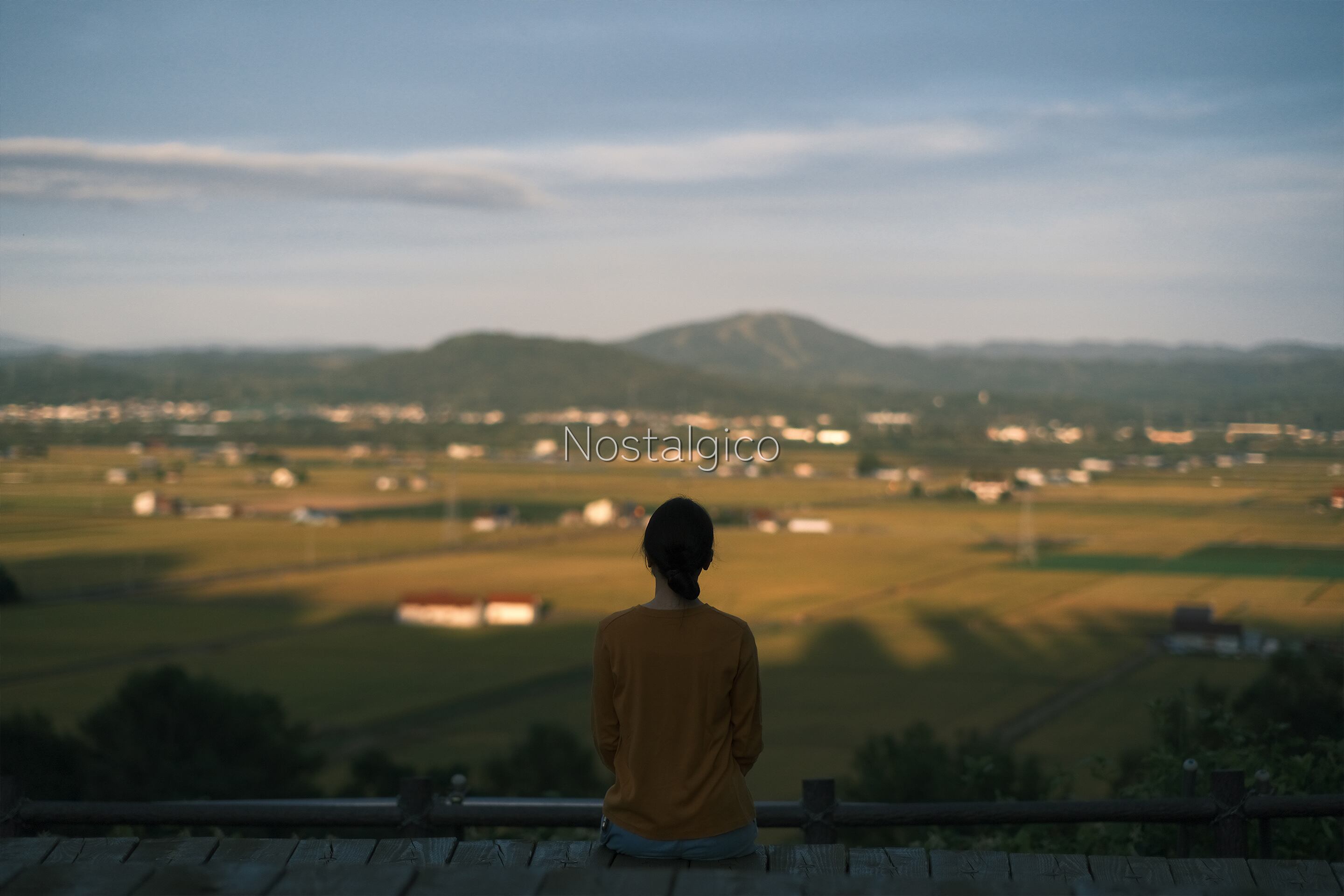 展望台から夕方の田園風景を眺める女性の写真です。季節は秋です。