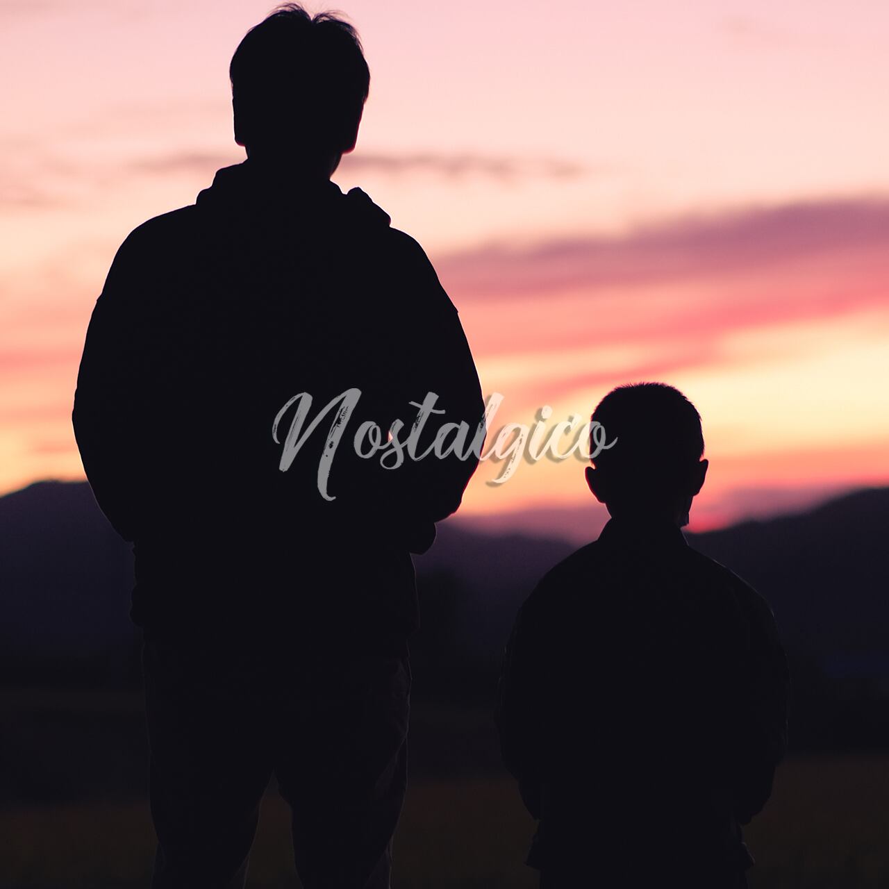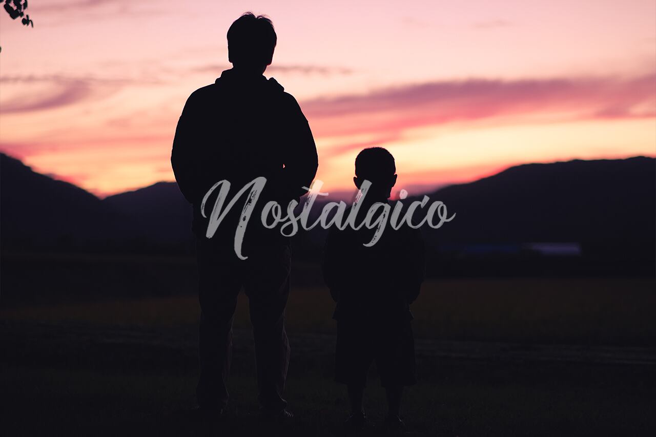 夕焼けを眺める父親と息子の写真です。季節は秋です。