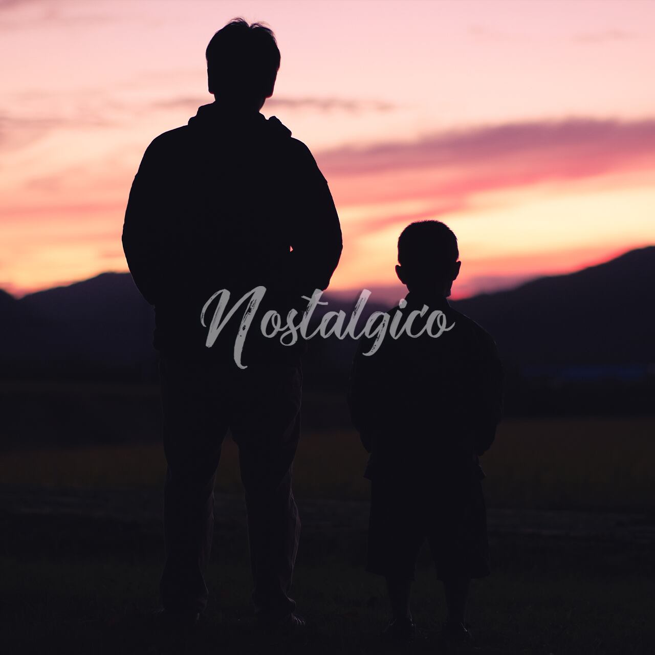 夕焼けを眺める父親と息子