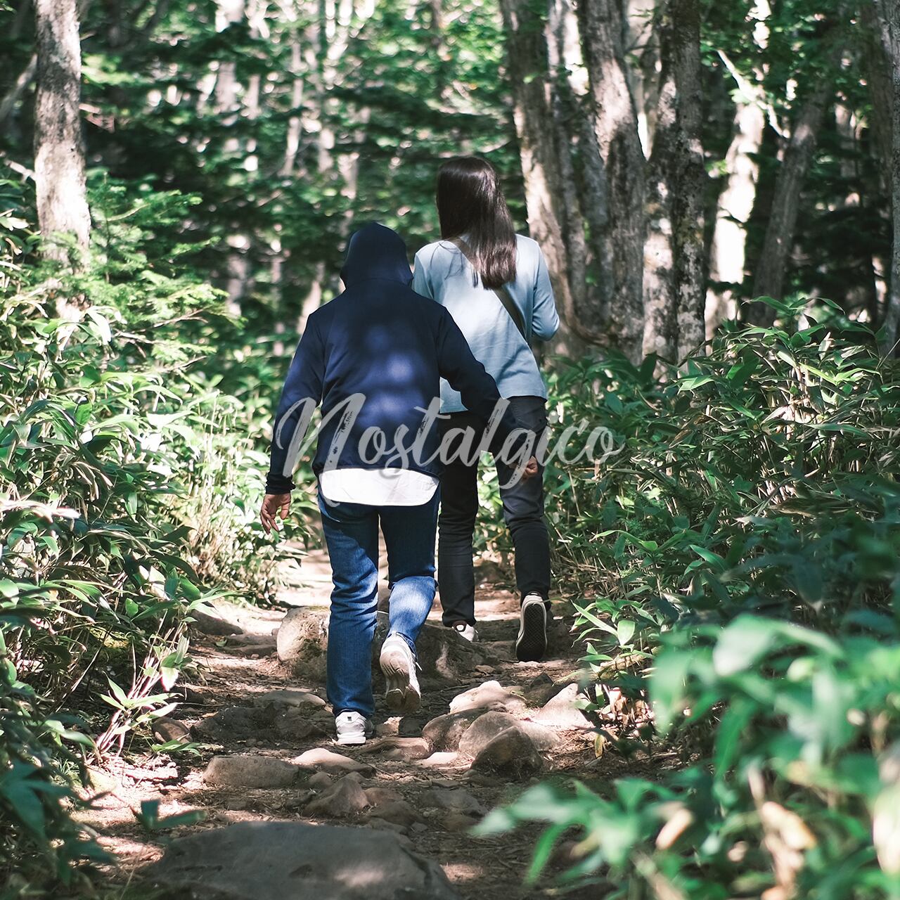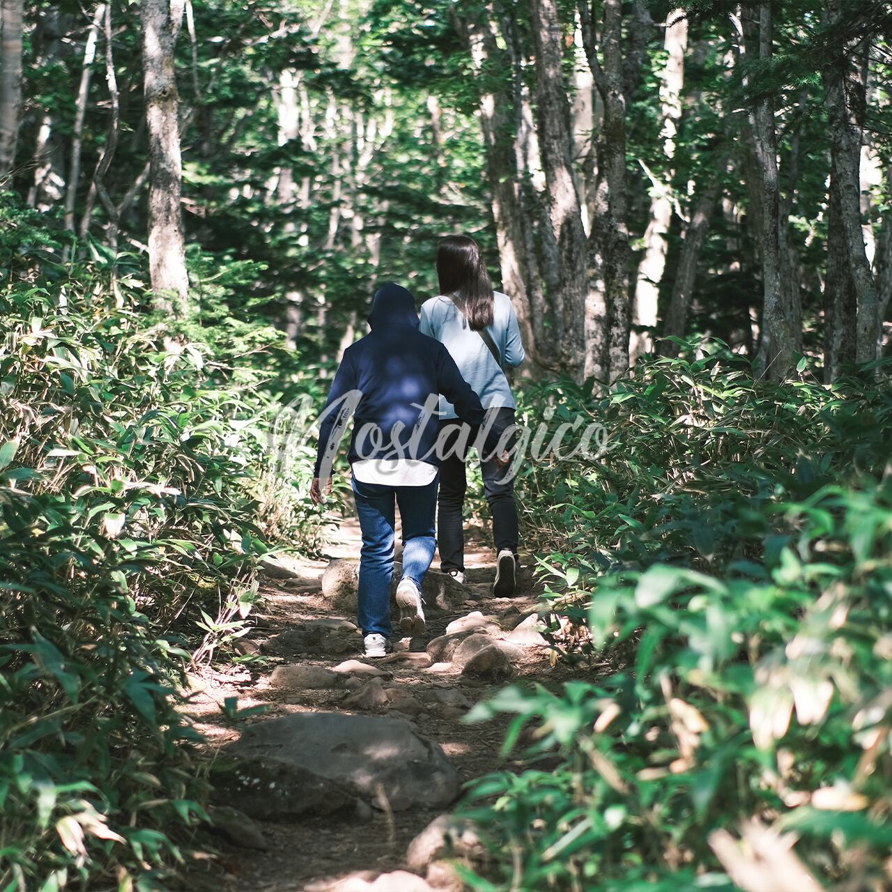 森の散策路を歩く2人(北海道知床五湖)の写真です。季節は夏・秋です。