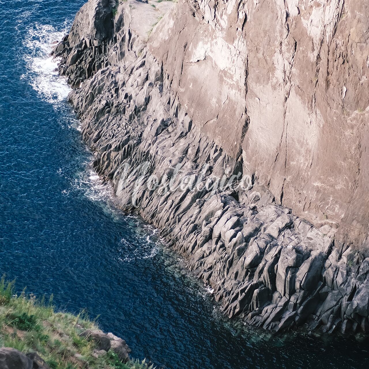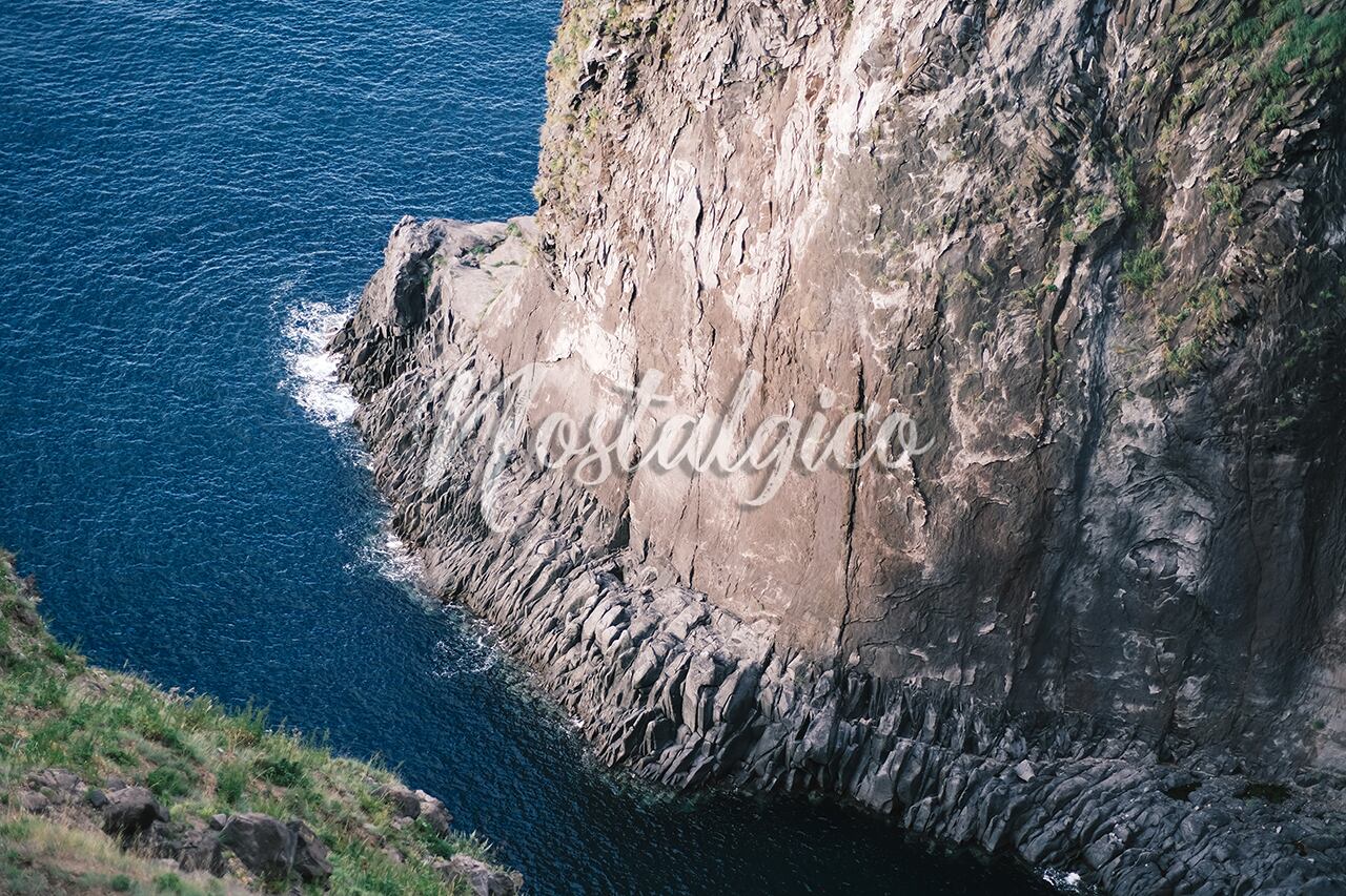 海がある風景写真です。真っ青な海と険しい岩肌が印象的です。
