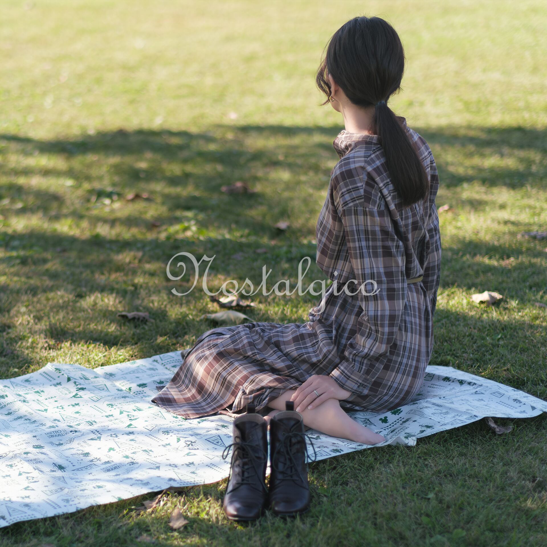 この写真素材は、秋の公園でのんびりと過ごす女性の後ろ姿を捉えたものです。女性はレジャーシートに座っており、周囲の草木は秋の陽光に輝き、優しい木漏れ日が降り注いでいます。この秋の穏やかな写真素材は、自然との調和や、リラックスした雰囲気を表現しています。