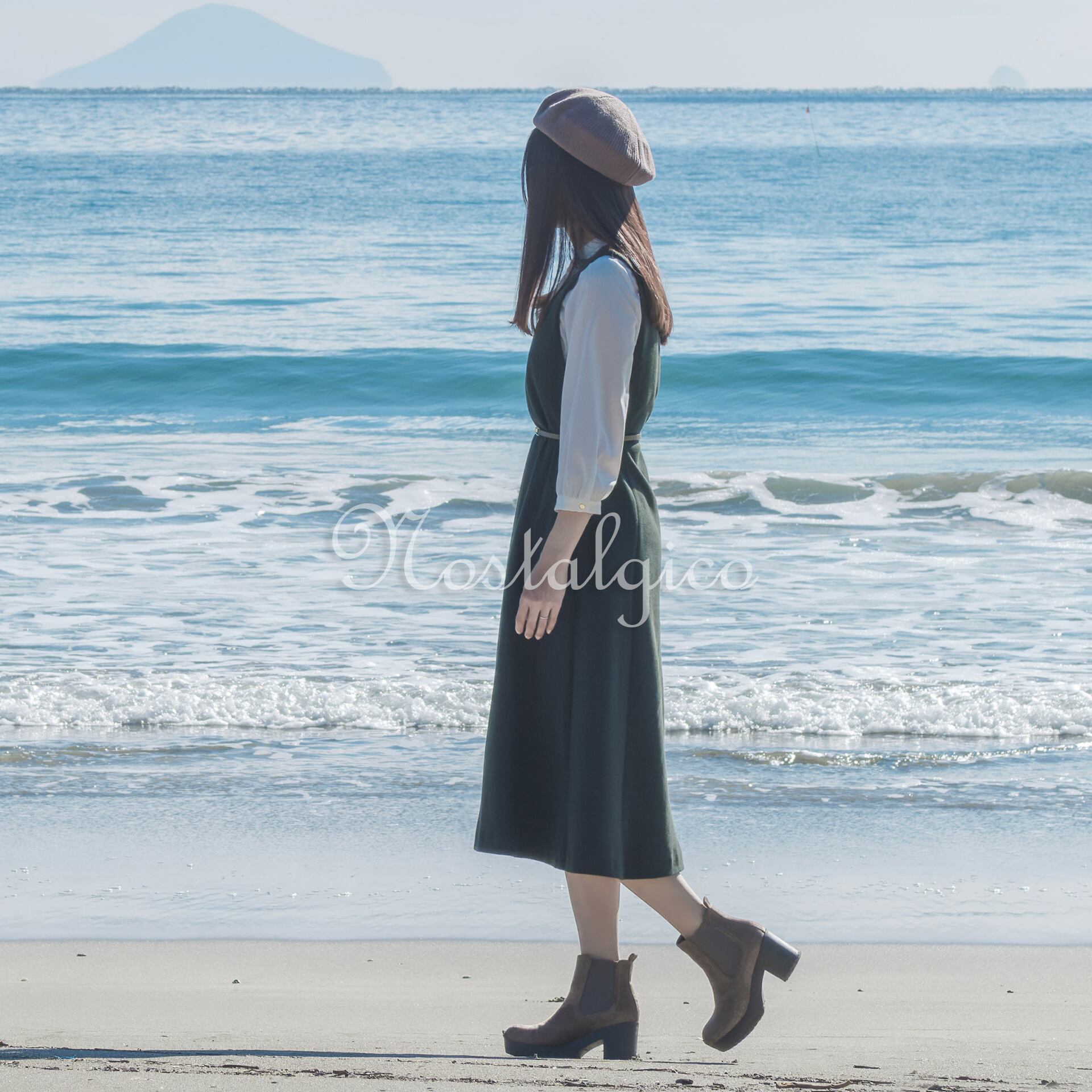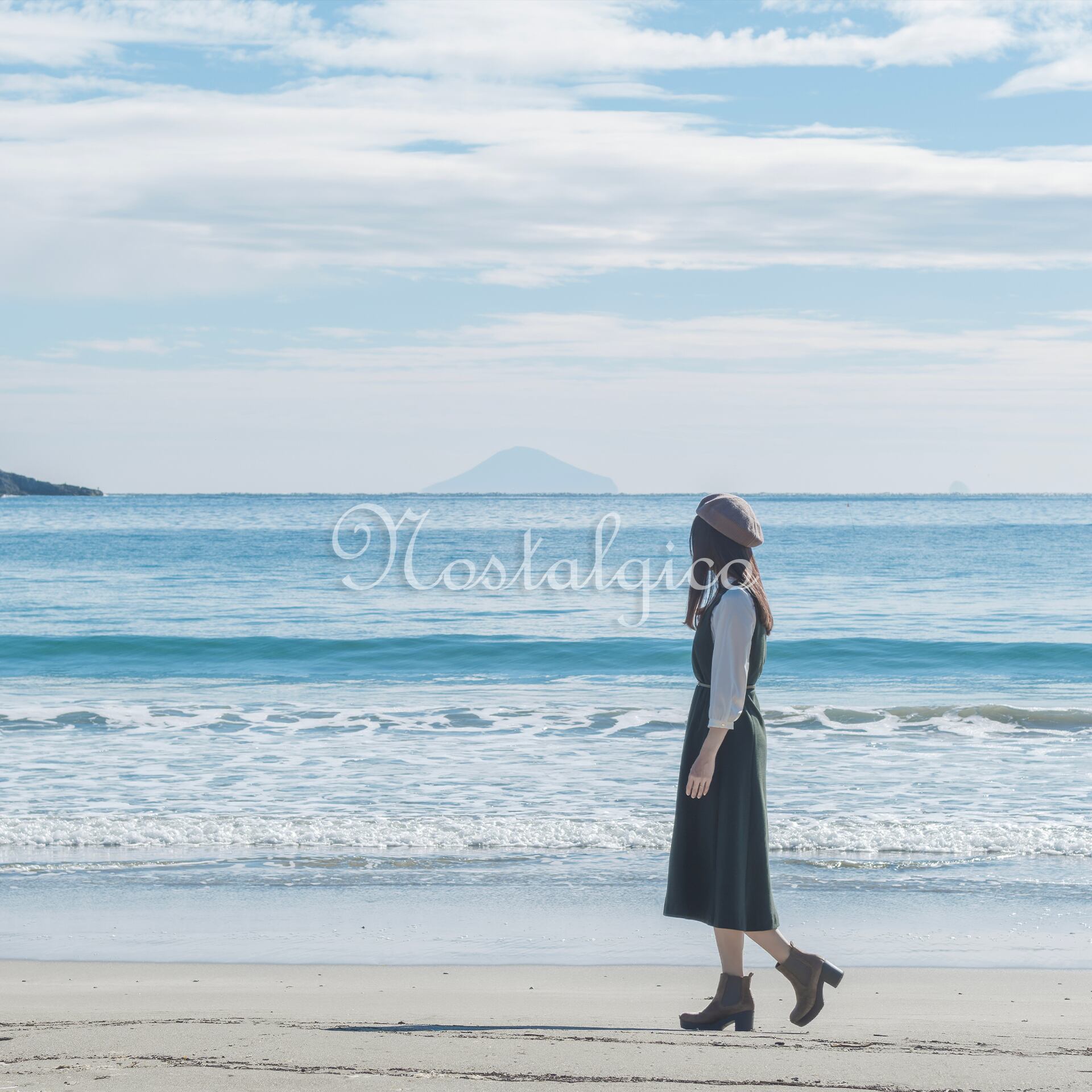この写真素材は、朝日が輝く秋の海の岸辺で歩く女性のシーンを捉えたものです。波打ち際を歩く女性は、緑色のワンピースを身に着け、ロングヘアが静かに風に揺れています。小さな波が打ち寄せていて、全体的に穏やかな雰囲気が漂っています。