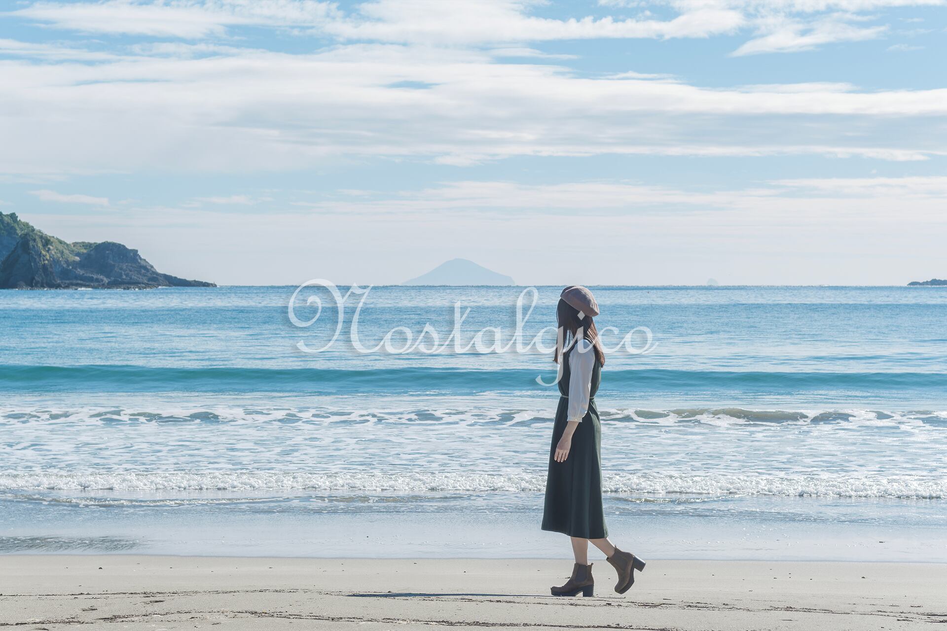 朝日で輝く秋の海の砂浜を歩く女性(静岡県 伊豆 弓ヶ浜)