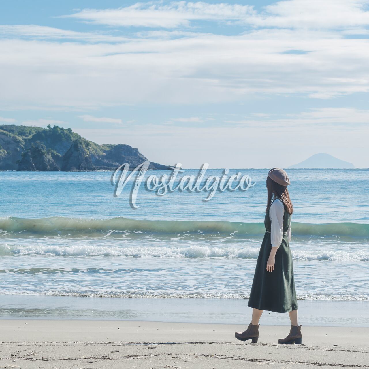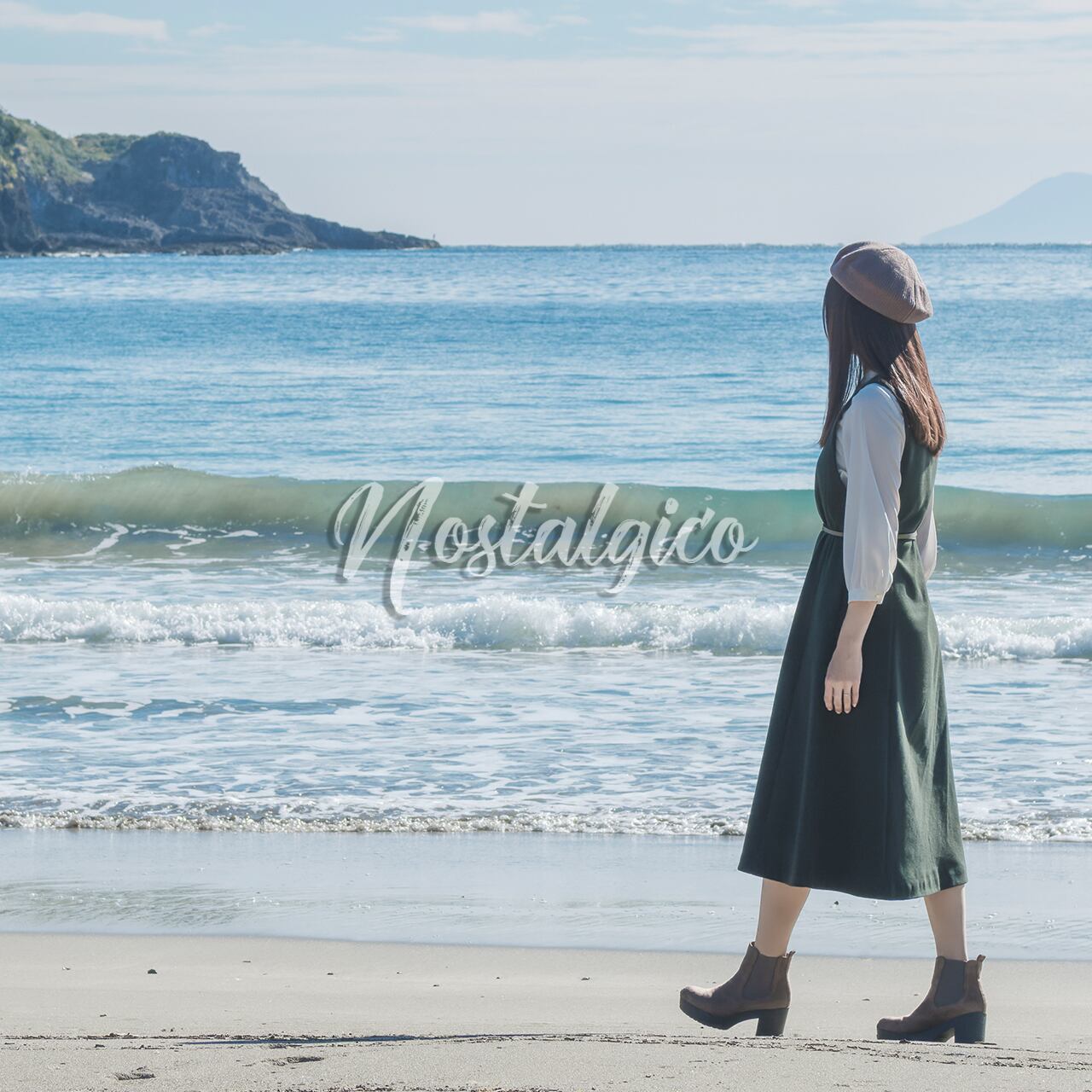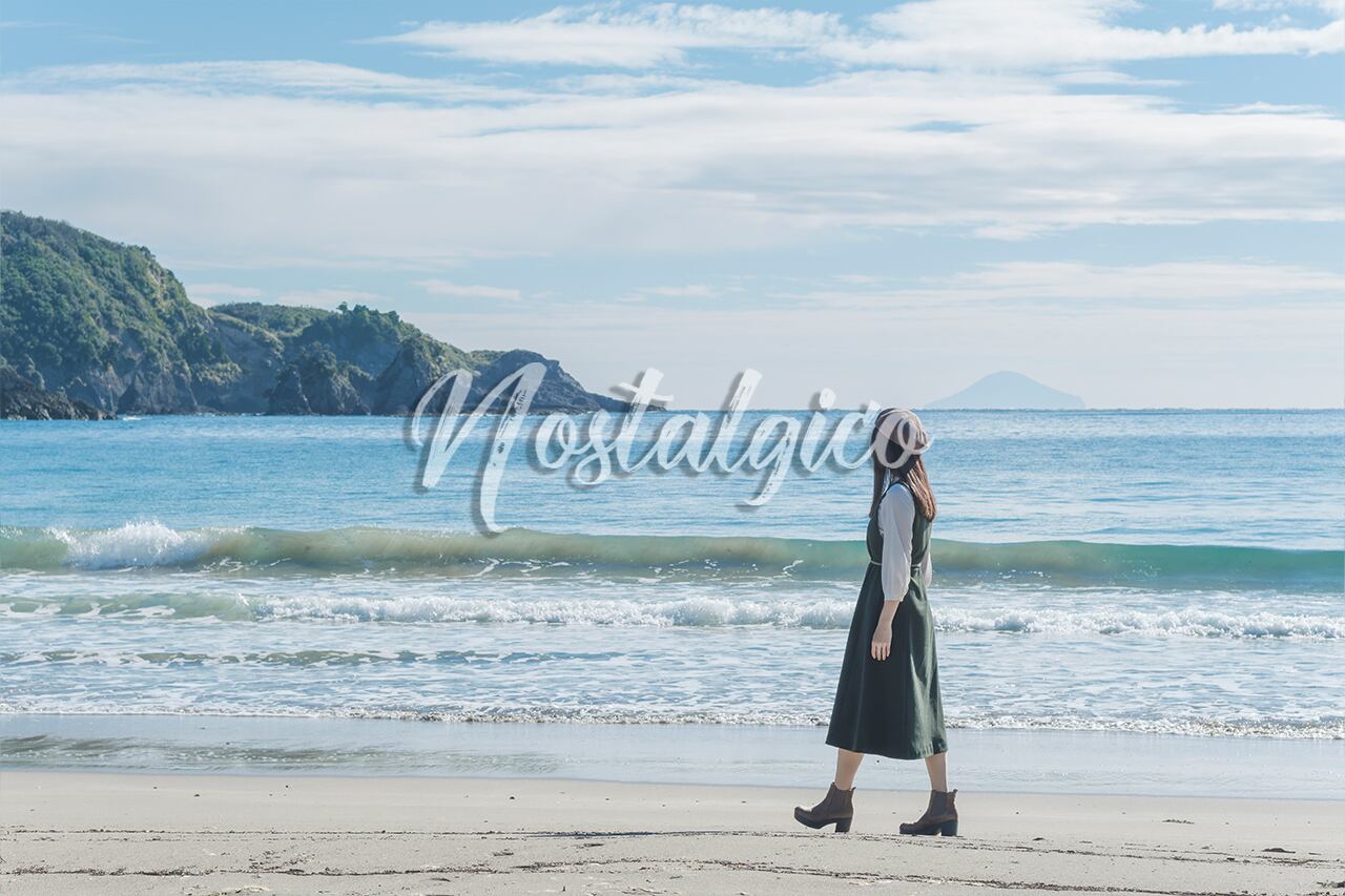 この写真素材は、朝日が輝く秋の海の岸辺で歩く女性のシーンを捉えたものです。波打ち際を歩く女性は、緑色のワンピースを身に着け、ロングヘアが静かに風に揺れています。背景には海と岩山が見え、全体的に穏やかな雰囲気が漂っています。
