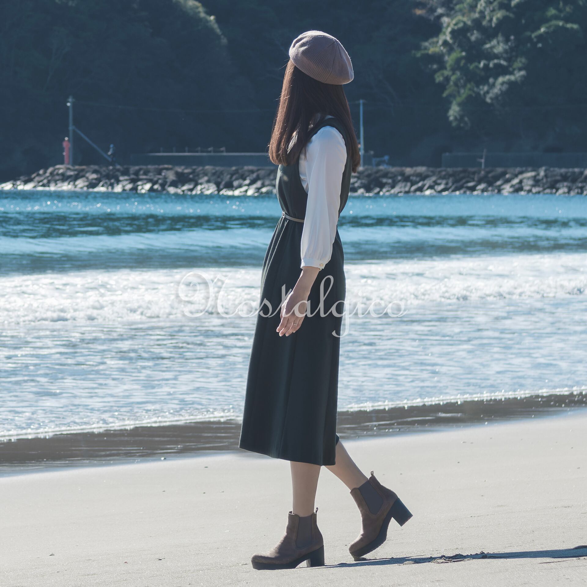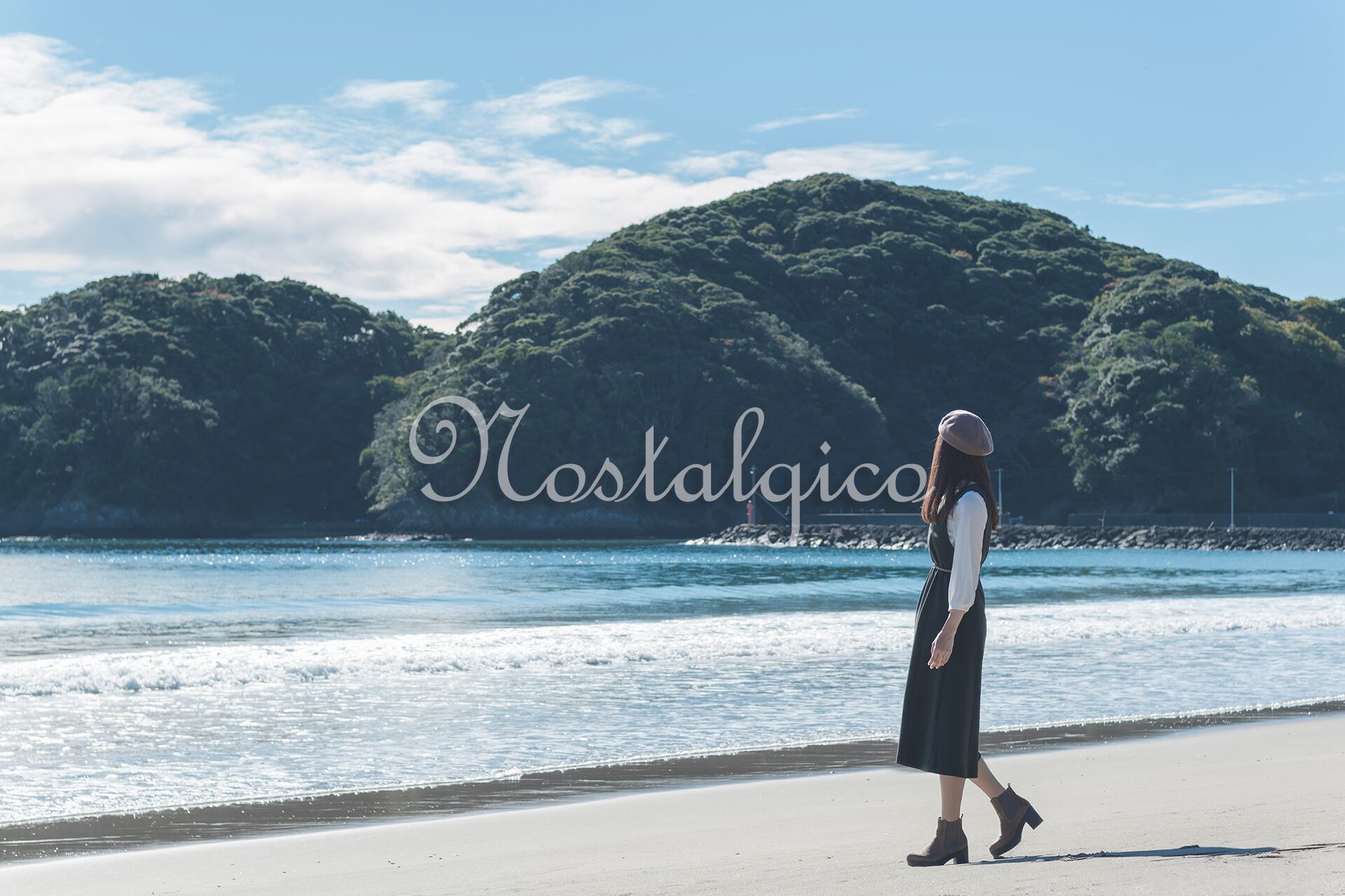 この写真素材は、朝日が輝く秋の海岸で歩く女性のシーンを捉えたものです。波打ち際を歩く女性は、緑色のワンピースを身に着け、ロングヘアが静かに風に揺れています。背景には海と岩山が見え、全体的に穏やかな雰囲気が漂っています。