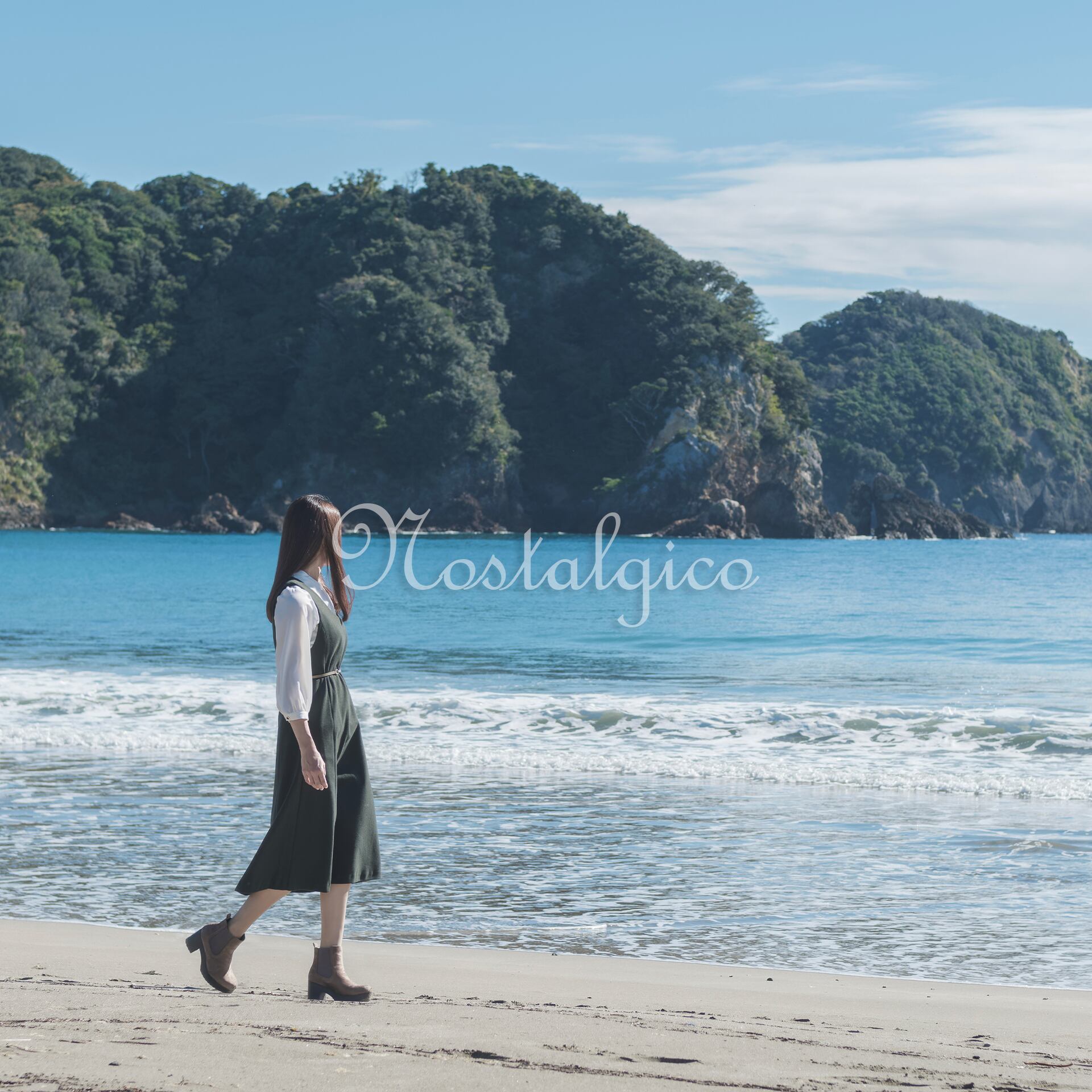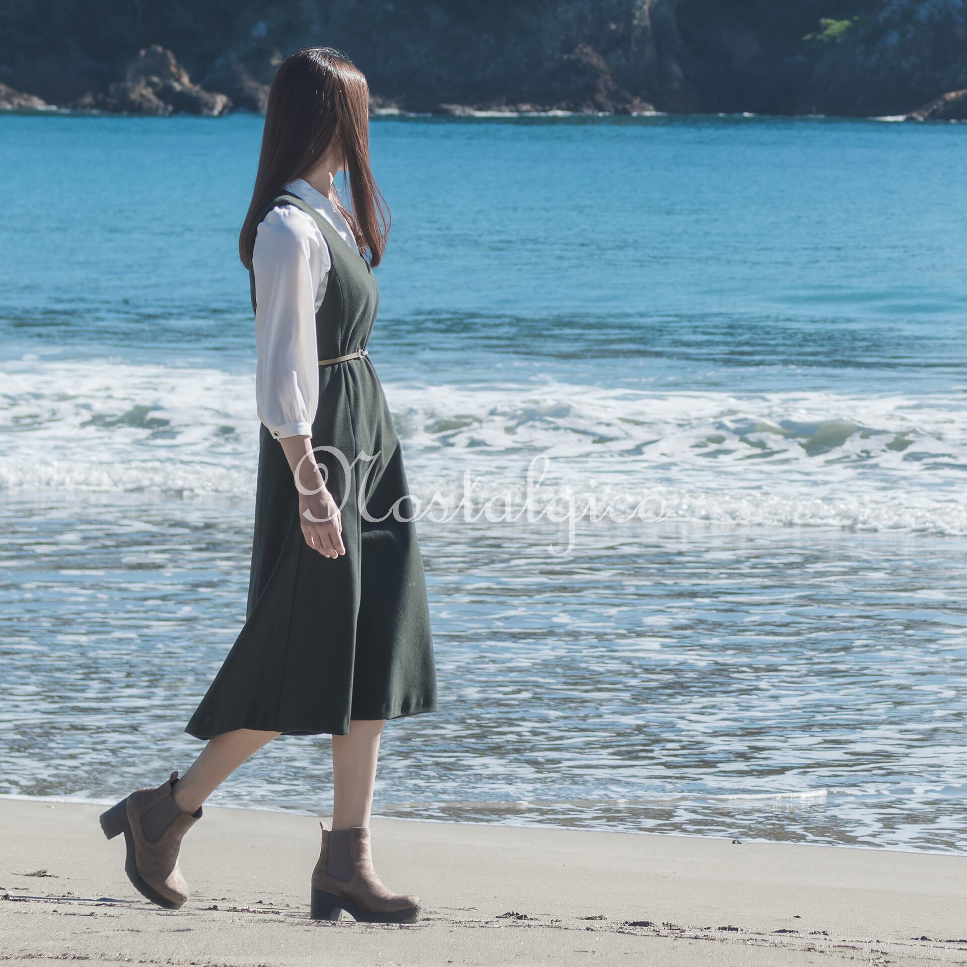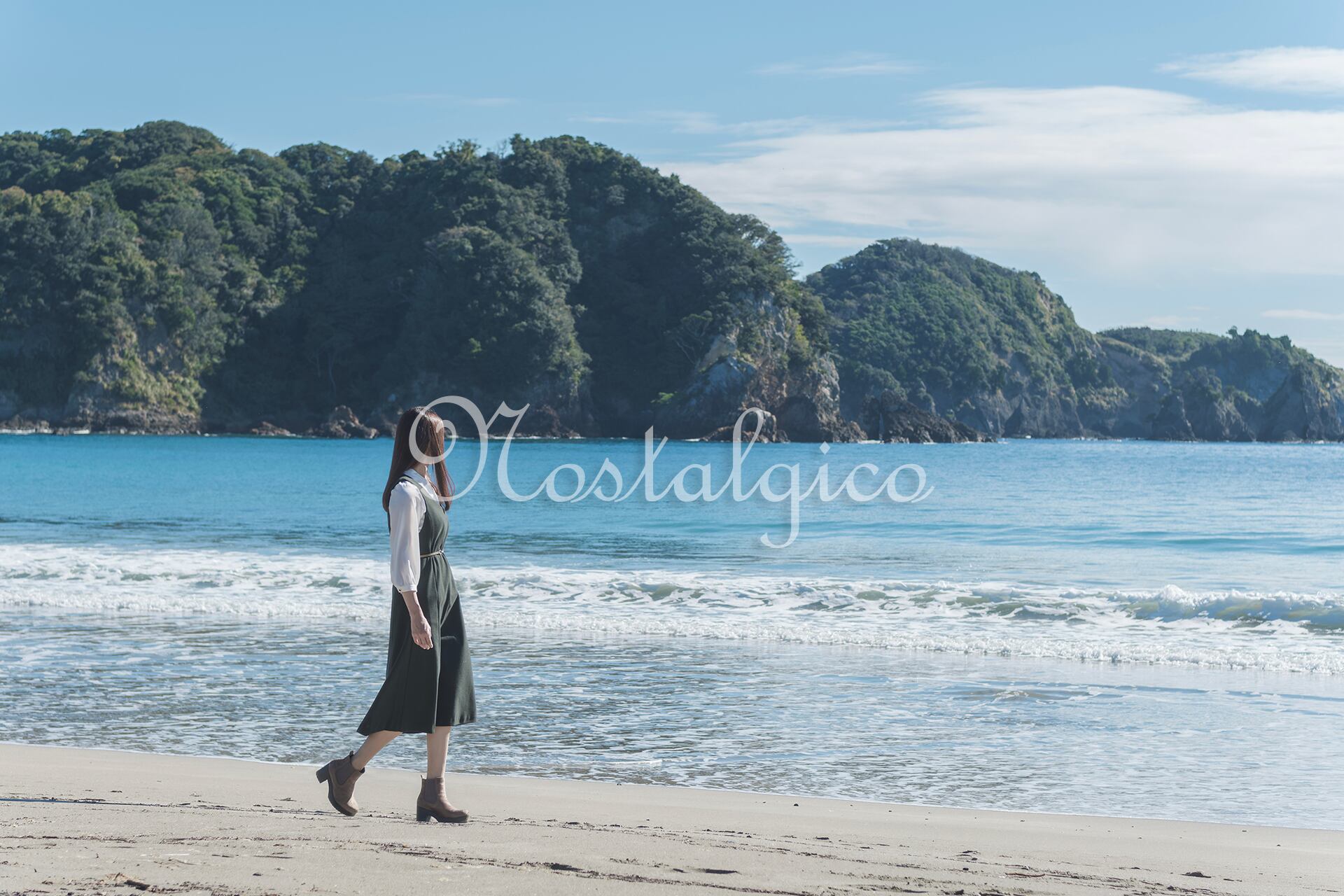 この写真素材は、朝日が輝く秋の海岸で歩く女性のシーンを捉えたものです。波打ち際を歩く女性は、緑色のワンピースを身に着け、ロングヘアが静かに風に揺れています。背景には海と岩山が見え、全体的に穏やかな雰囲気が漂っています。