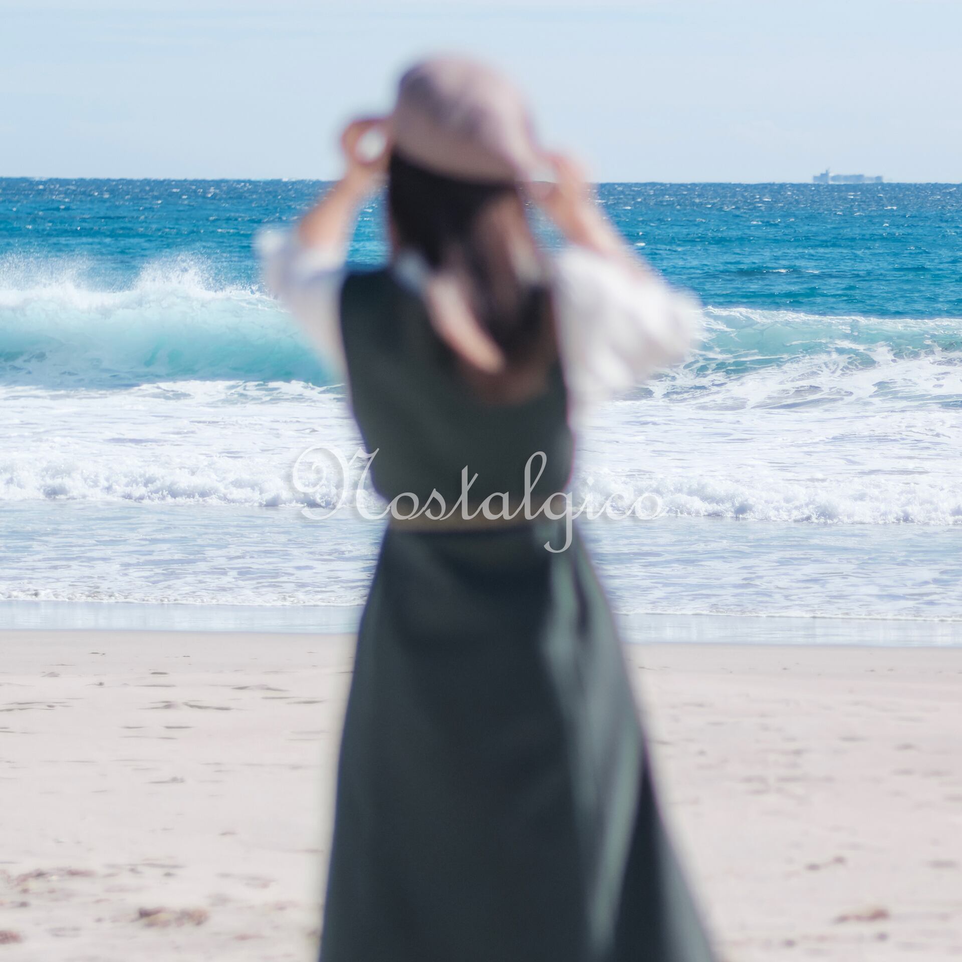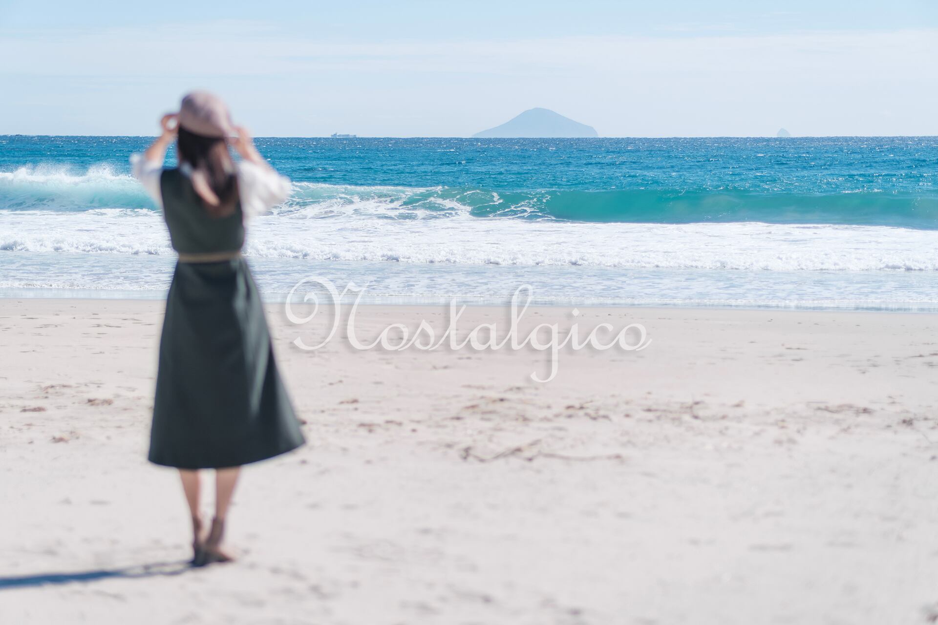 この写真素材は、静岡県伊豆の入田浜で撮影された、美しい秋の海を眺める女性の後ろ姿を捉えたものです。女性はベレー帽をかぶっており、緑色のワンピースを着たロングヘアが印象的です。女性は白い砂浜に立ち、静かに海を見つめる様子を切り取っており、自然の美しさと女性の優雅さを伝えています。また秋の陽光と白い砂浜の反射光によって、女性の肌色が明るくなっています。この写真からは波の音が聞こえてきそうな静かで落ち着いた雰囲気も感じられます。