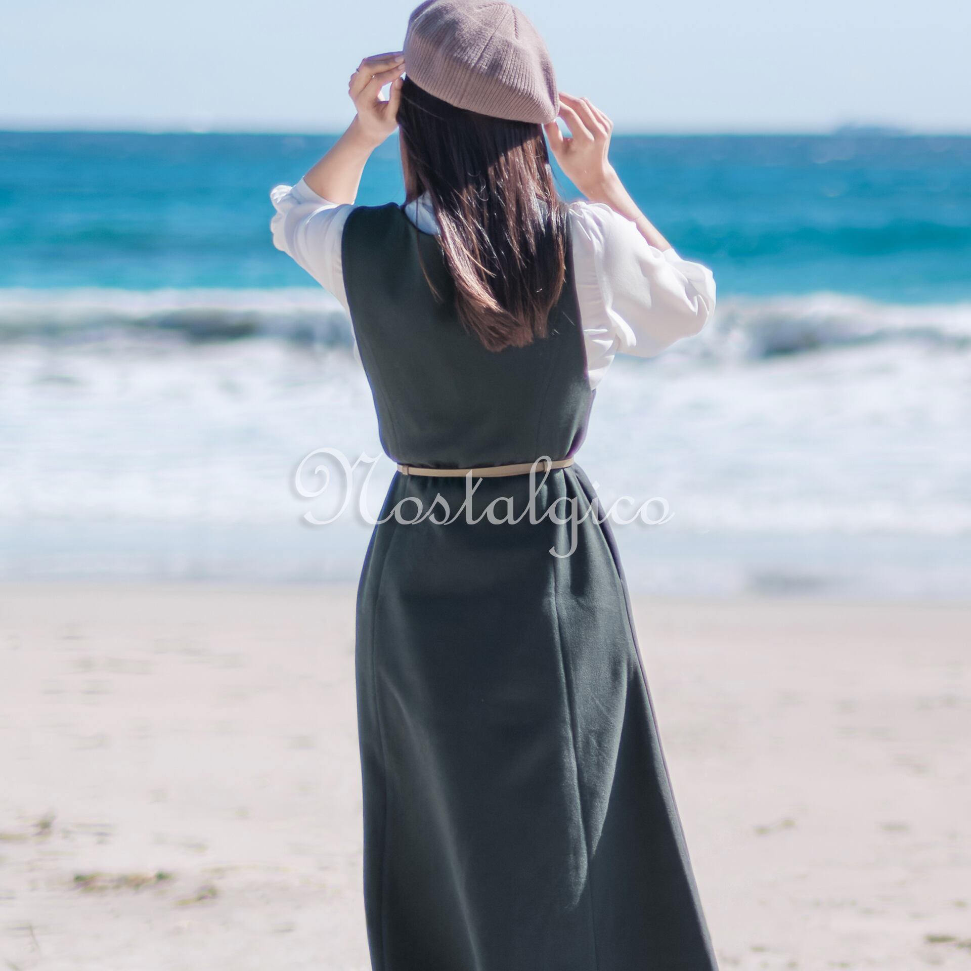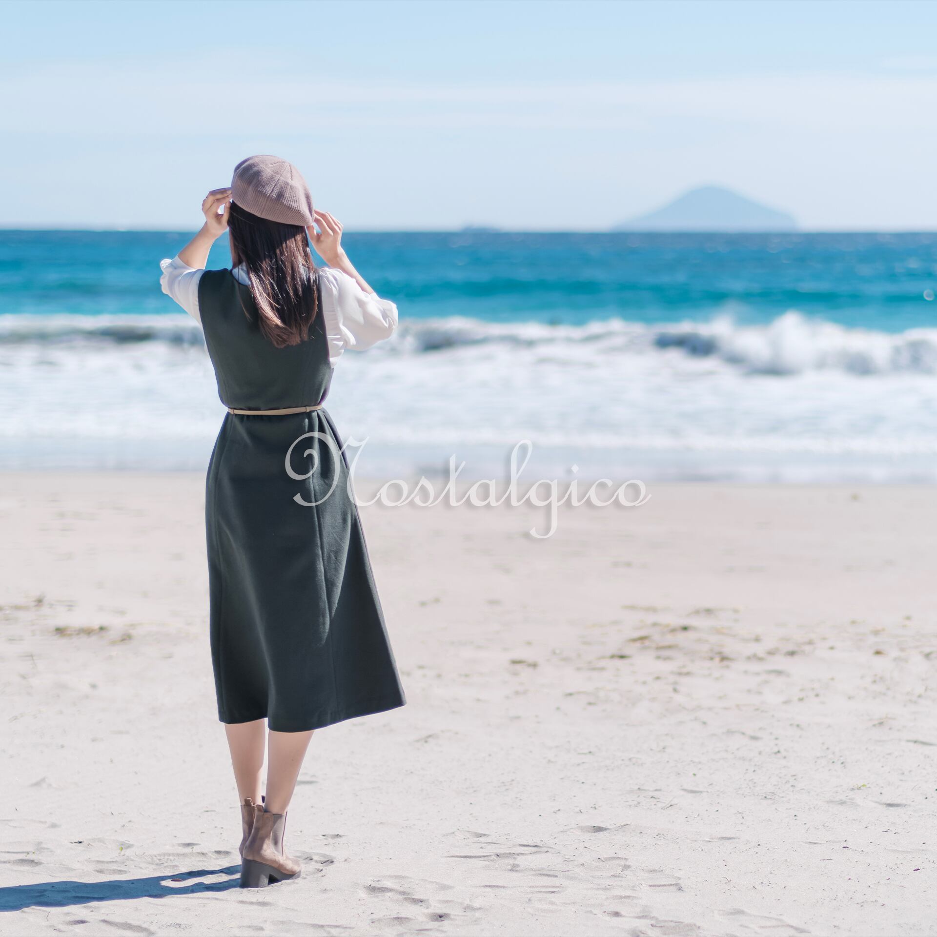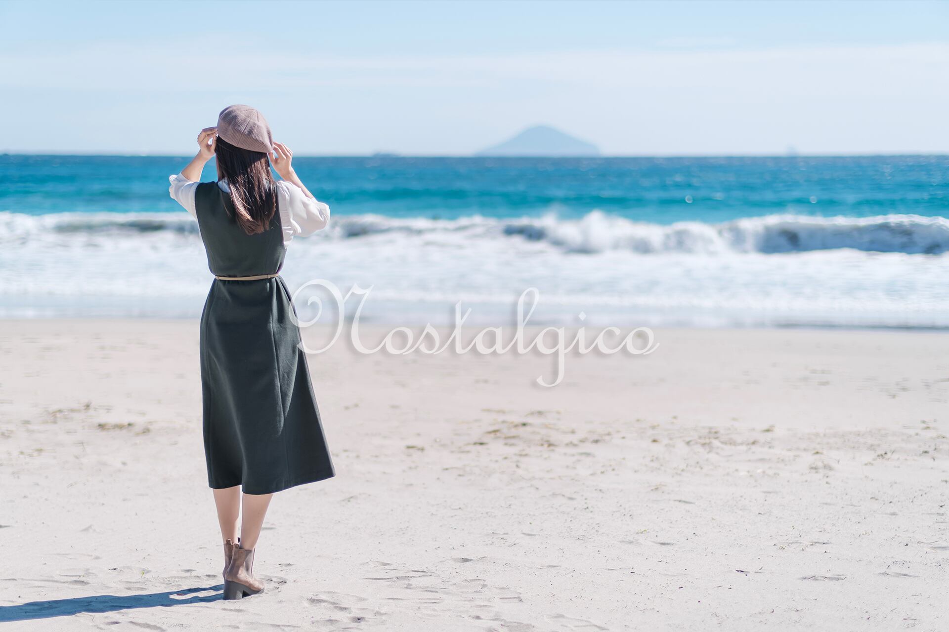 この写真素材は、静岡県伊豆の入田浜で撮影された、美しい秋の海を眺める女性の後ろ姿を捉えたものです。女性はベレー帽をかぶっており、緑色のワンピースを着たロングヘアが印象的です。女性は白い砂浜に立ち、静かに海を見つめる様子を切り取っており、自然の美しさと女性の優雅さを伝えています。また、秋の陽光と白い砂浜の反射光によって、女性の肌色が明るくなっています。この写真からは波の音が聞こえてきそうな静かで落ち着いた雰囲気も感じられます。