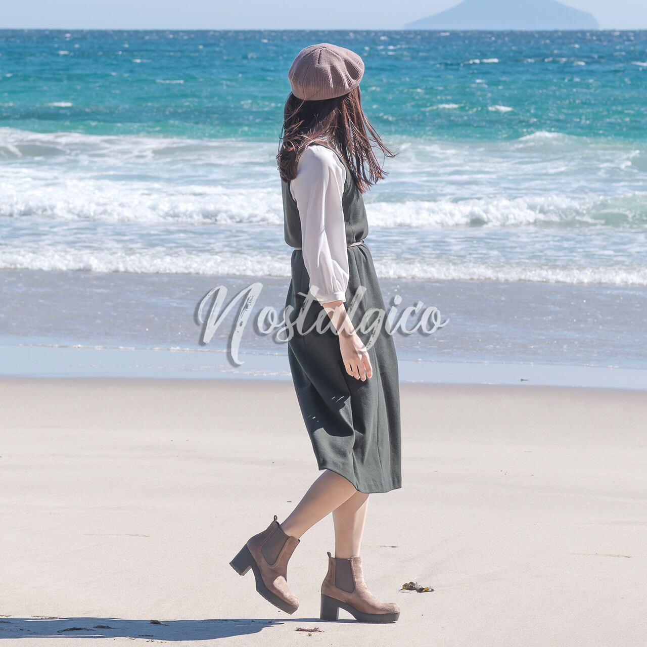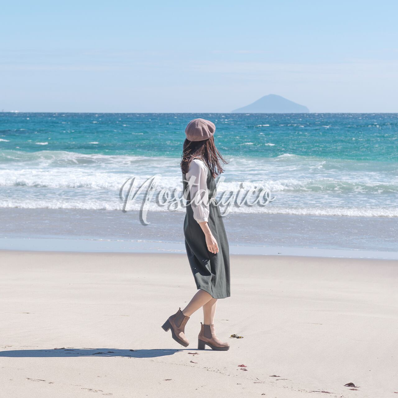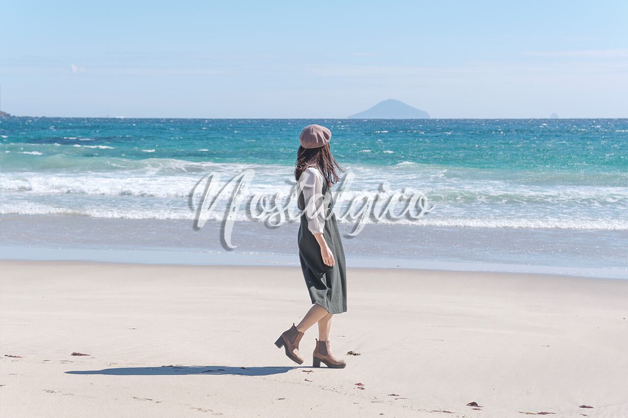 この写真素材は、鮮やかなブルーの海と白い砂浜が、美しい女性の姿を引き立てています。女性は緑色のワンピースとベレー帽を身にまとい、海風になびくロングヘアが揺れながら、優雅な足取りで白い砂浜を歩いています。さらに、秋の優しい太陽光と白い砂浜の反射光が女性の肌を明るく照らし出し、健康的な美しさが伝わってきます。