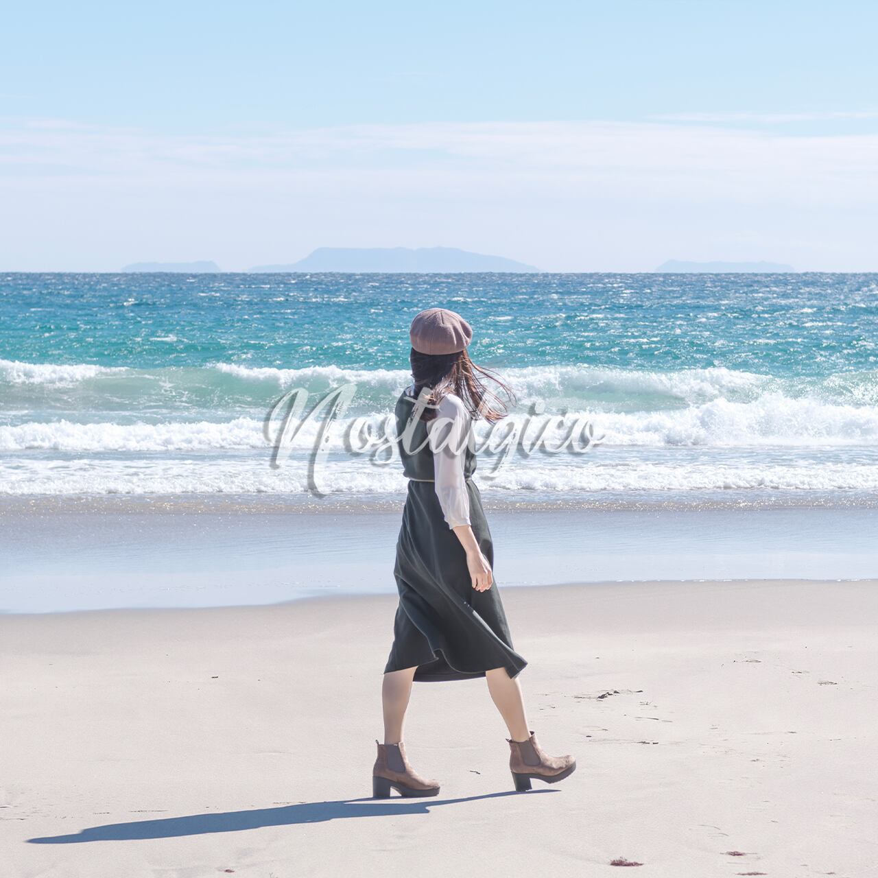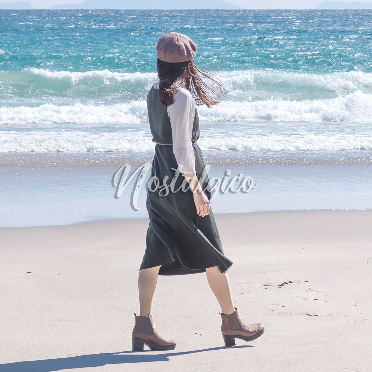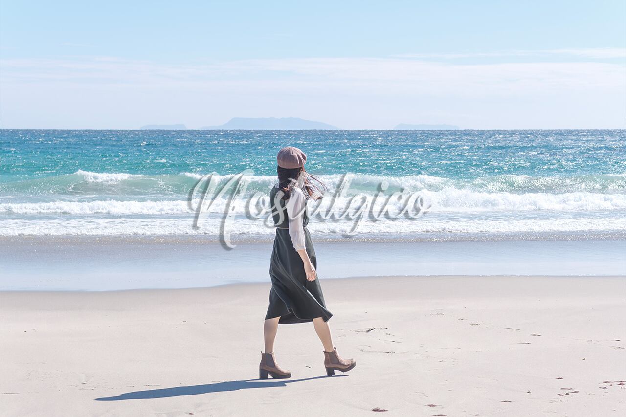 この写真素材は、鮮やかなブルーの海と白い砂浜が、美しい女性の姿を引き立てています。女性は緑色のワンピースとベレー帽を身にまとい、海風になびくロングヘアが揺れながら、優雅な足取りで白い砂浜を歩いています。さらに、秋の優しい太陽光と白い砂浜の反射光が女性の肌を明るく照らし出し、健康的な美しさが伝わってきます。