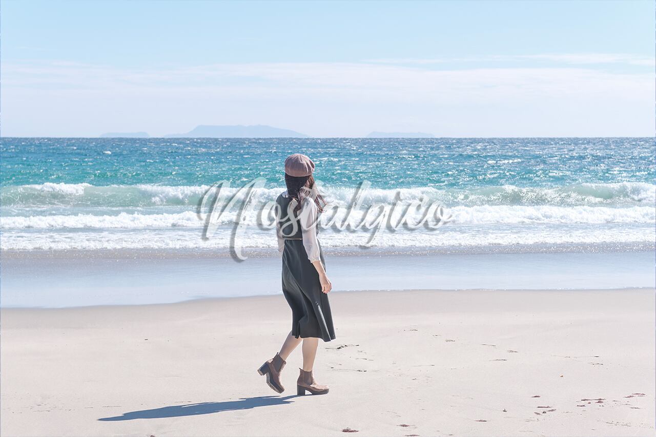 秋の海の綺麗な白い砂浜を歩く女性(静岡県 伊豆 入田浜)