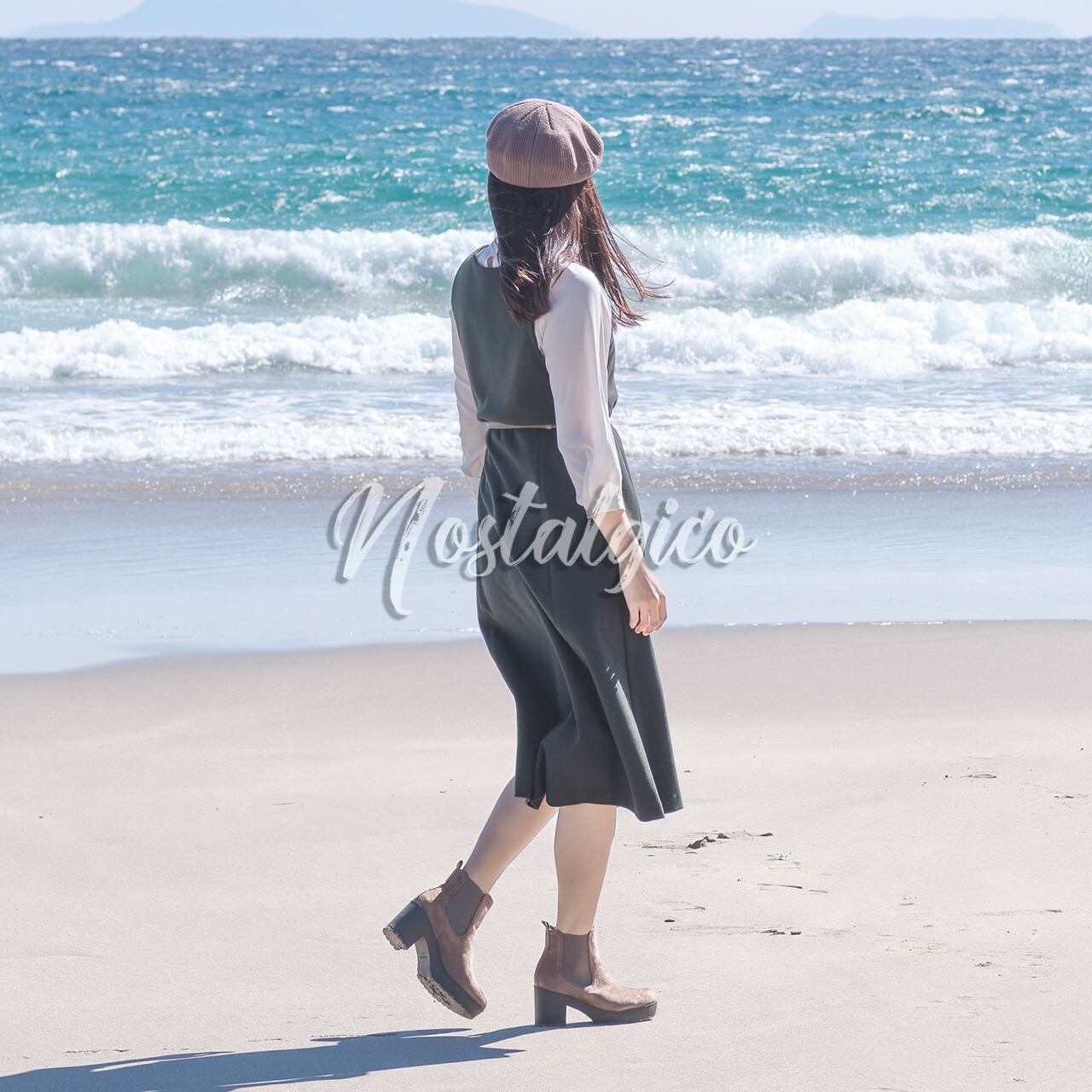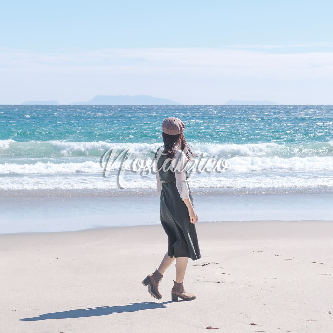 この写真素材は、鮮やかなブルーの海と白い砂浜が、美しい女性の姿を引き立てています。女性は緑色のワンピースとベレー帽を身にまとい、海風になびくロングヘアが揺れながら、優雅な足取りで白い砂浜を歩いています。さらに、秋の優しい太陽光と白い砂浜の反射光が女性の肌を明るく照らし出し、健康的な美しさが伝わってきます。