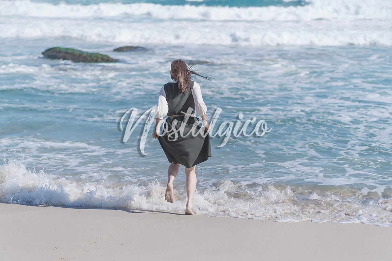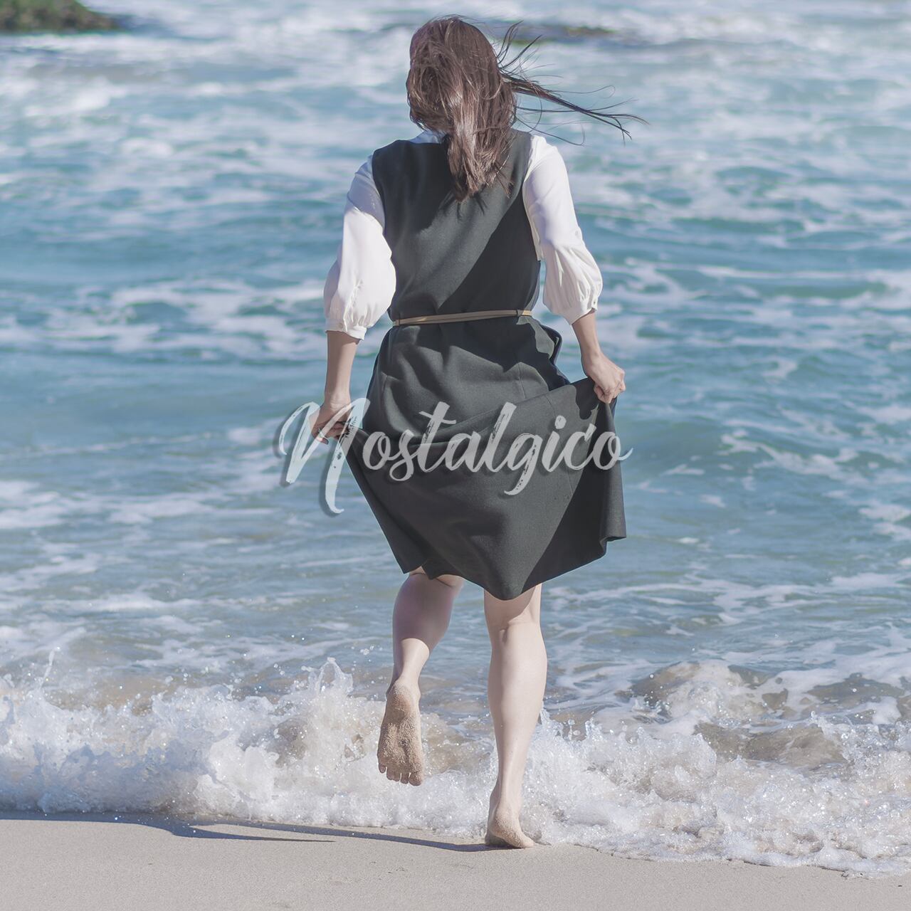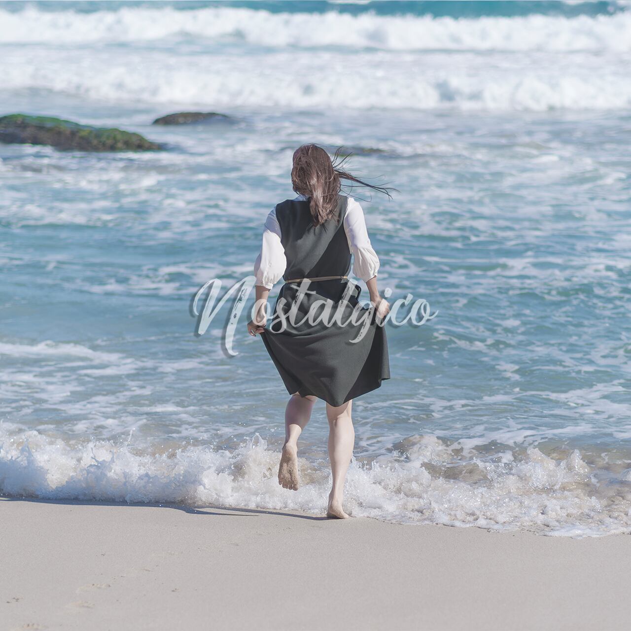 この写真は、秋の季節に綺麗な海の波打ち際を裸足で遊ぶロングヘアの女性の姿を捉えたものです。波の音や海風を感じられるかのようなリアリティーのある写真素材で、波打ち際を裸足で遊ぶ女性の姿からは喜びや明るい心が伝わってきます。元気いっぱいの女性の姿を見ると自然と笑顔がこぼれます。