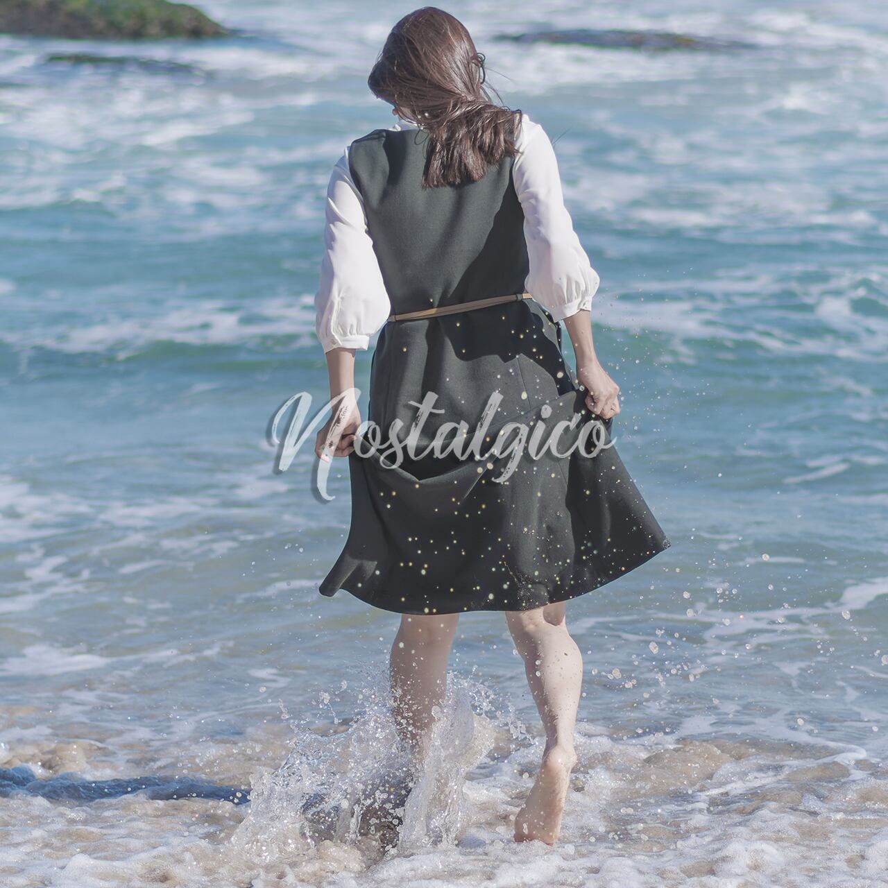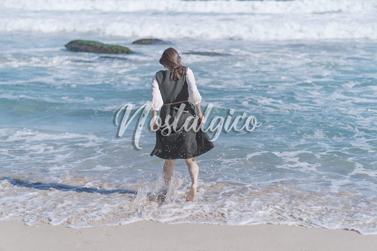 この写真は、秋の季節に綺麗な海の波打ち際を裸足で遊ぶロングヘアの女性の姿を捉えたものです。波の音や海風を感じられるかのようなリアリティーのある写真素材で、波打ち際を裸足で遊ぶ女性の姿からは喜びや明るい心が伝わってきます。元気いっぱいの女性の姿を見ると自然と笑顔がこぼれます。