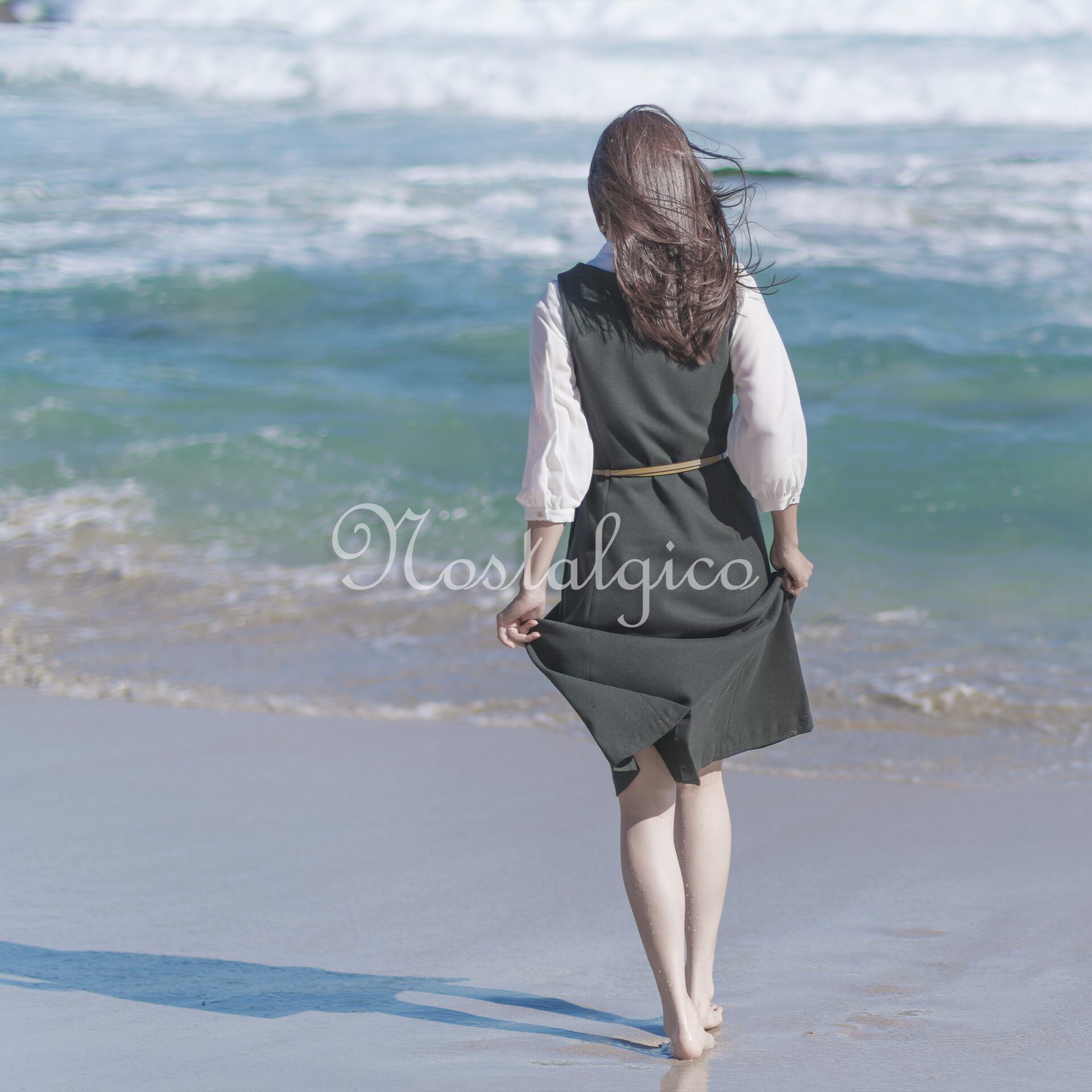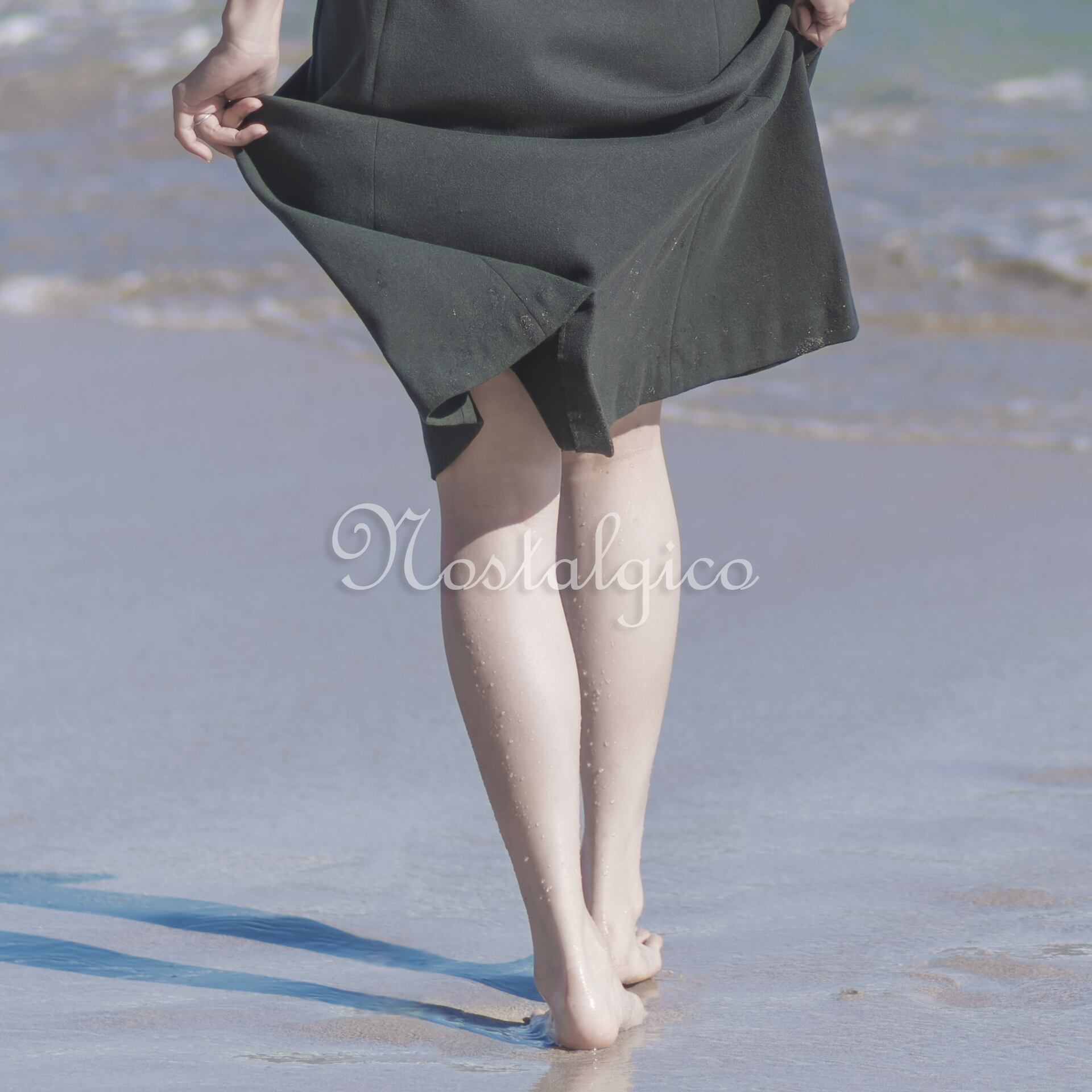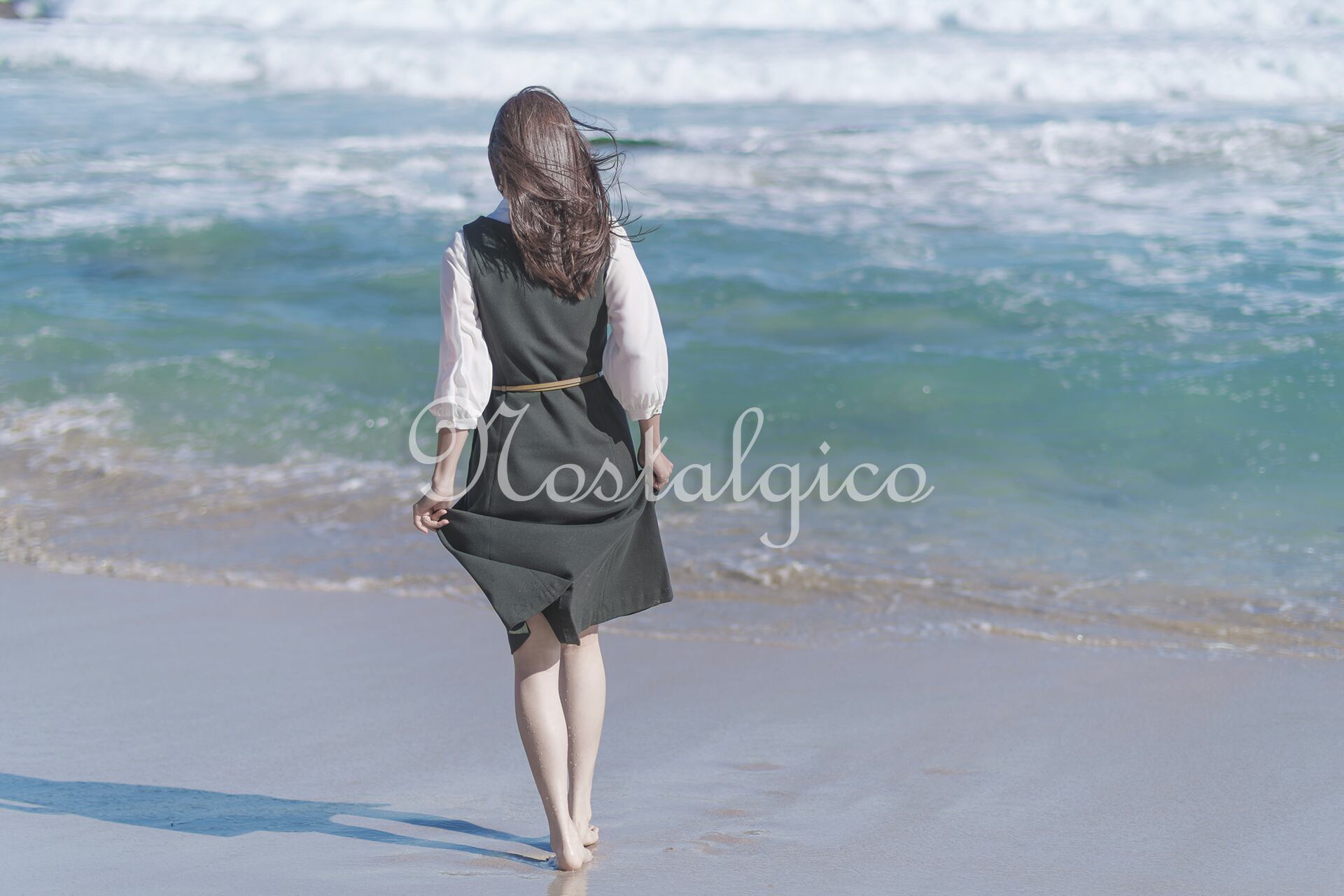 この写真は、秋の季節に綺麗な海の波打ち際を歩くロングヘアの女性の後ろ姿を捉えたものです。潮風に長い髪がなびいています。海い波の音や海風を感じられるかのようなリアリティーのある写真素材で、裸足の女性の姿からは喜びや明るい心が伝わってきます。