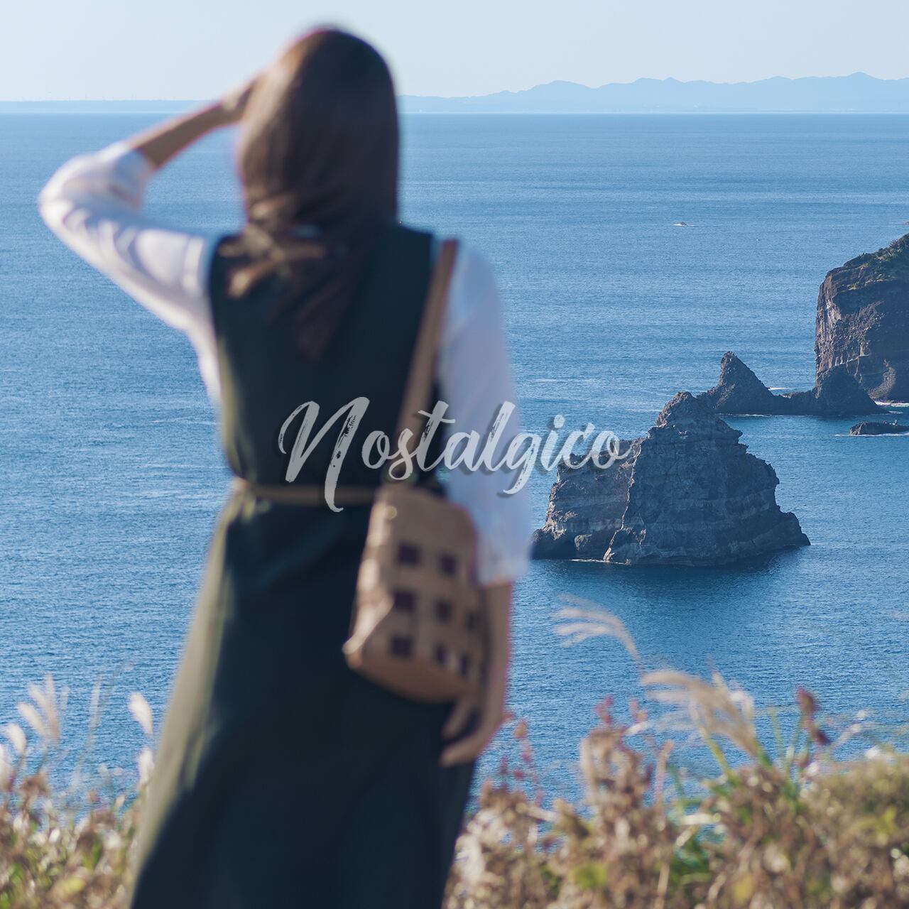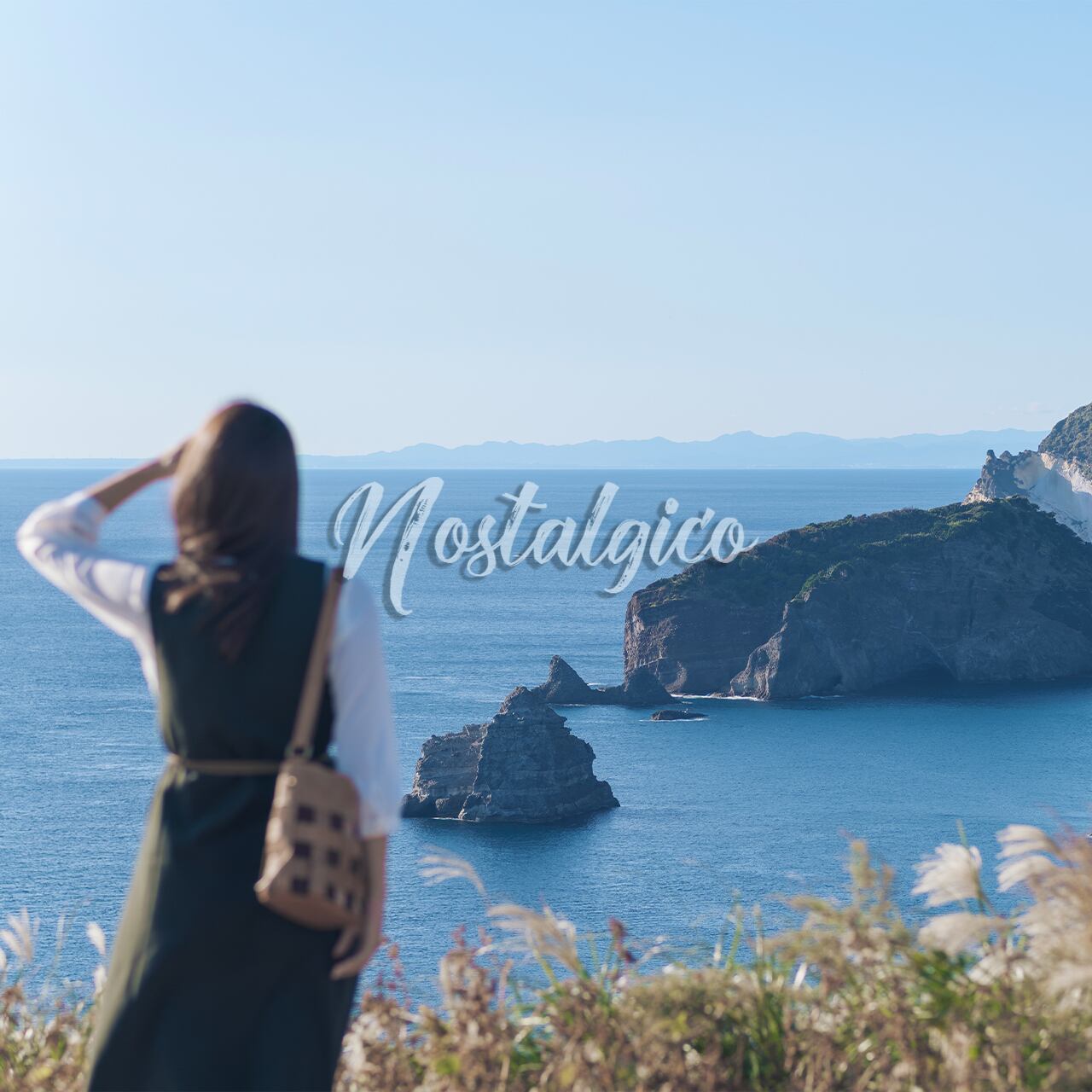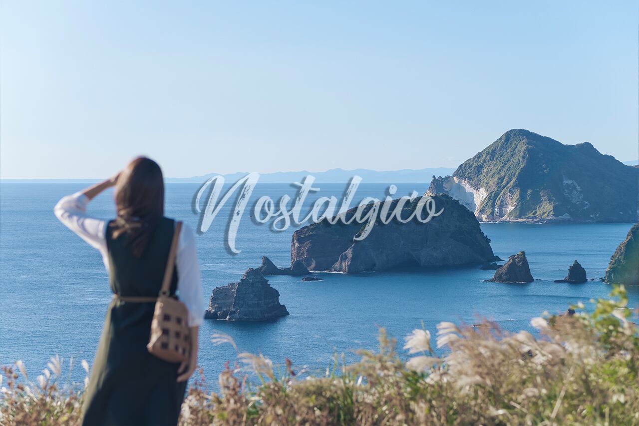 静岡県伊豆のあいあい岬で撮影された、美しい風景と女性の一枚です。秋の日差しが柔らかく、海の青さと空気の透明感が感じられます。女性は西日の光に手をかざし、海を見つめています。水平線も美しく映っています。