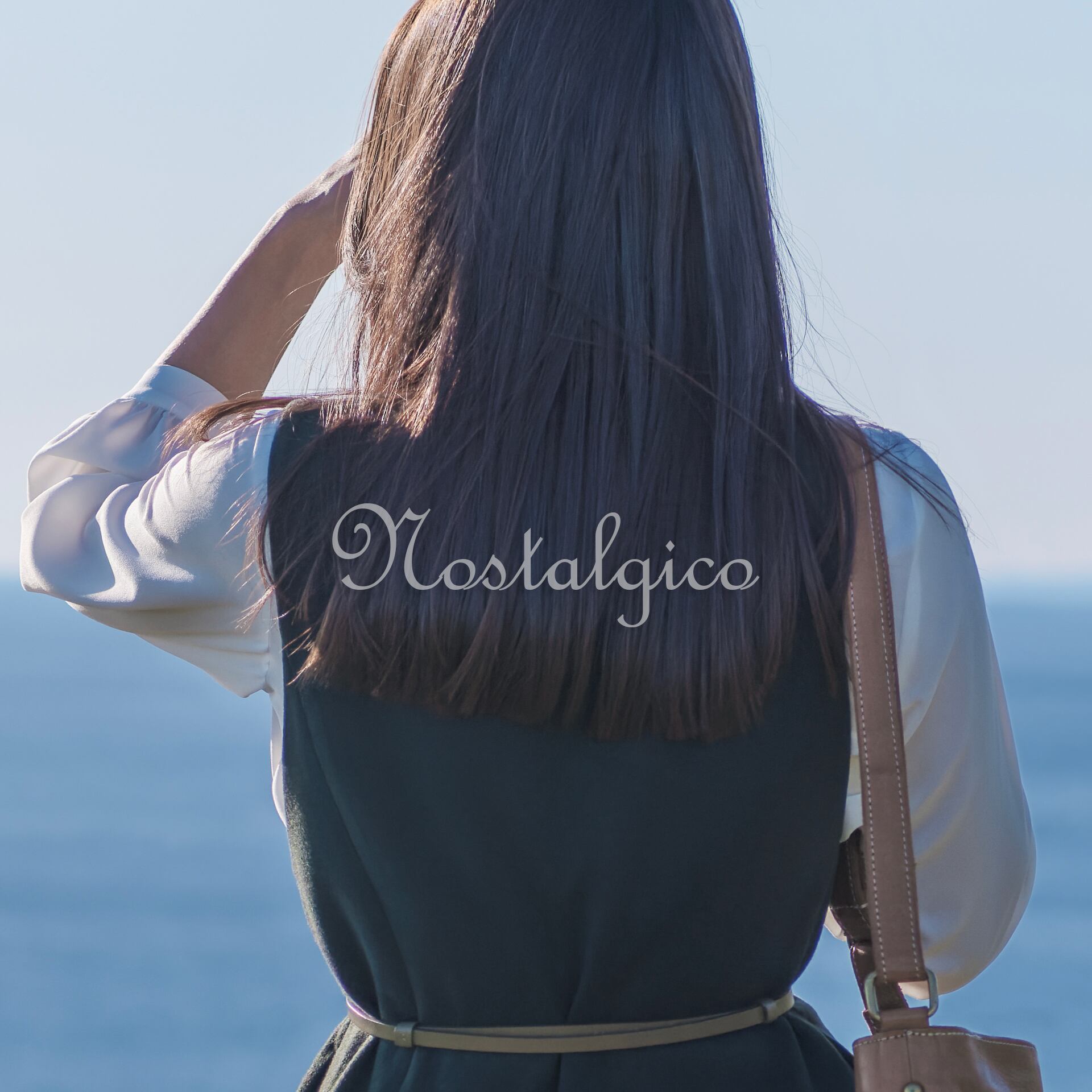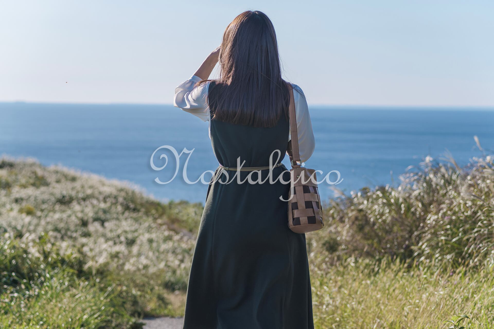 静岡県伊豆のあいあい岬で撮影された、美しい秋の風景とロングヘアの女性の一枚です。秋の日差しが柔らかく、海の青さと空気の透明感が感じられます。女性は西日の光に手をかざし、海を見つめています。水平線も美しく映っています。環境光で髪の艶が際立っています。