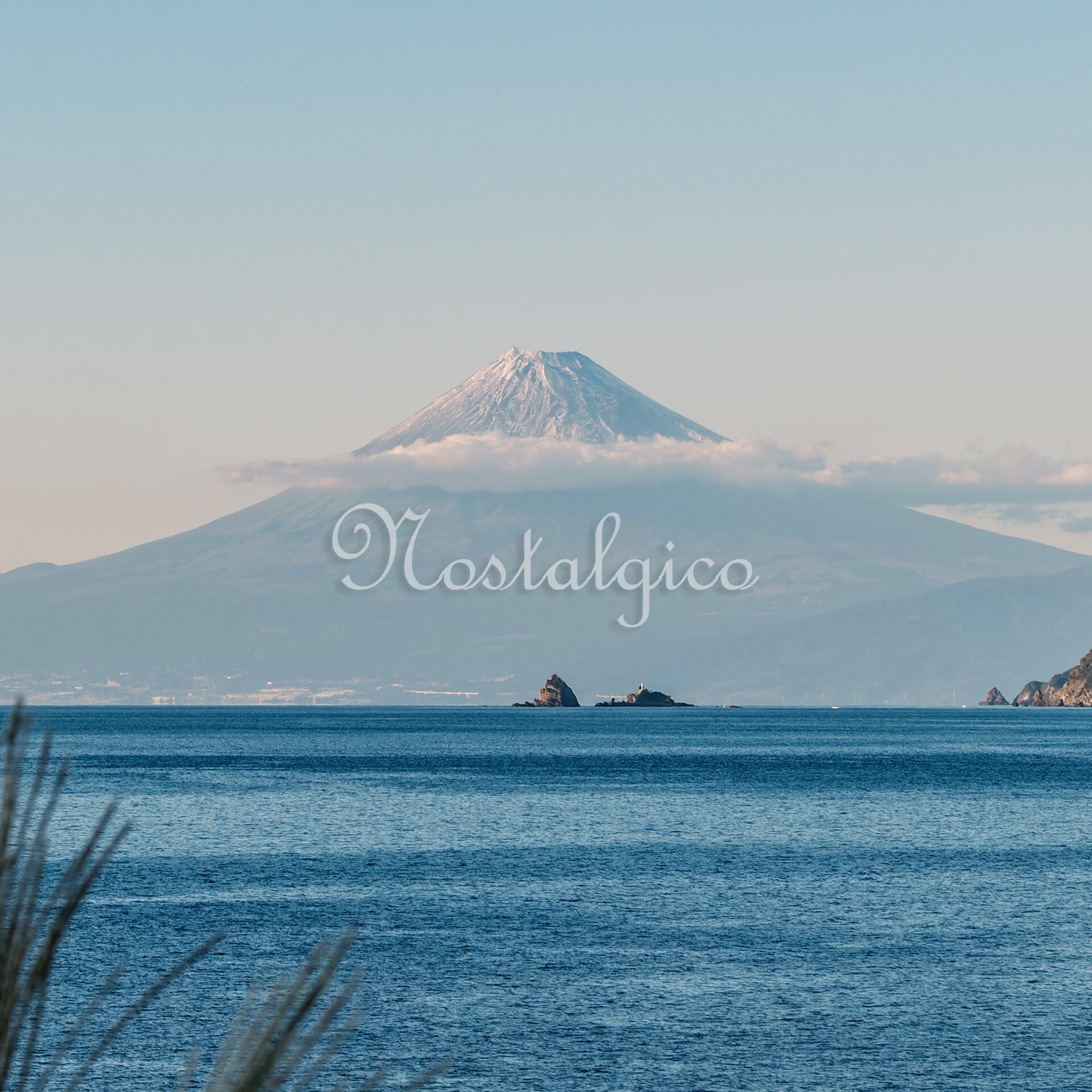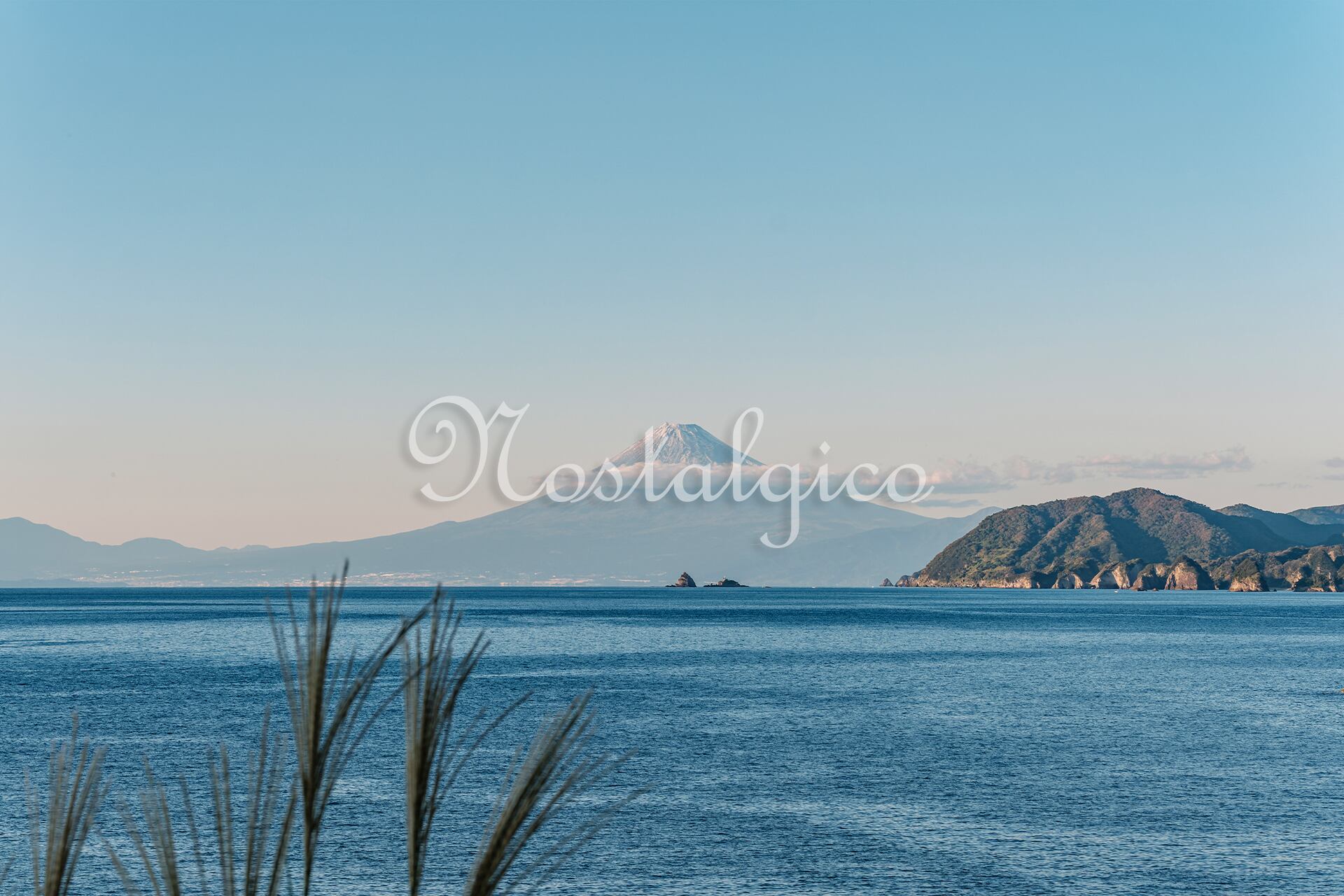 この写真では、夕暮れ前の淡い藍色の空に富士山が浮かんでいます。富士山の美しいシルエットから圧倒的な存在感が感じられます。また、手前には伊豆の秋の海が広がっていて、静寂な雰囲気が漂っています。リラックス効果のある、心が落ち着く一枚です。