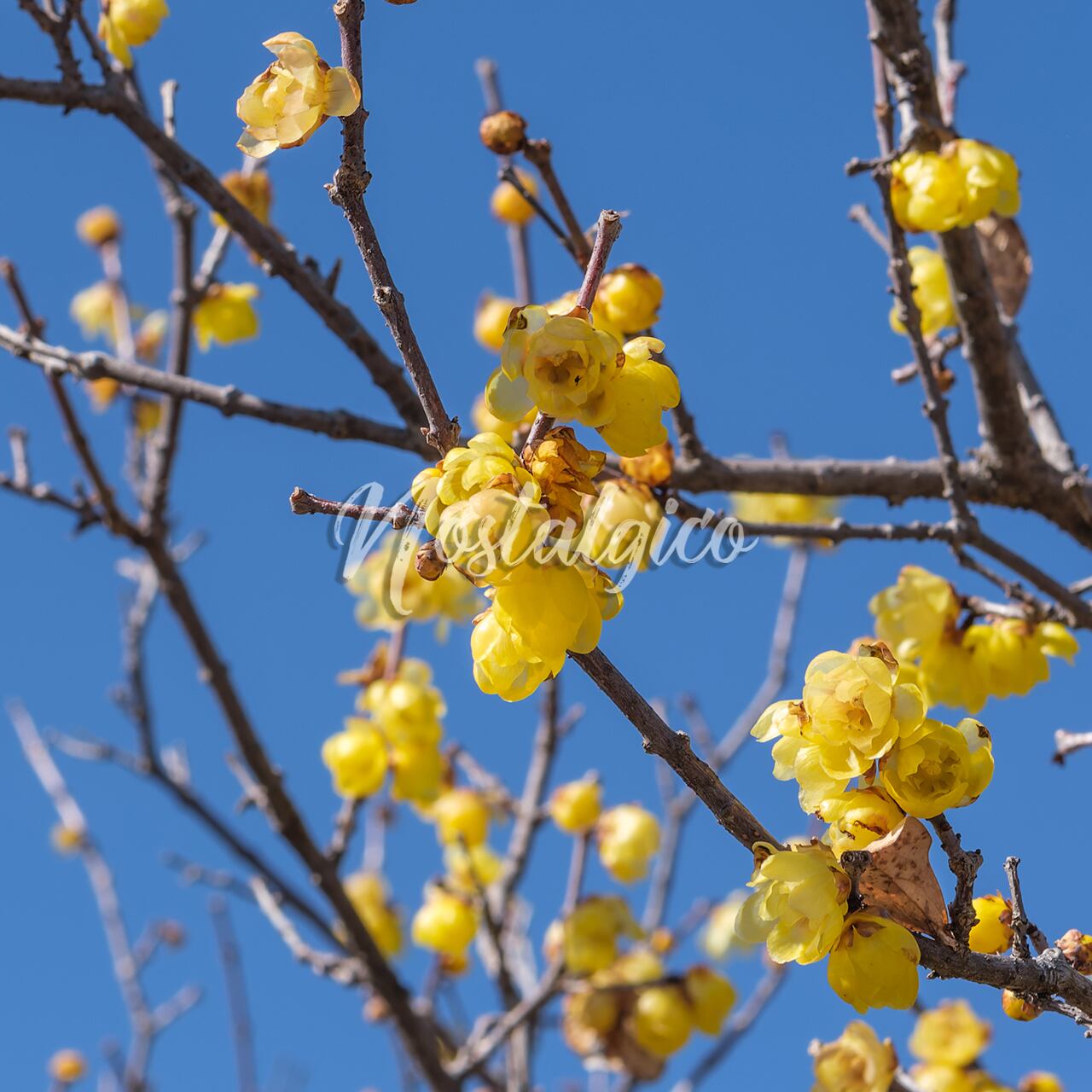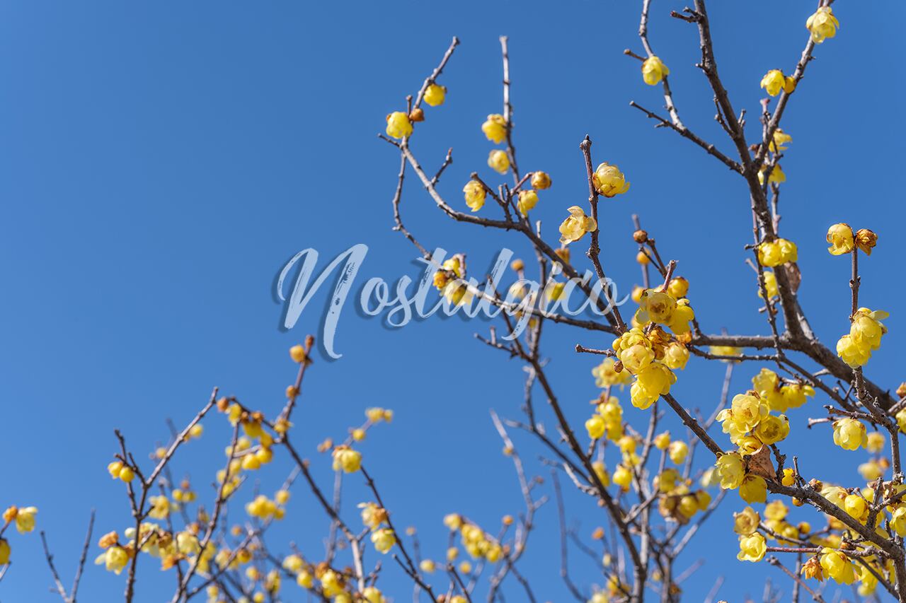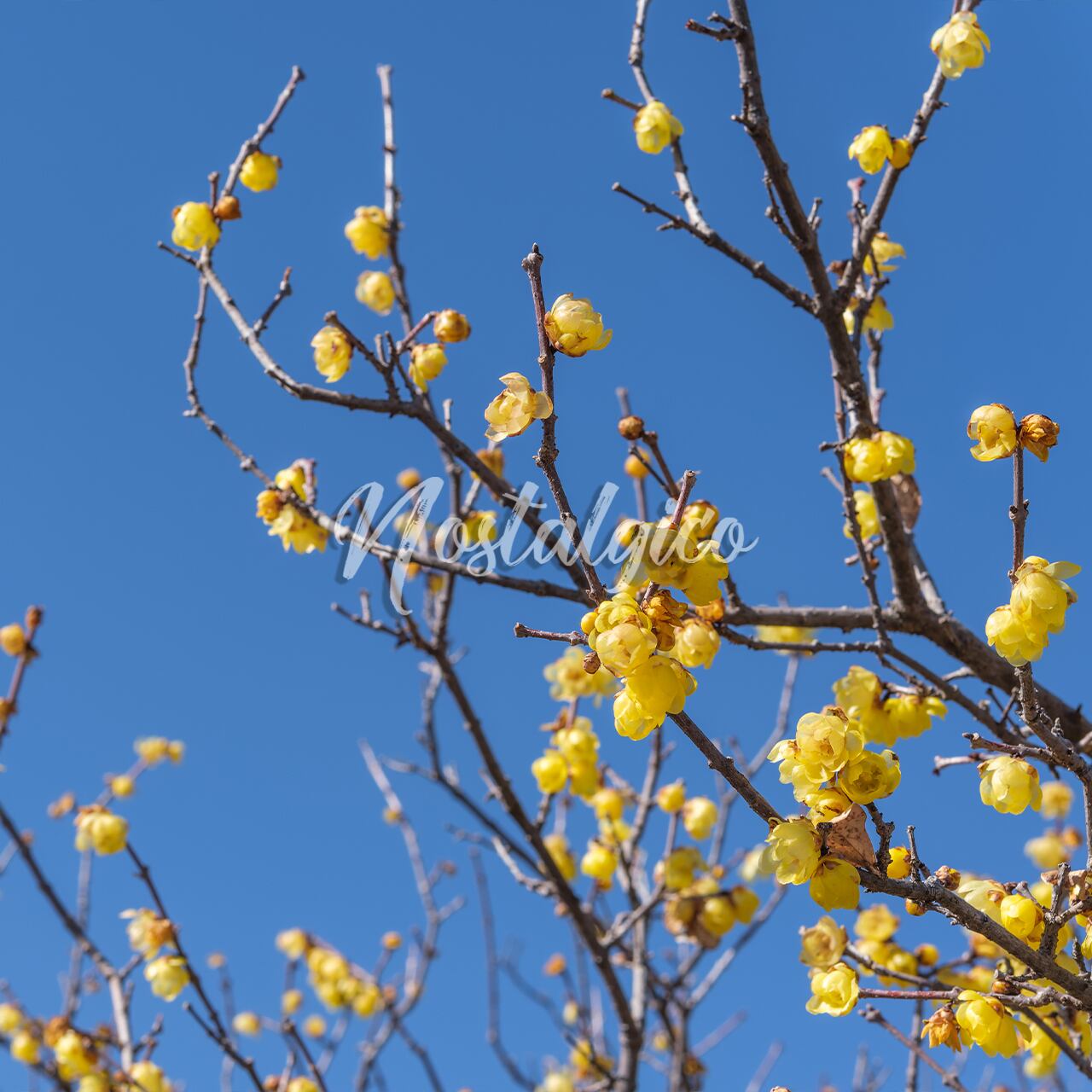 この春の蝋梅(ロウバイ)の花の写真素材は、快晴の青空をバックに美しく咲き誇る黄色い花々が印象的です。蝋梅の花は、少し透明感があり、ろう細工のような質感があります。