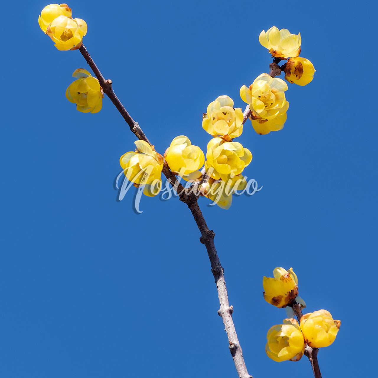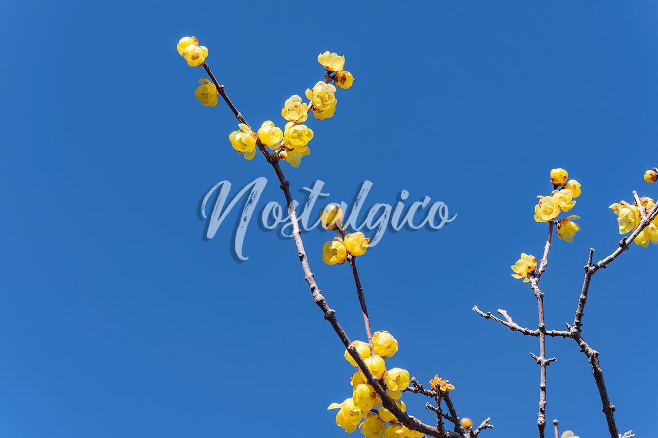 この春の蝋梅(ロウバイ)の花の写真素材は、快晴の青空をバックに美しく咲き誇る黄色い花々が印象的です。蝋梅の花は、少し透明感があり、ろう細工のような質感があります。