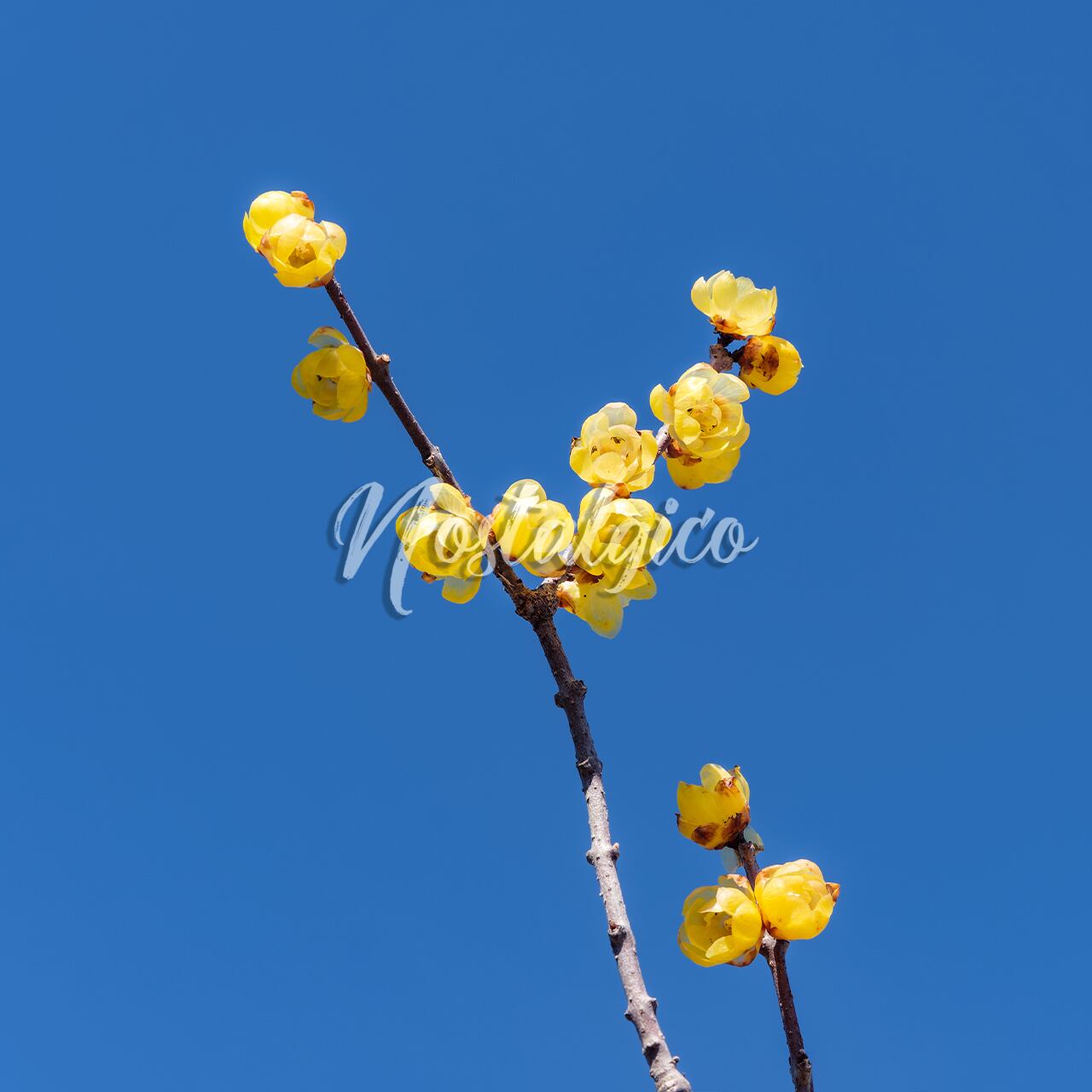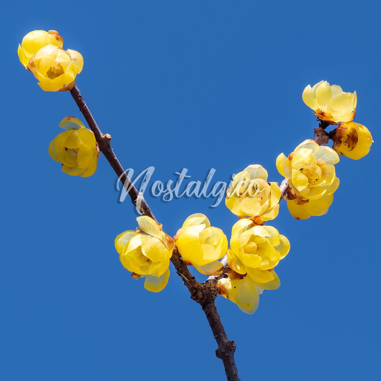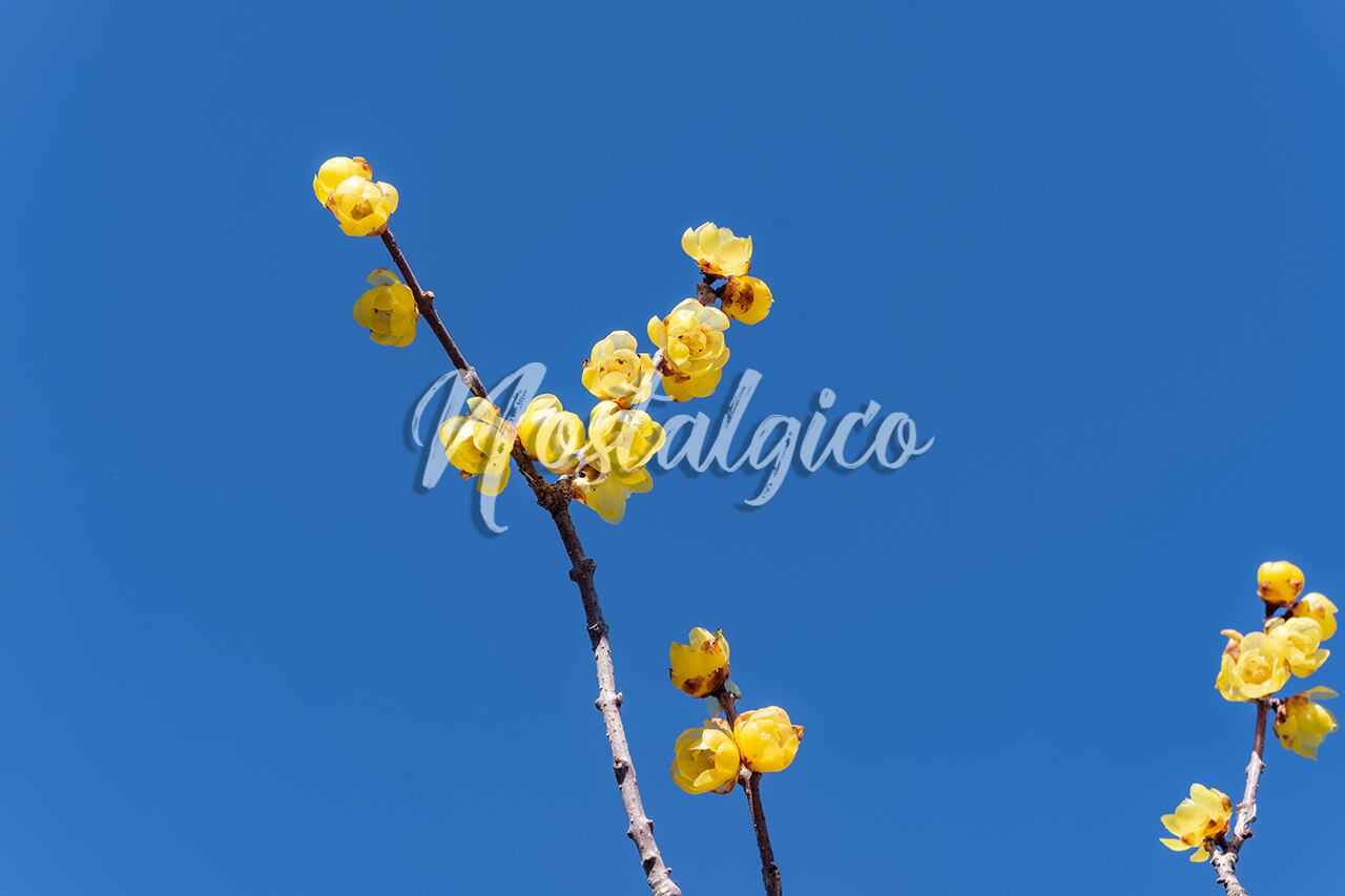この春の蝋梅(ロウバイ)の花の写真素材は、快晴の青空をバックに美しく咲き誇る黄色い花々が印象的です。蝋梅の花は、少し透明感があり、ろう細工のような質感があります。