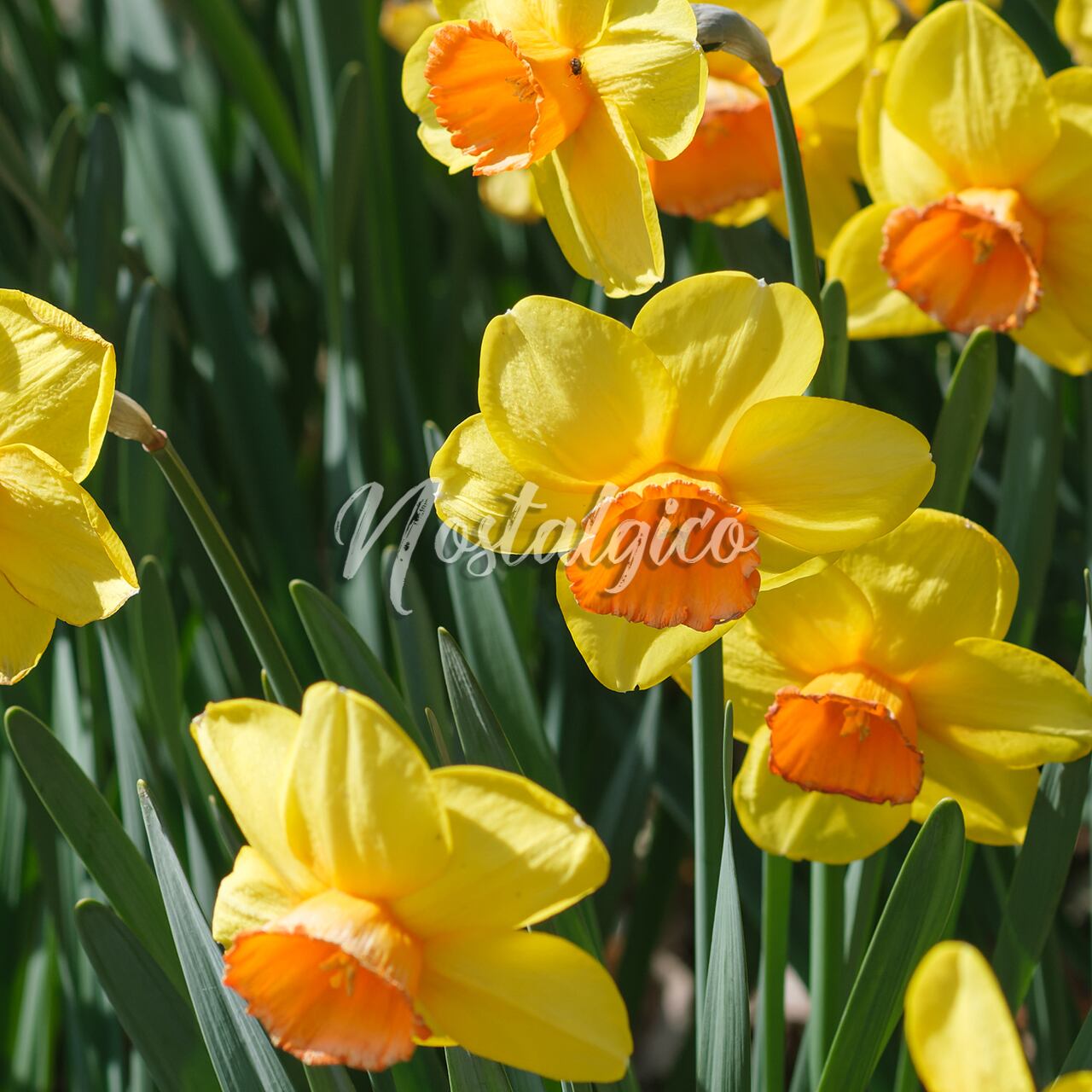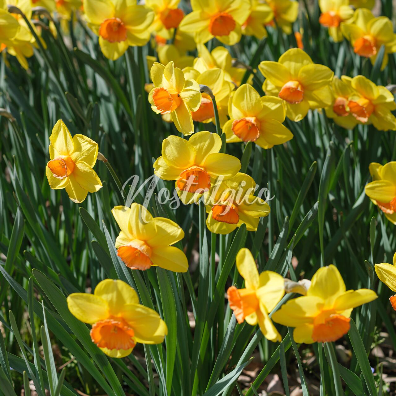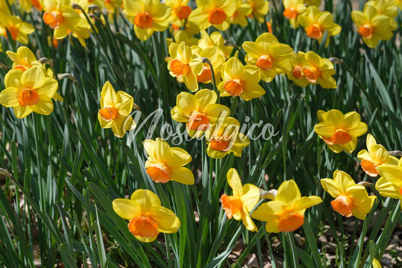 この写真は、美しい黄色いスイセンの花を公園で咲かせた様子を捉えたものです。明るく鮮やかな色合いのスイセンが、春の季節の到来を感じさせます。スイセンの深緑色の葉が黄色い花を一層鮮やかにしています。