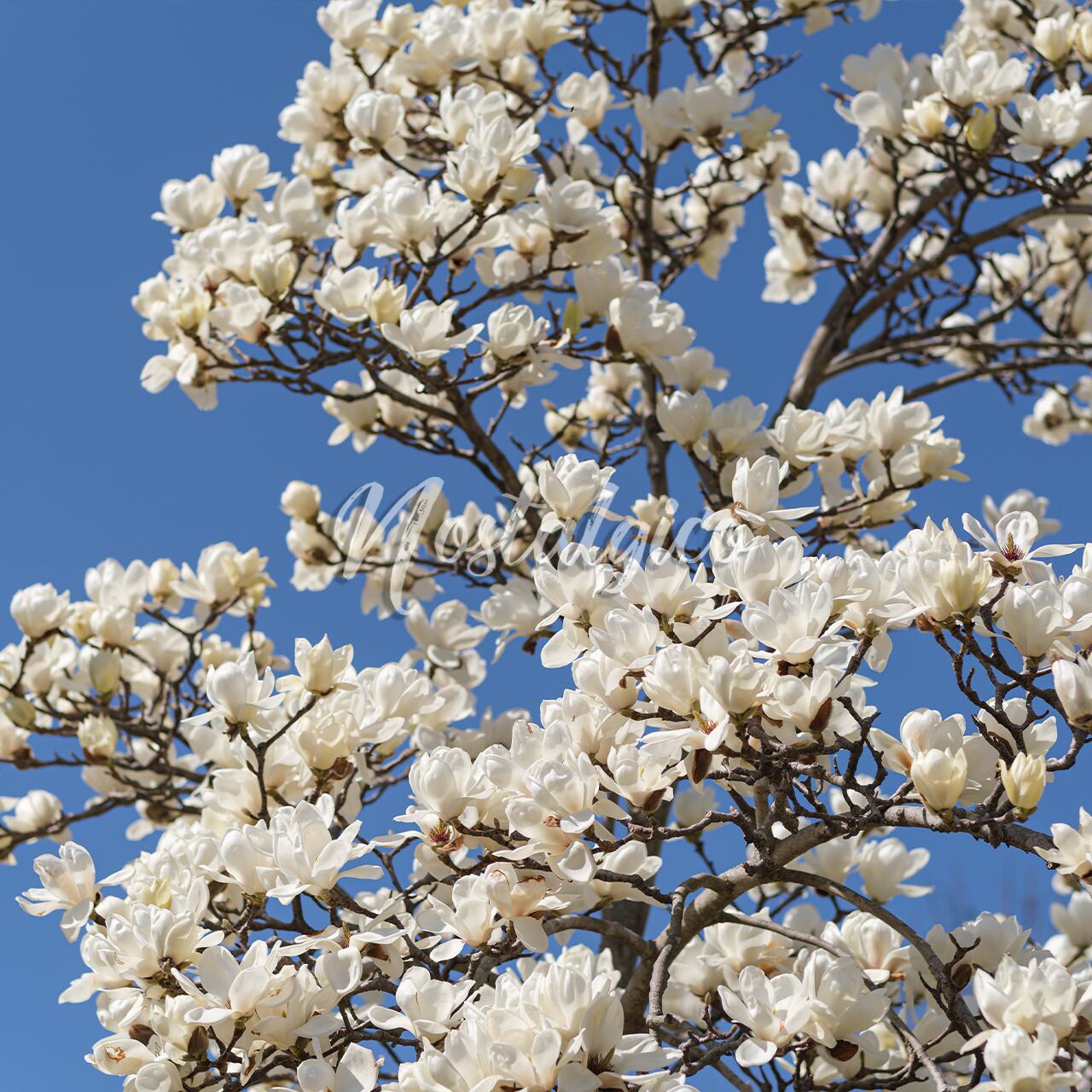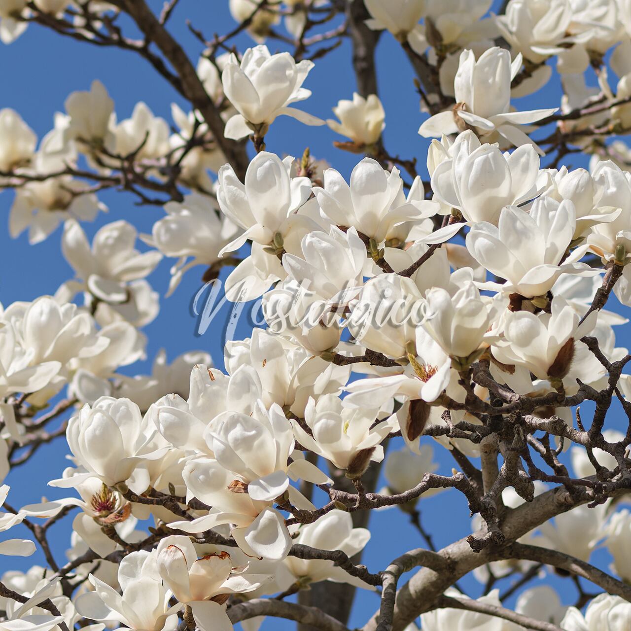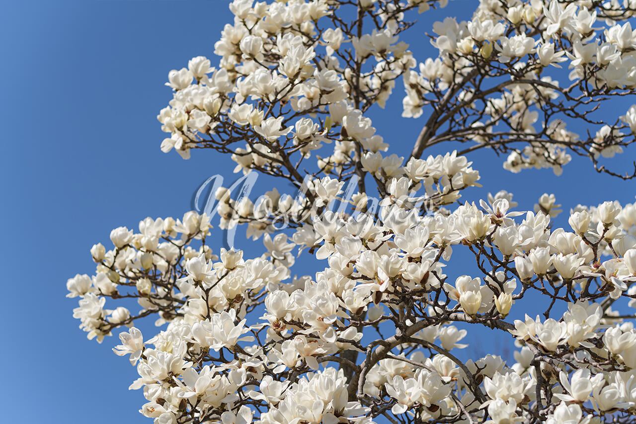 この写真素材では、華やかな白いハクモクレンが構図いっぱいに写っており、背景には青空が広がる春の季節を表現した高品質な画像です。