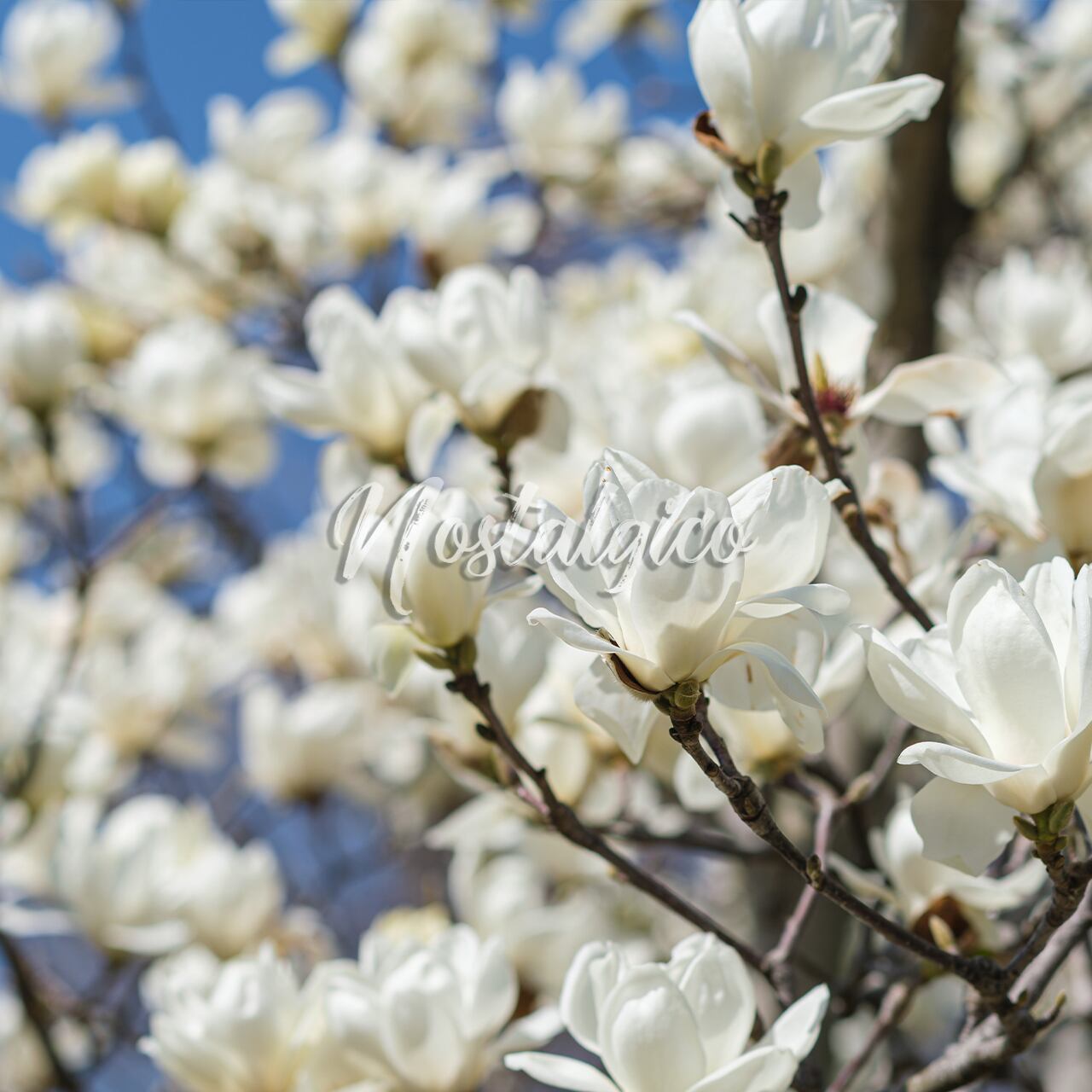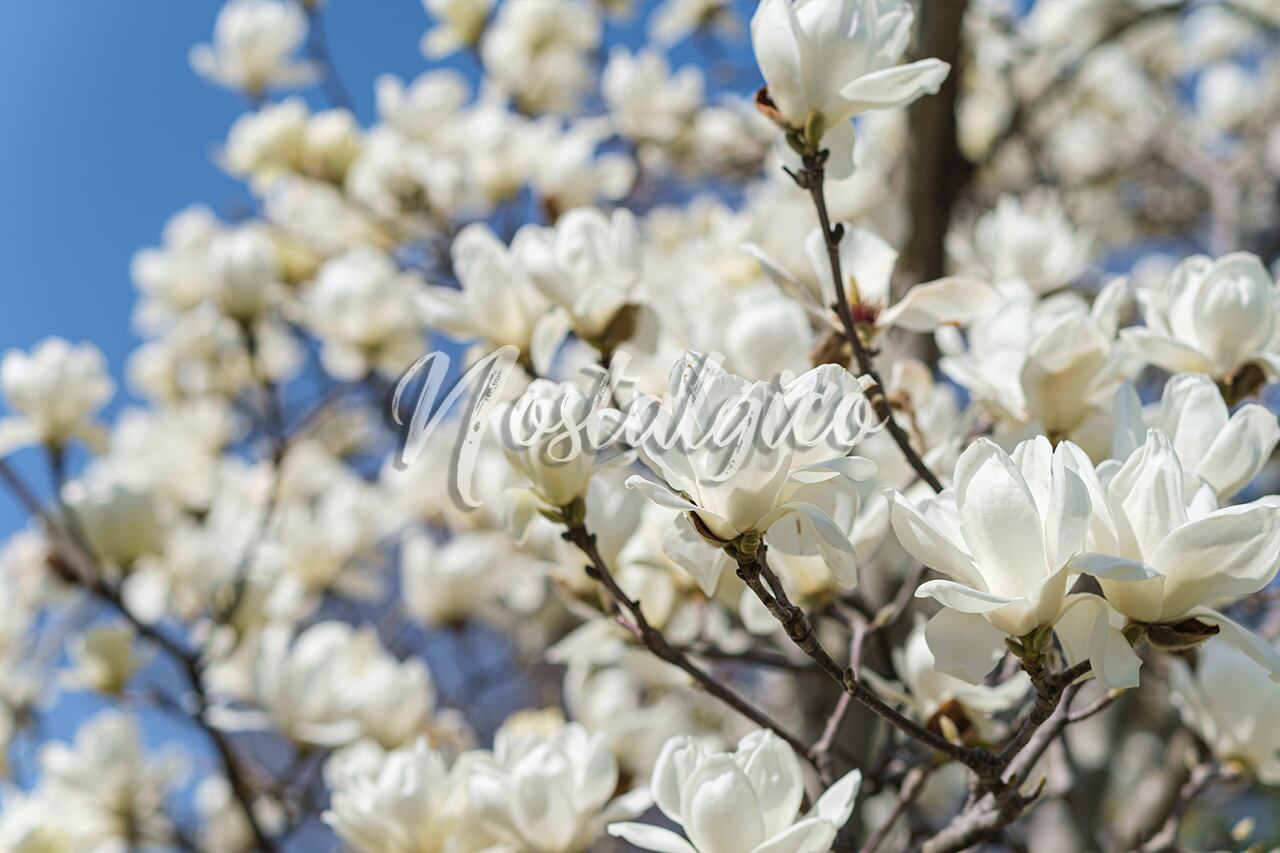 この写真素材では、華やかな白いハクモクレンが構図いっぱいに写っており、背景には青空が広がる春の季節を表現した高品質な画像です。