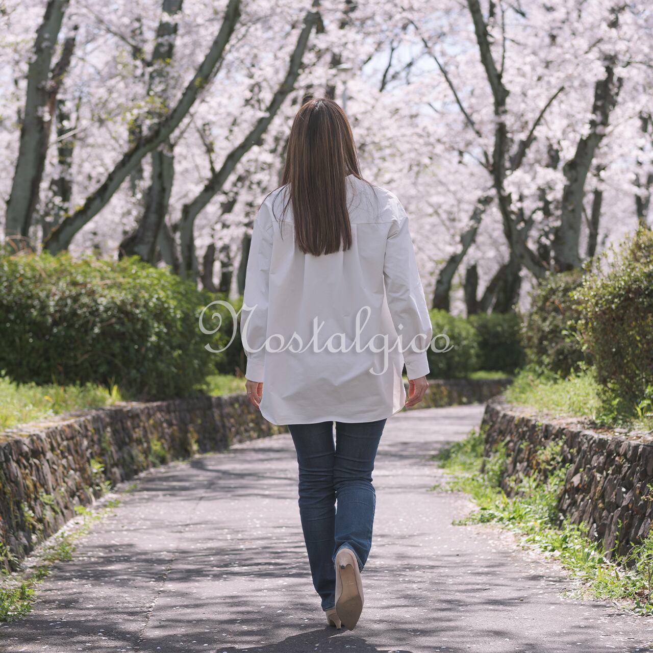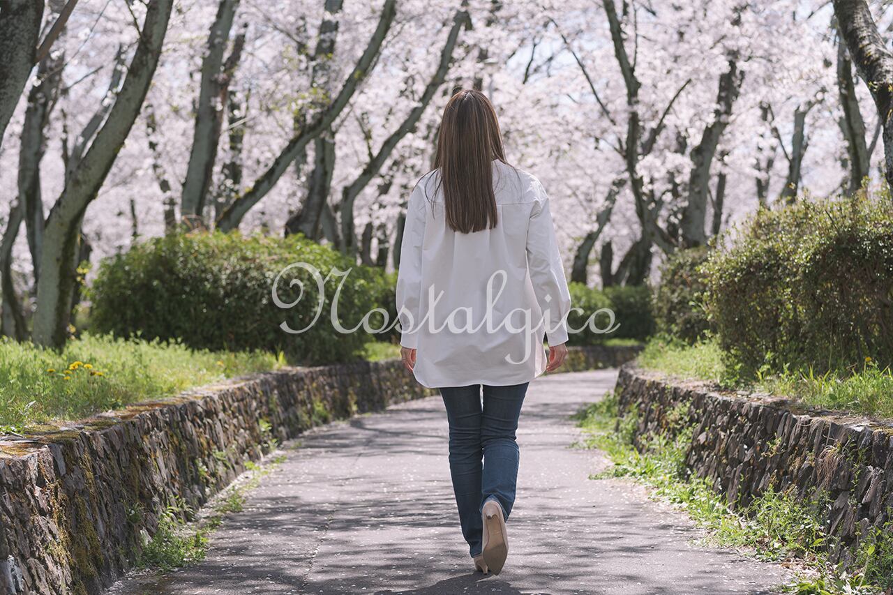 春の桜並木を歩く美しい女性の後ろ姿の写真です。春の桜並木は季節感あふれる美しい景色で、その美しさは見る人の心を和ませてくれます。真っ白のシャツを着た女性の後ろ姿は、清潔感や爽やかさを感じさせ、その人の美しさを際立たせます。そして、美しいロングヘアーは女性の魅力を引き出す重要な要素です。