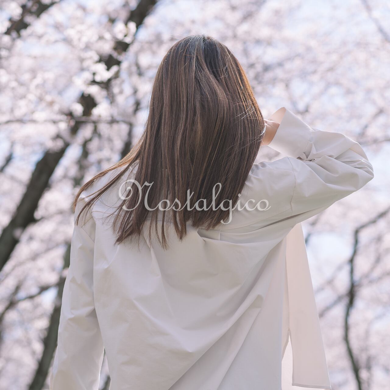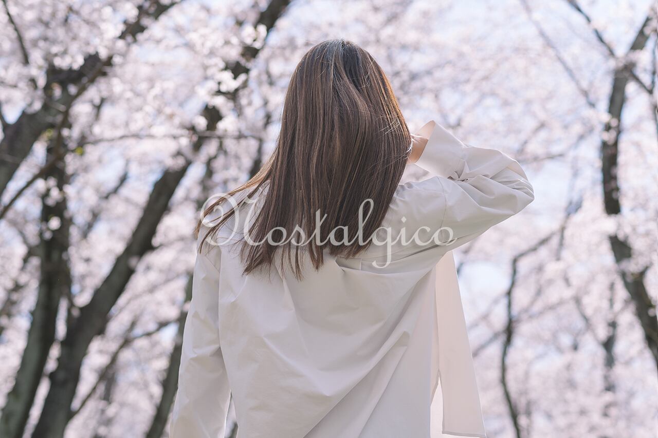 この写真素材には、春の桜が咲き誇る中、美しいロングヘアの女性が後ろ姿で写っています。女性の髪には、ハイライトカラーが入っており、春の優しいそよ風に揺らめく様子が美しく表現されています。女性が手で髪をフワッとさせる仕草は、風に吹かれている様子を更に印象づけます。女性が着ている真っ白なシャツは、清潔感と爽やかさを表現しています。風に吹かれる髪の毛とのコントラストが鮮やかで、春の雰囲気を更に引き立たせます。
