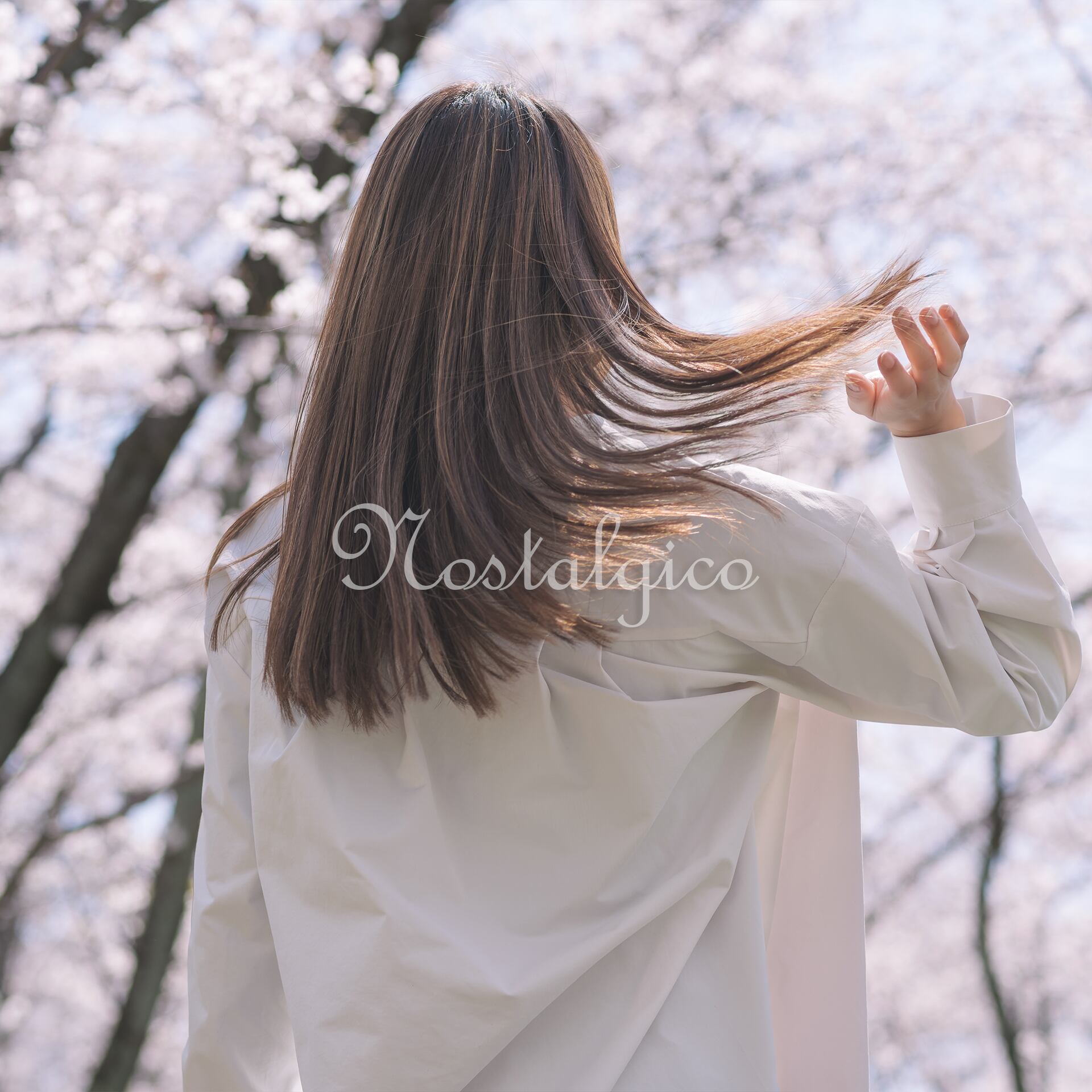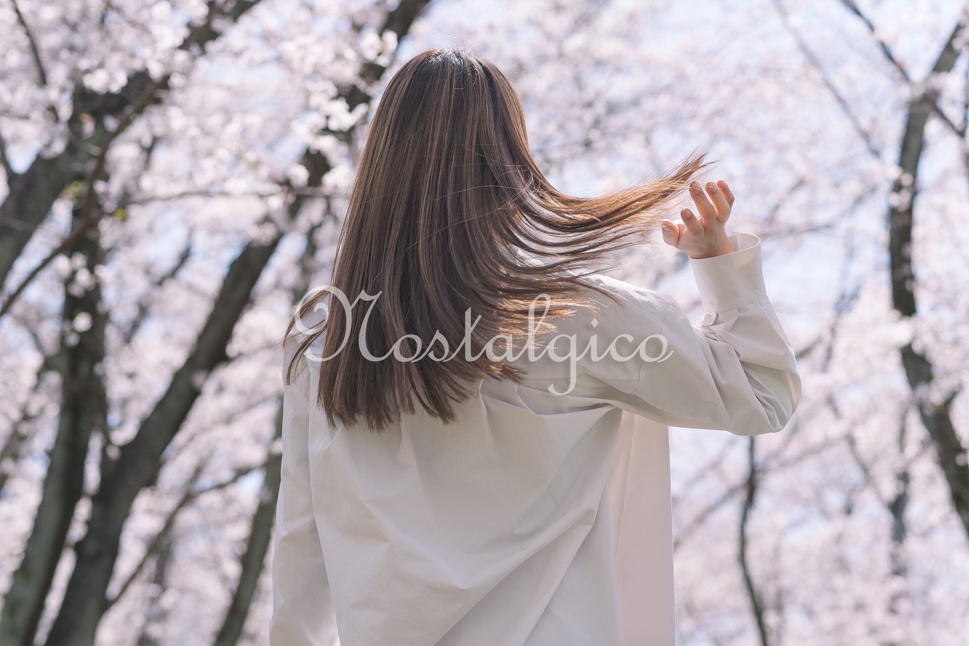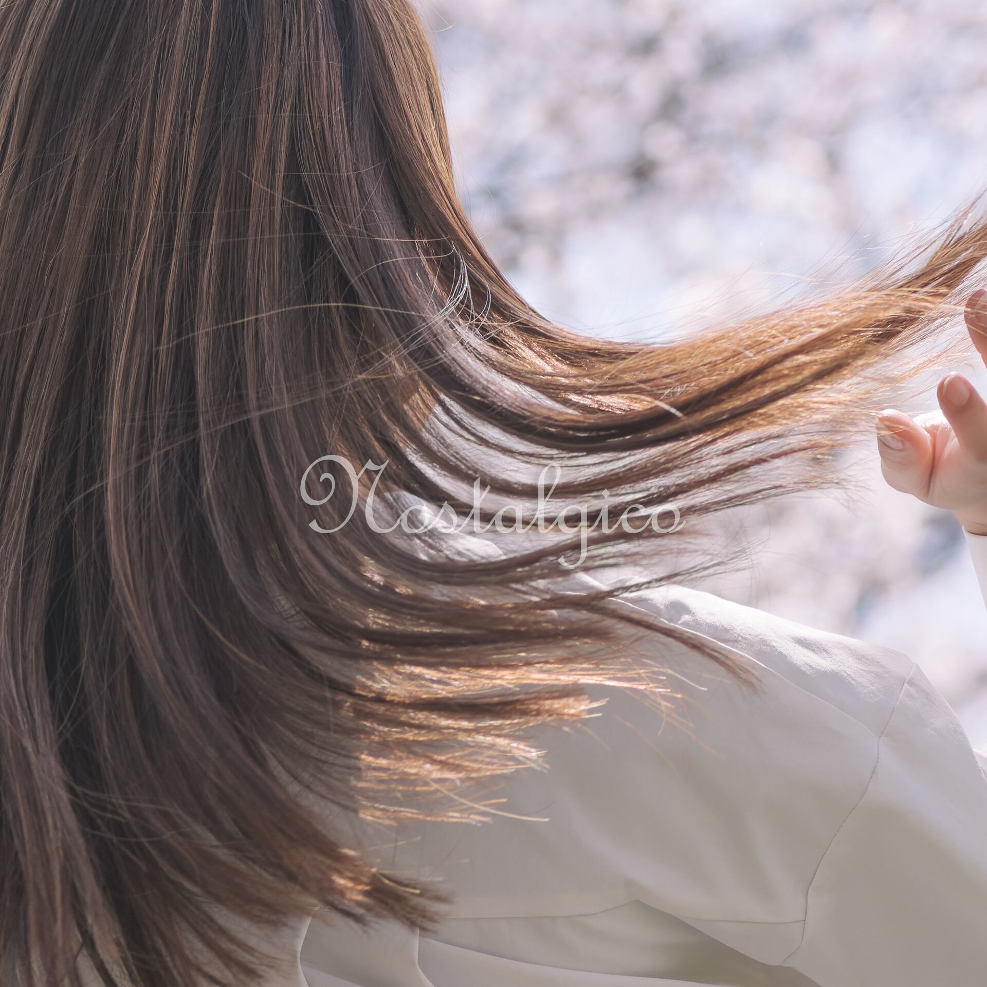 この写真素材は、春の桜の花をバックにした美しいロングヘアの女性の後ろ姿です。髪の毛にはハイライトカラーが入っているため、髪の流れが際立ち、立体感があります。また手で髪をフワッとさせることで、髪の柔らかさや自然な動きが表現されています。髪の毛一本一本が鮮明に映っているため、細部までこだわった高品質な仕上がりとなっています。シンプルな白シャツも、清潔感と爽やかさを感じさせ、女性の美しさを一層引き立たせています。