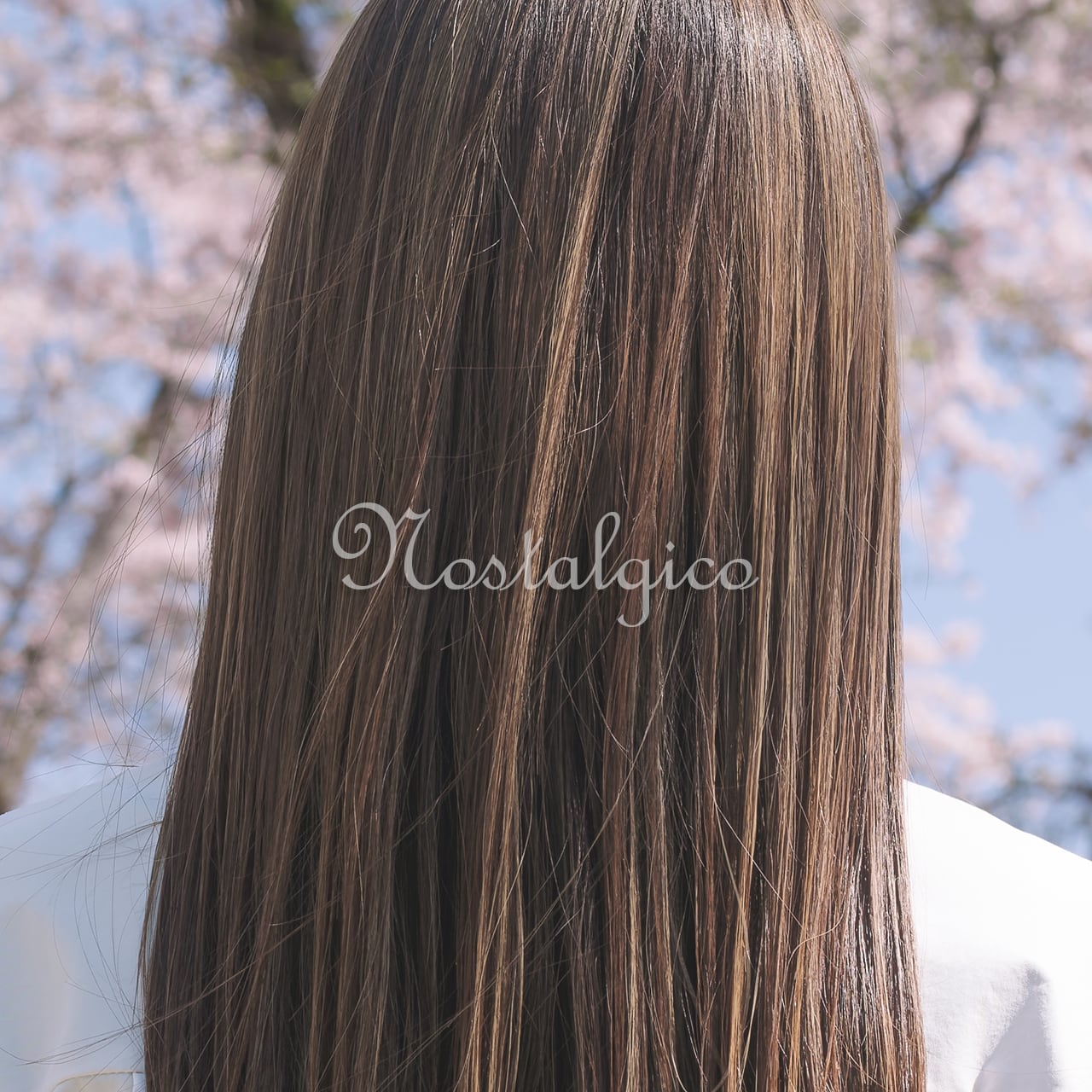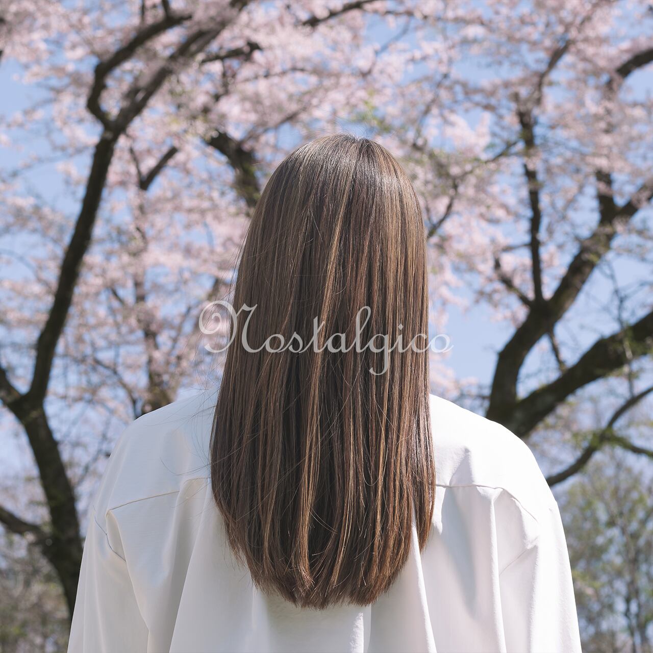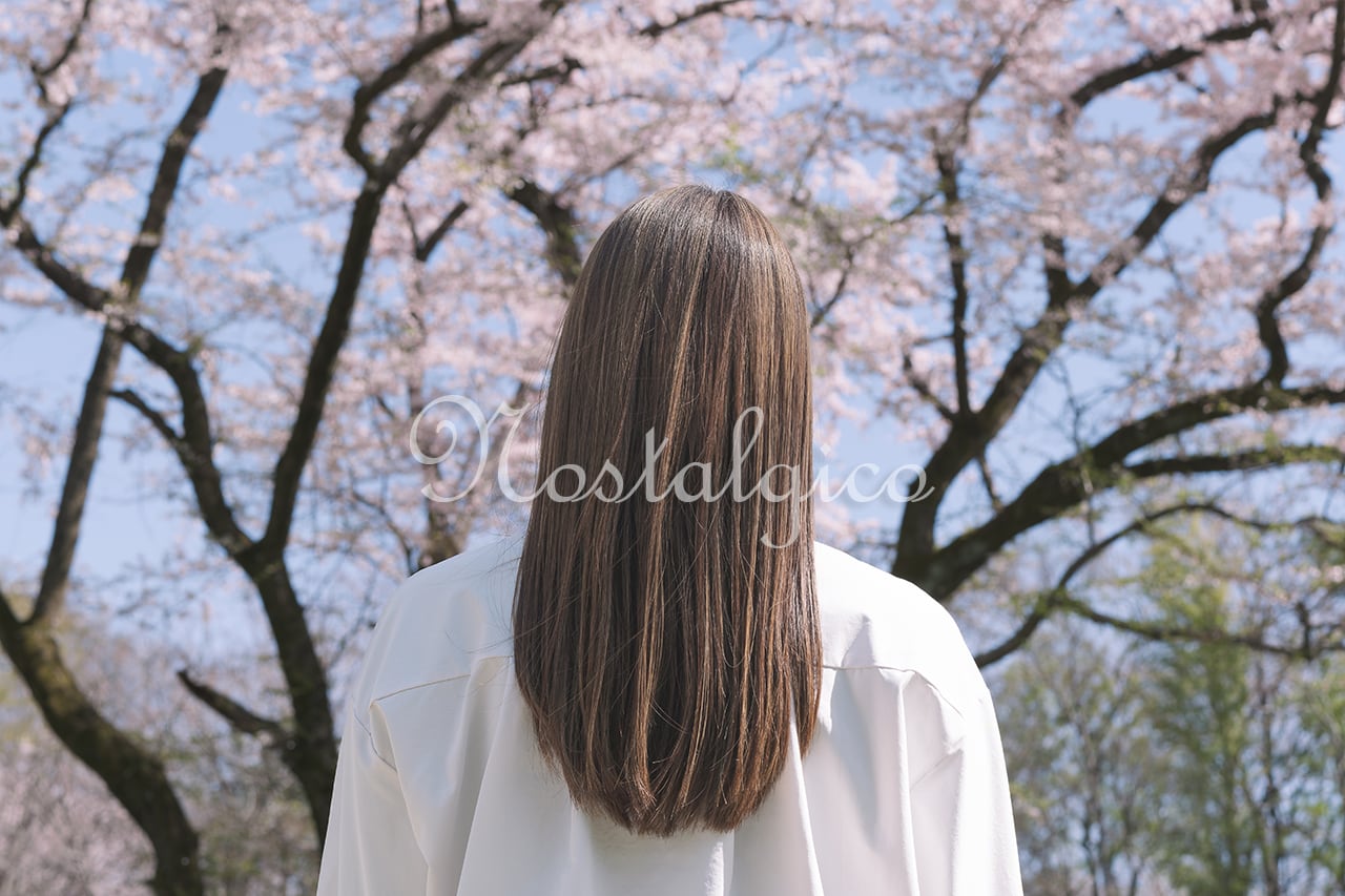桜と春の陽光に輝く艶髪ロングヘアの女性