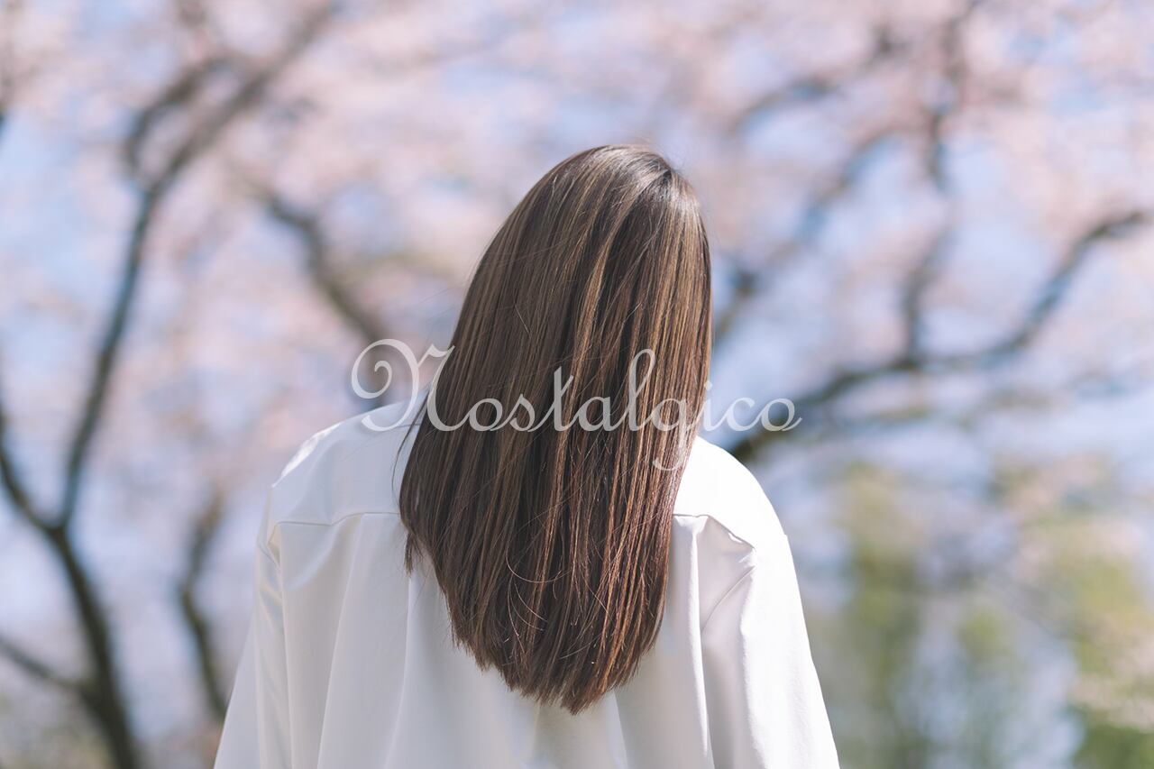 桜と春の陽光に輝く艶髪ロングヘアの女性