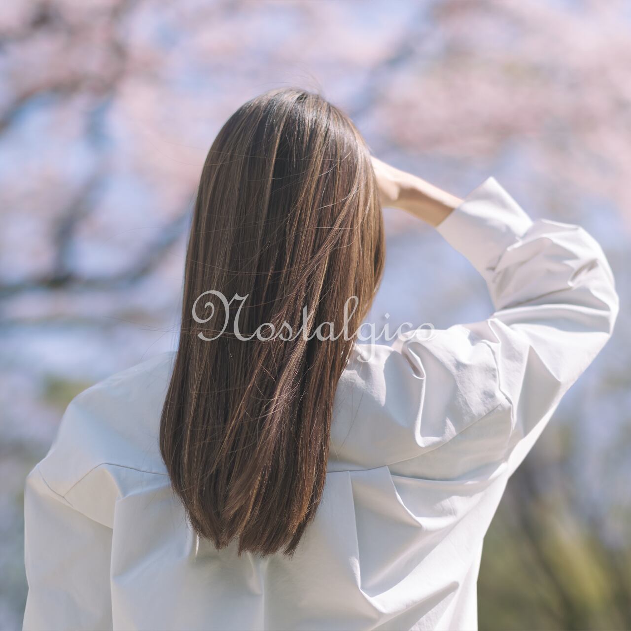 この写真は、美しい桜の木の下で撮影された、春らしい優雅な雰囲気が漂う一枚です。女性のロングヘアが風に揺れ、桜の花びらが陽光に輝いています。