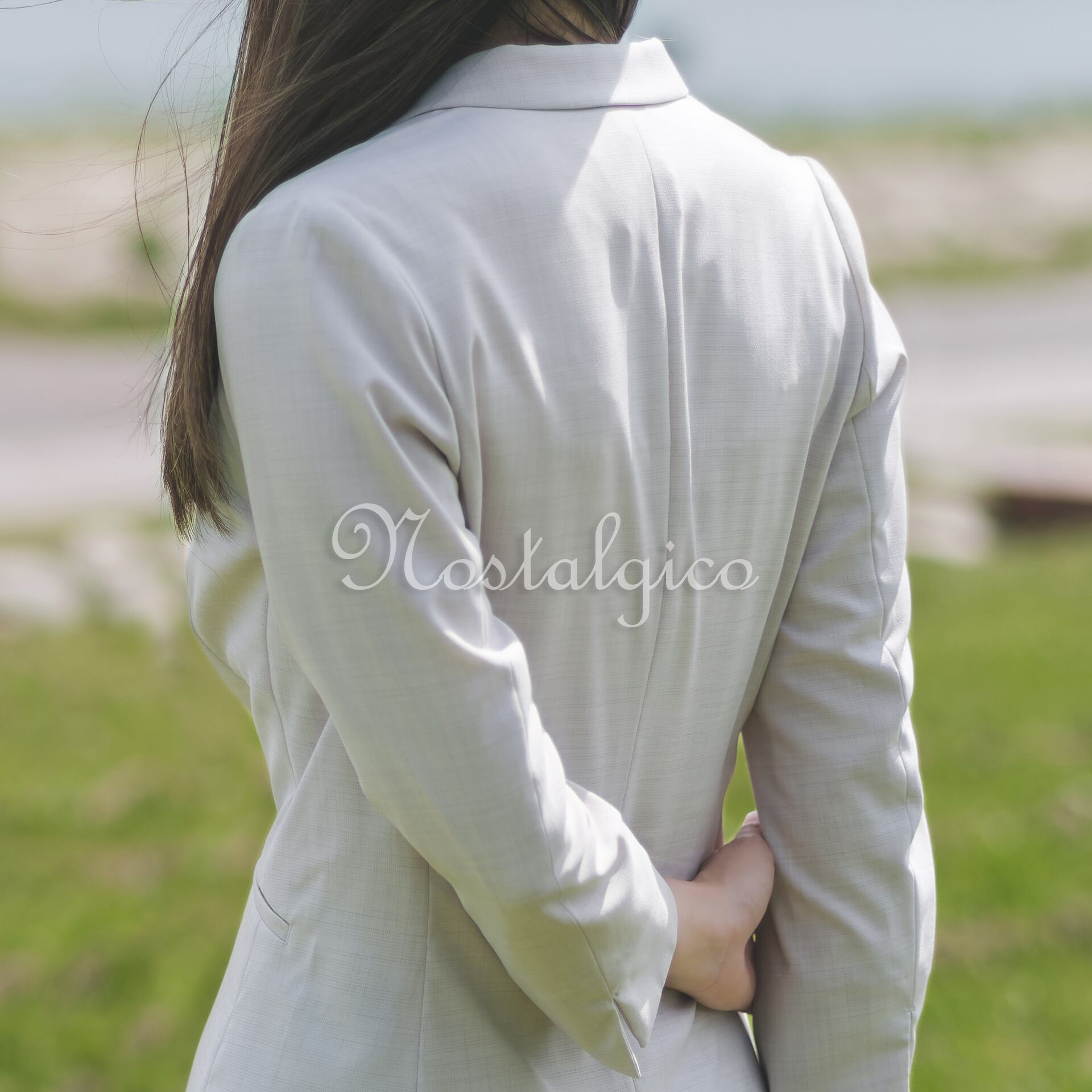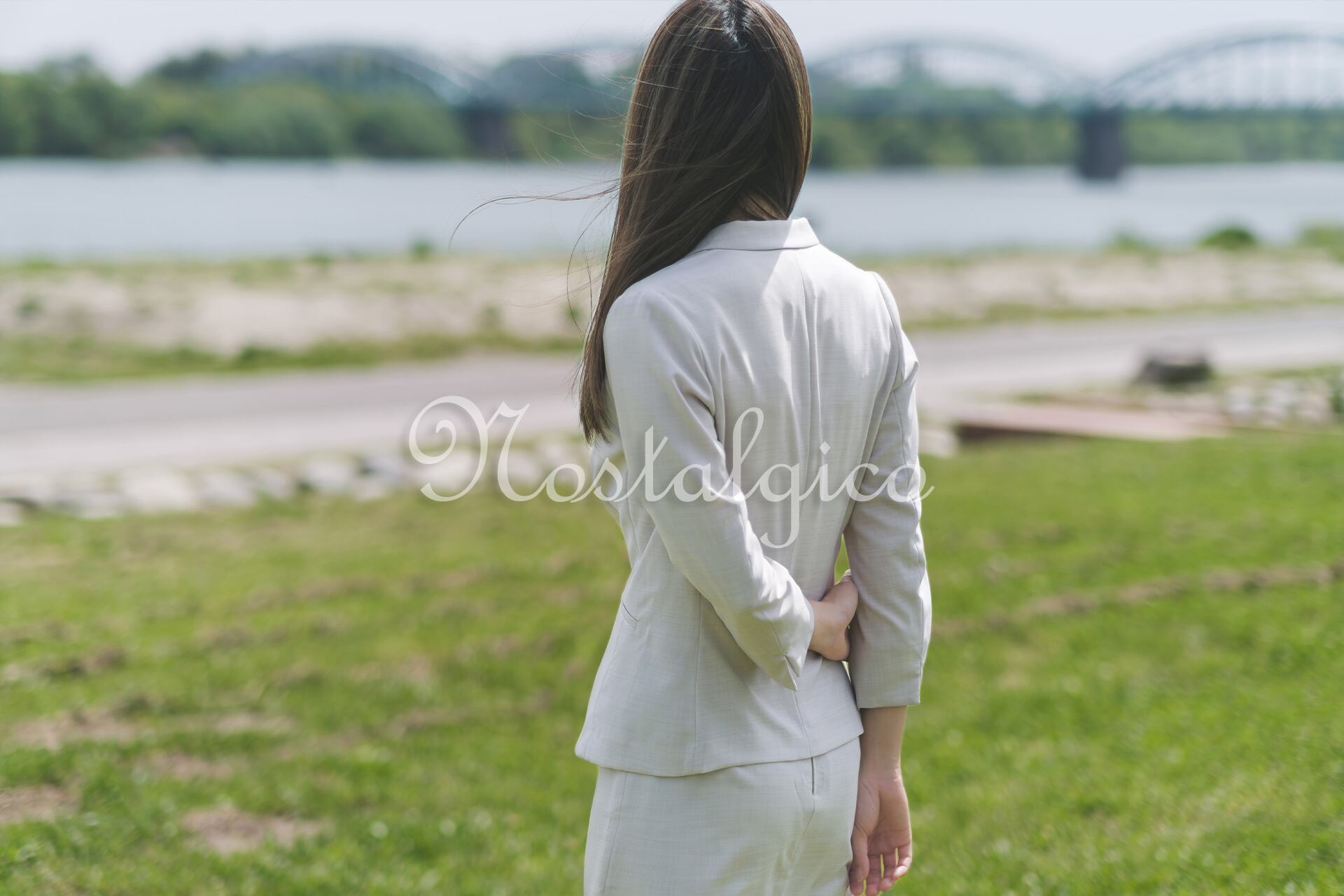 白いレディーススーツを身にまとった女性の写真素材です。川のそばの公園でちょっと一息ついている女性です。オフィスを出て、外の新鮮な空気を吸って、太陽の光を浴びるだけで気分転換になりますよね。