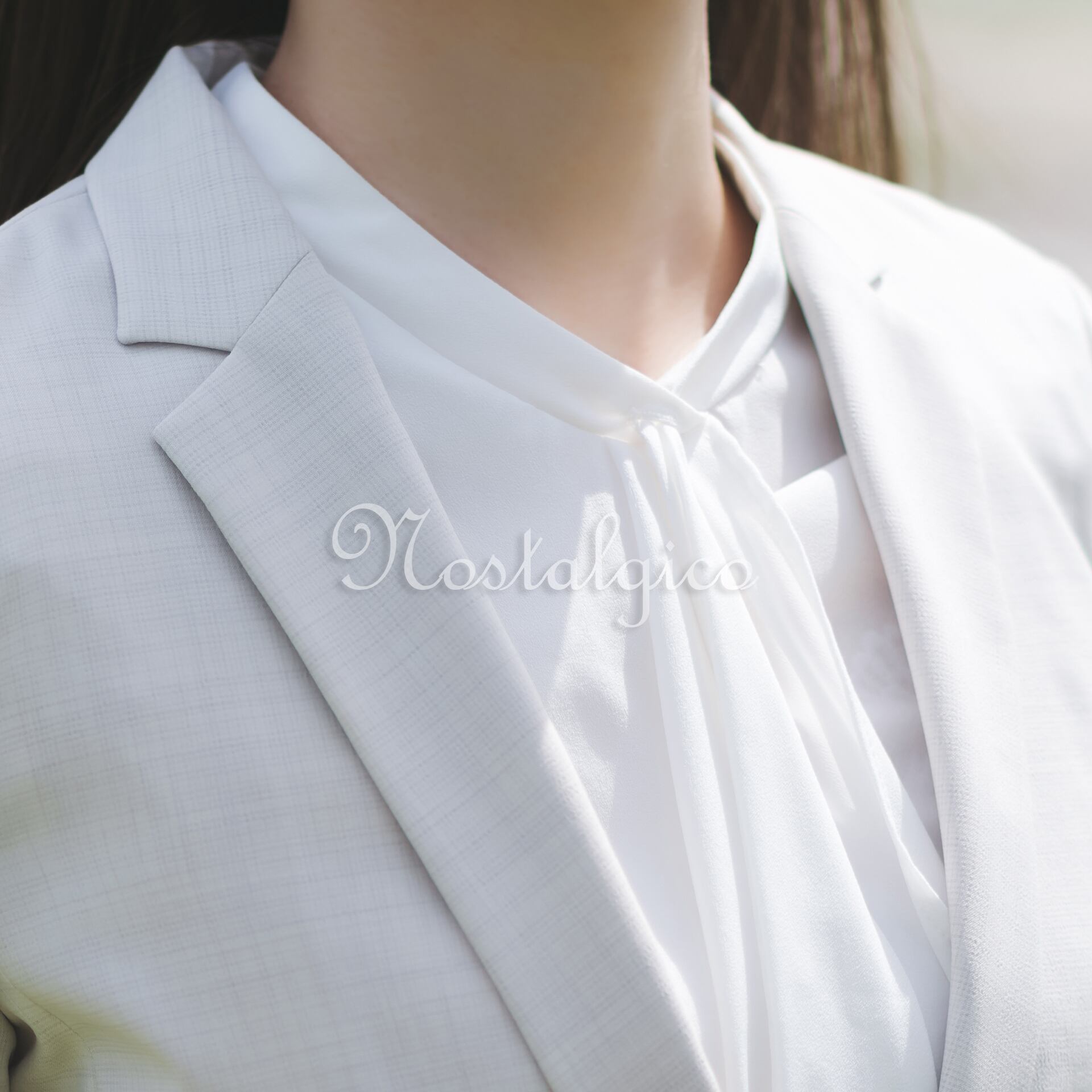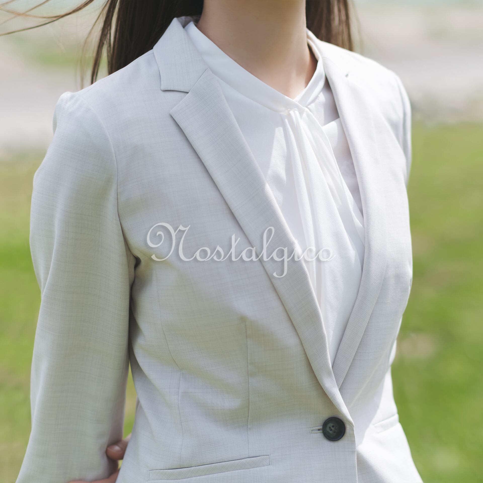 白いレディーススーツを身にまとった女性の写真素材です。オフィスを出て、外の新鮮な空気を吸って、太陽の光を浴びるだけで気分転換になりますよね。