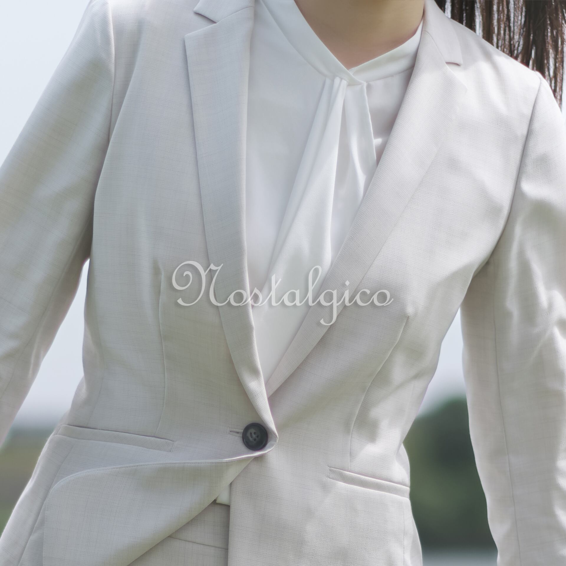 白いレディーススーツを身にまとった女性の写真素材です。オフィスを出て、外の新鮮な空気を吸って、太陽の光を浴びるだけで気分転換になりますよね。